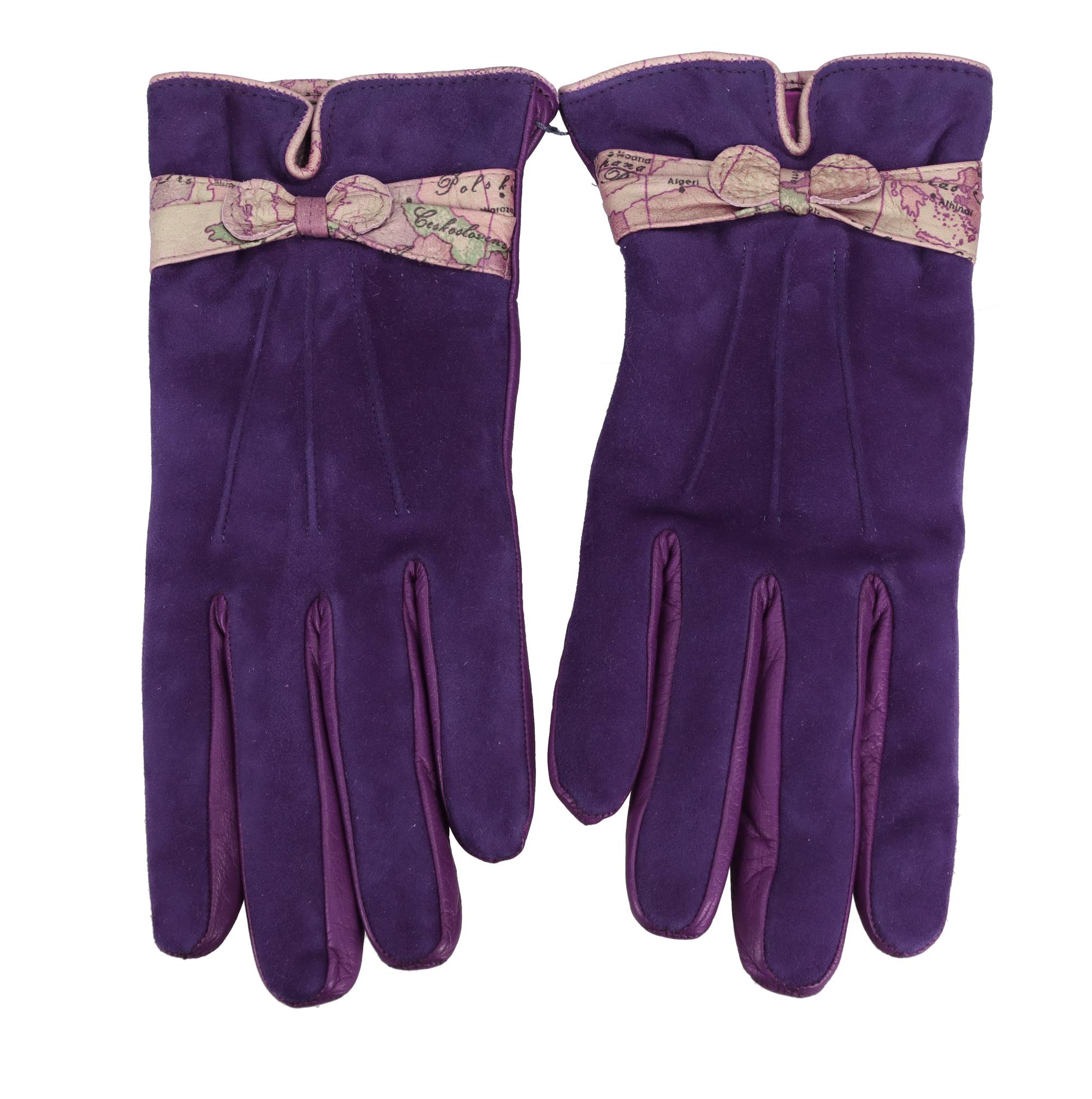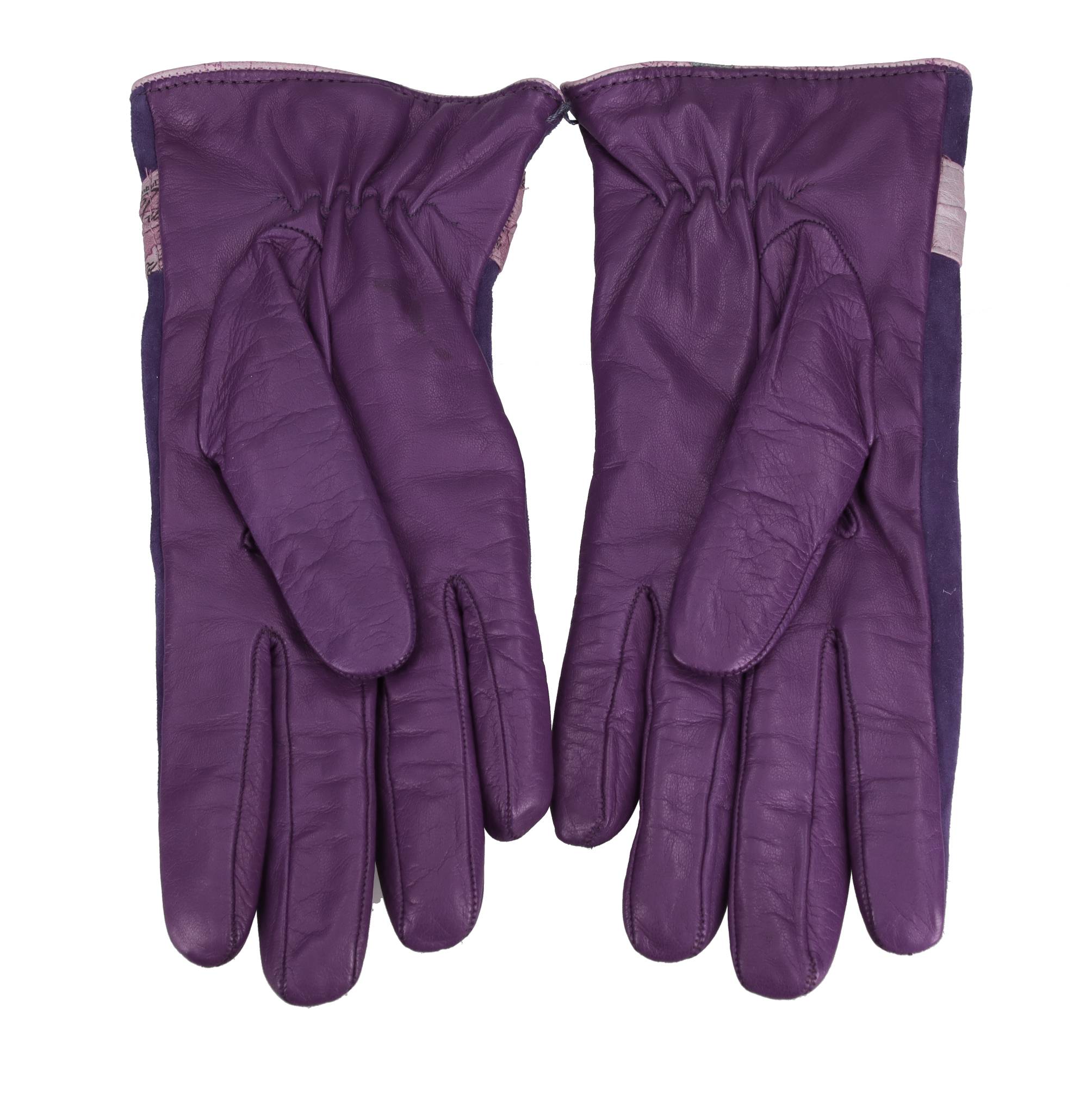 Nappa leather and suede gloves. Size: 7.5. Inner lining: 100% wool knit. Shipped in a transparent bag. The Geo Classic print leather band is warmer in colour than shown in the photo.