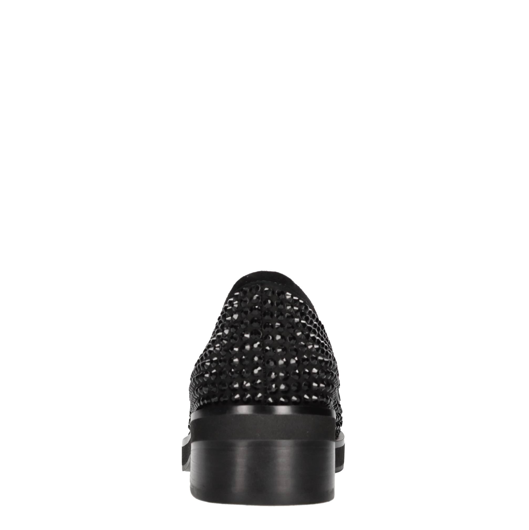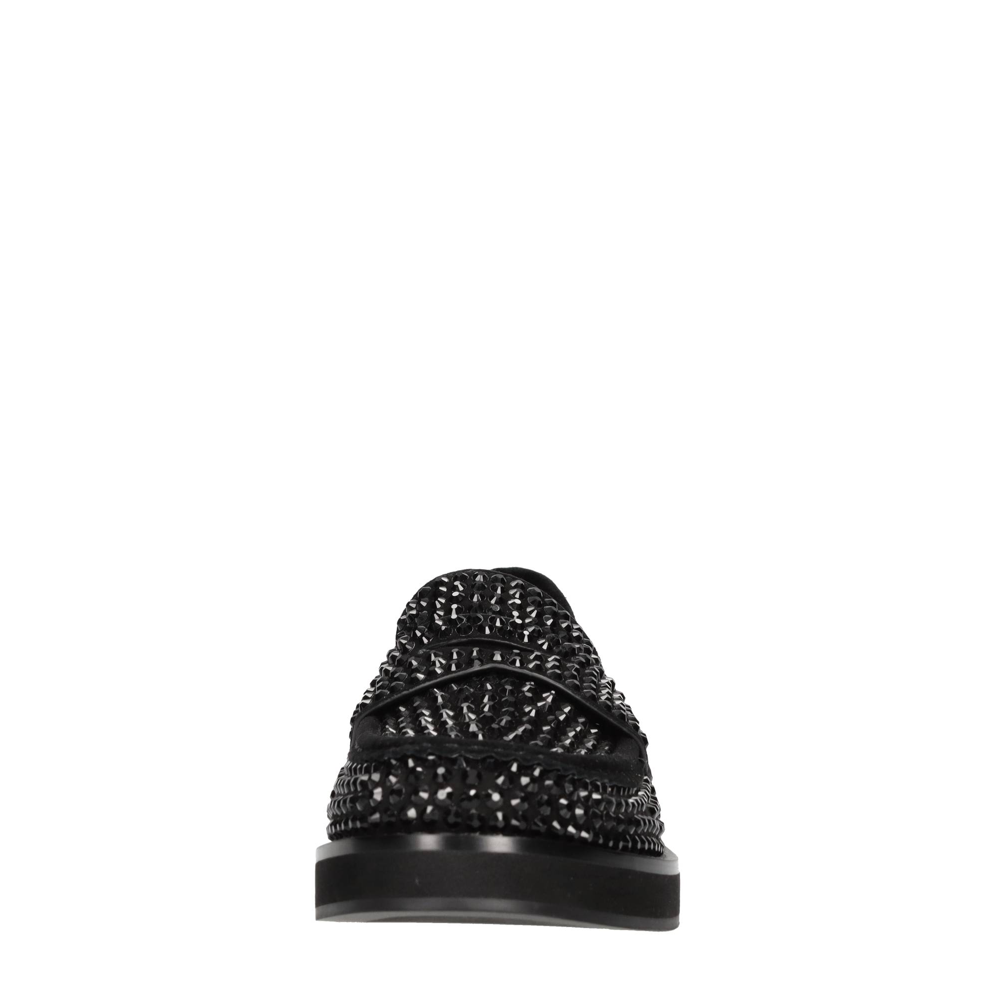 Fabric and rhinestone moccasins. Leather inner upper. Rubber outer sole.
