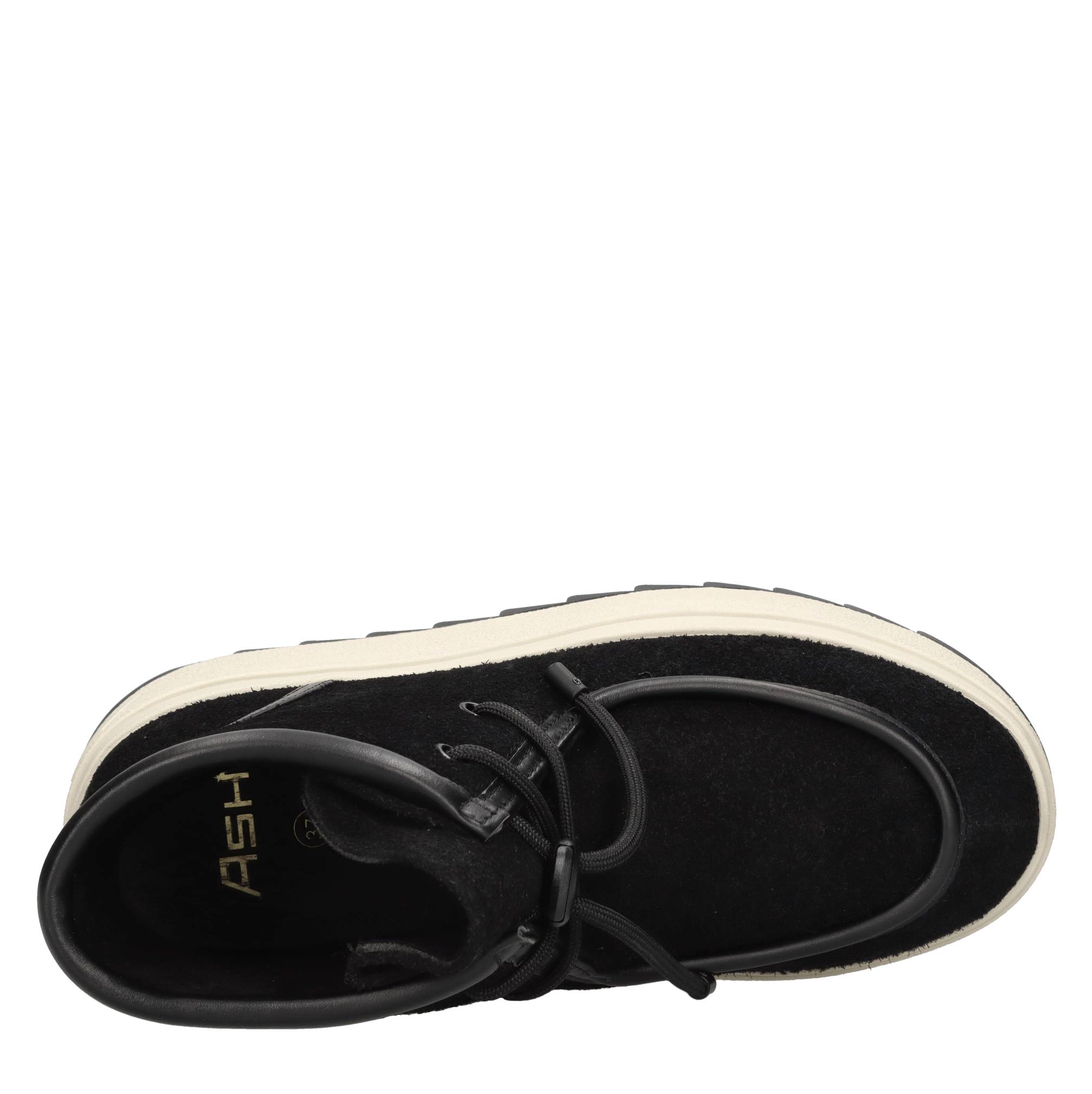 Suede ankle boots. Leather and fabric upper. Rubber outsole.