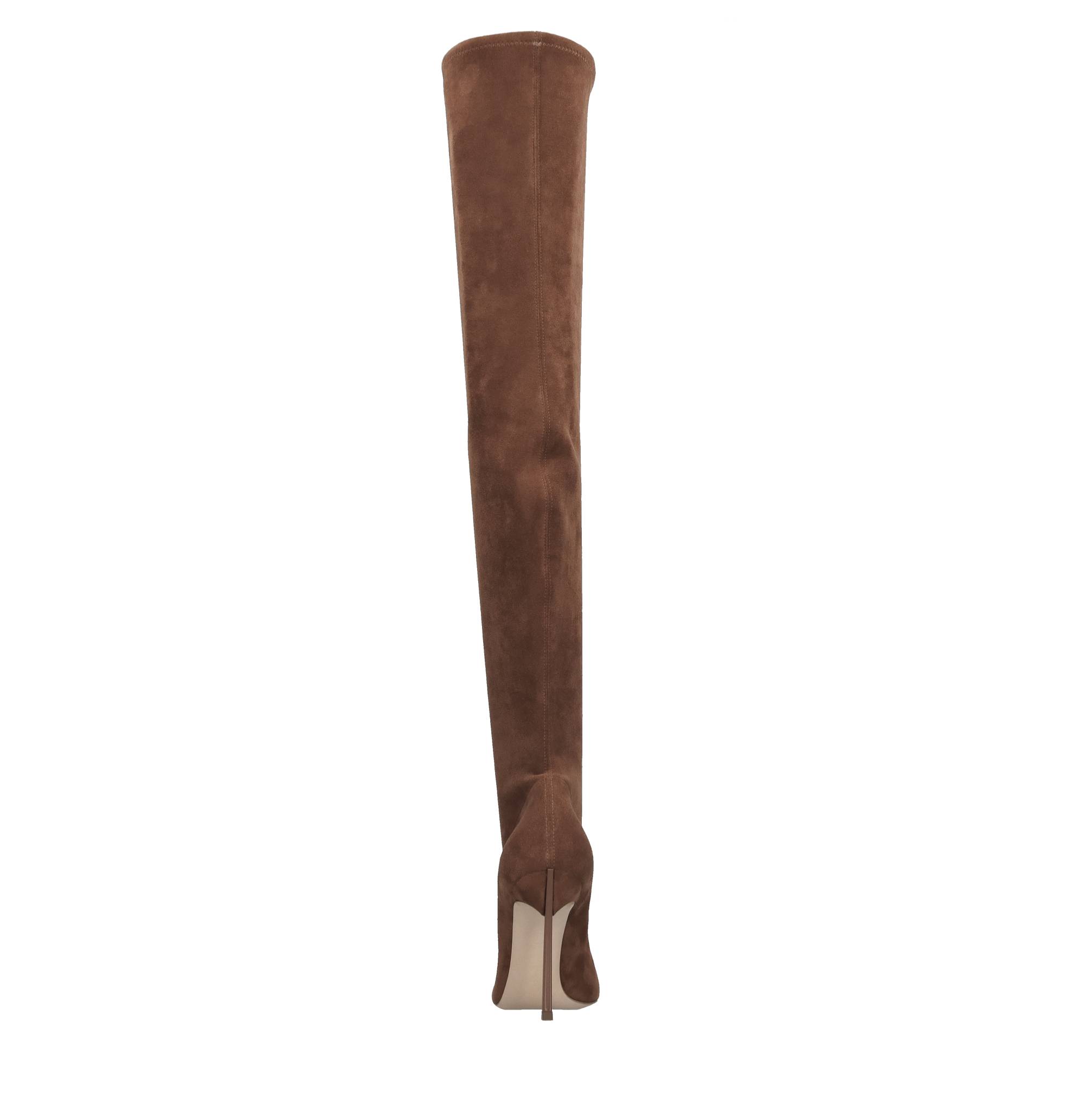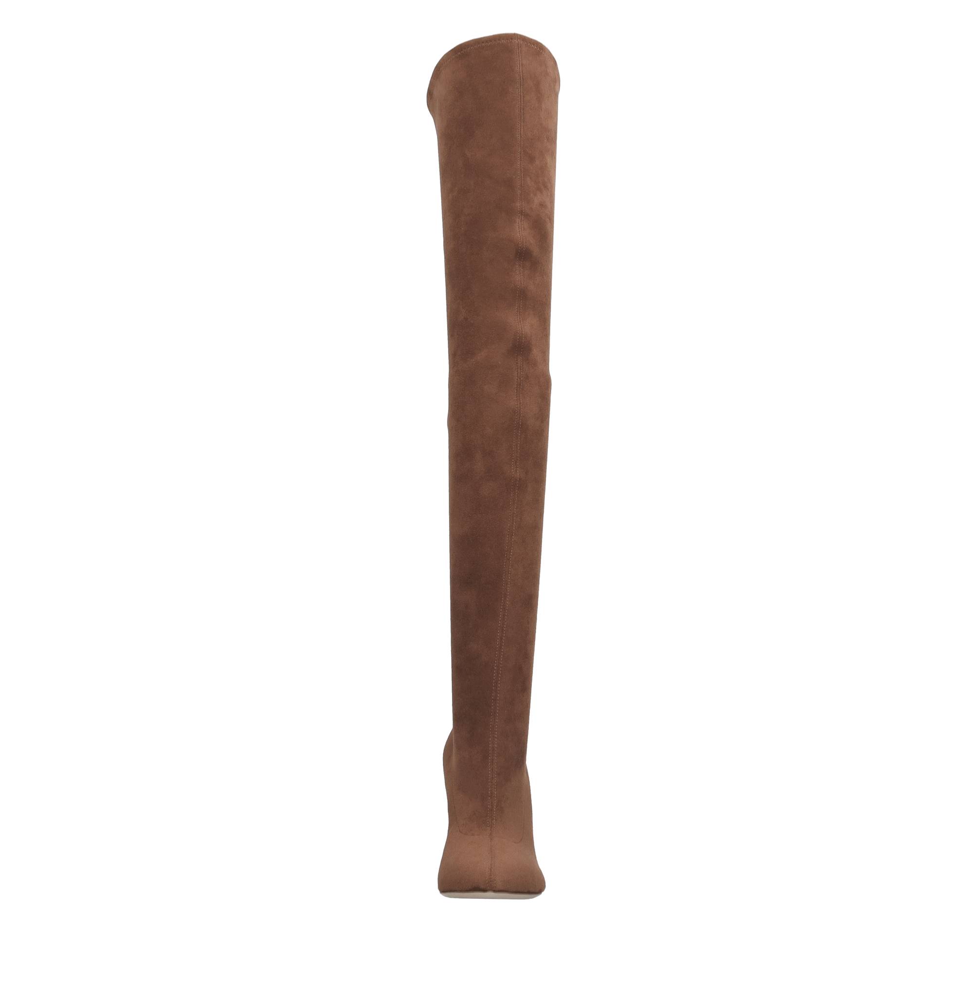 Blade thigh-high boots in stretch eco-suede. Inner upper in stretch fabric and leather. Leather sole. Samples shipped in a plain box. We do not recommend applying protective rubber to the sole. Doing so alters the balance of the shoe and may cause the heel to break. Any repairs to damage caused by this modification will be at the customer's expense.