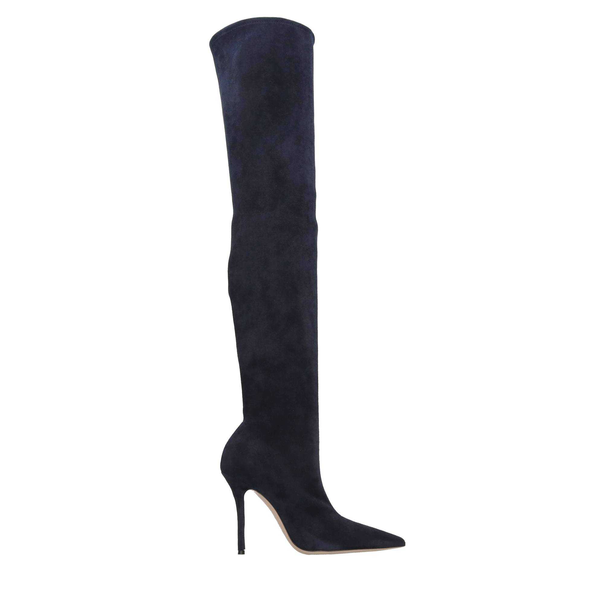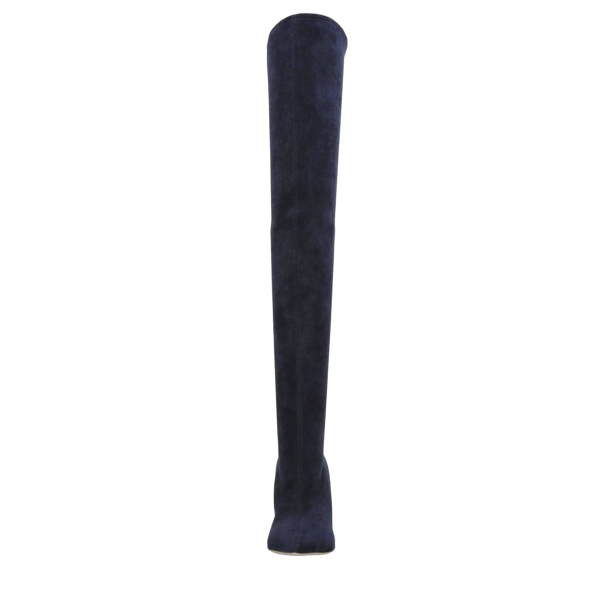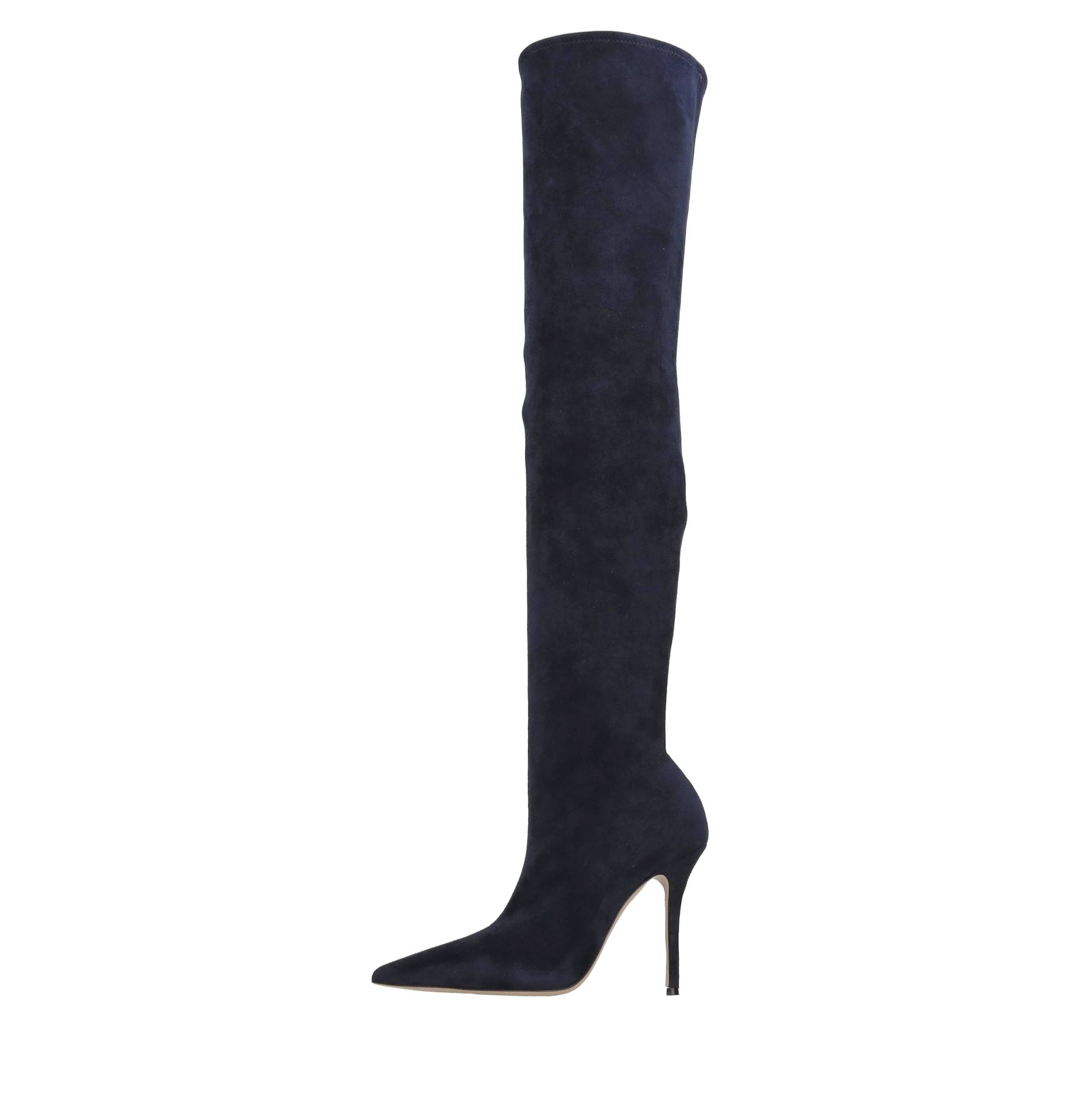Cuissard boots in stretch eco-suede. Inner upper in stretch fabric and leather. Leather sole. Samples shipped in a plain box. We do not recommend applying protective rubber to the sole. Doing so alters the balance of the shoe and may cause the heel to break. Any repairs to damage caused by this modification will be at the customer's expense.