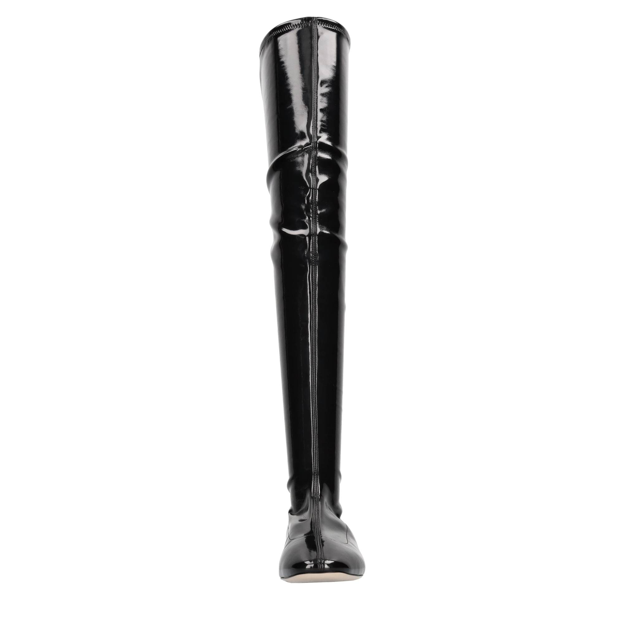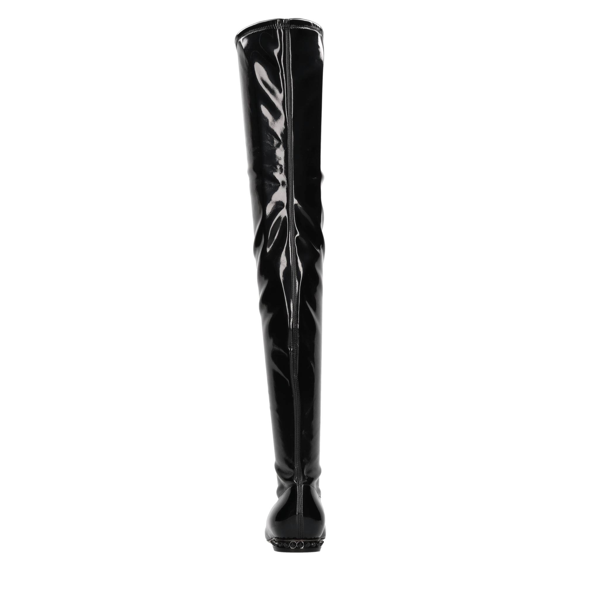 Galaxy cuissard boots in shiny faux leather with studded heel. Inner upper in stretch fabric and leather. Leather sole. Sample, shipped in a plain box.