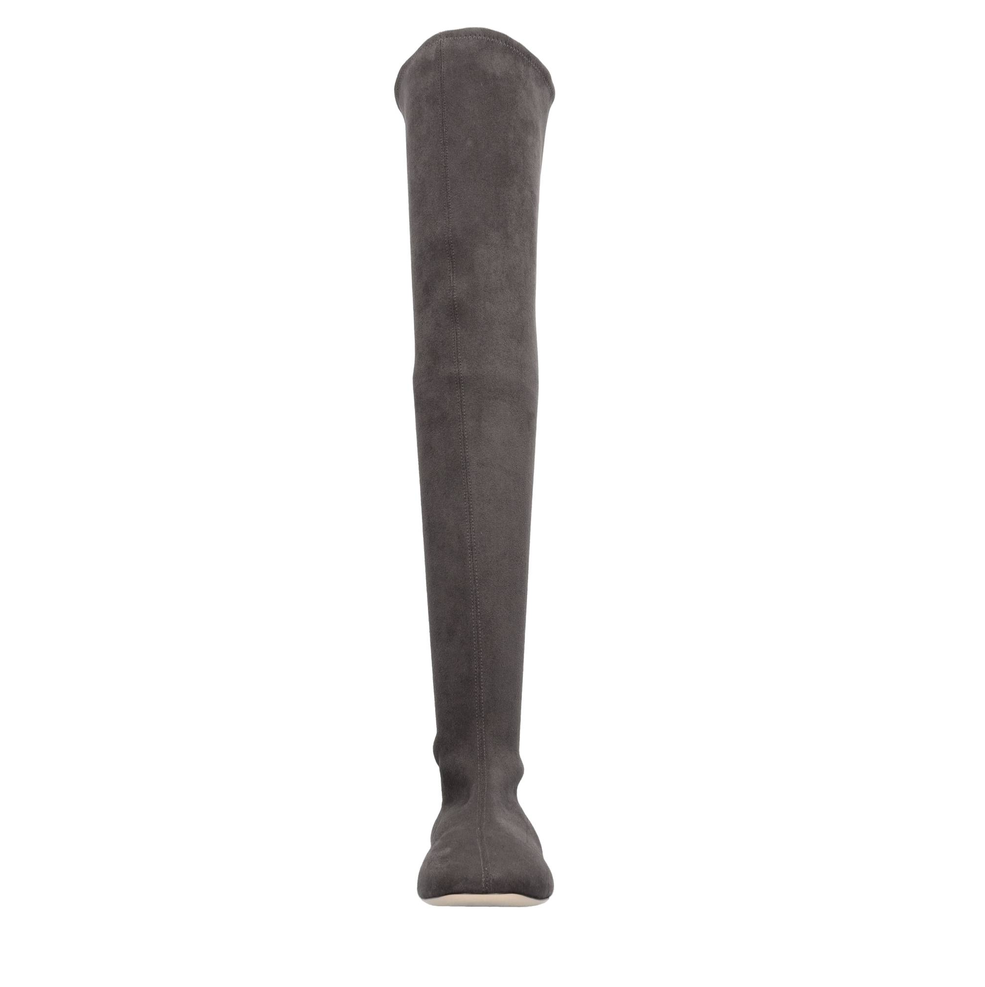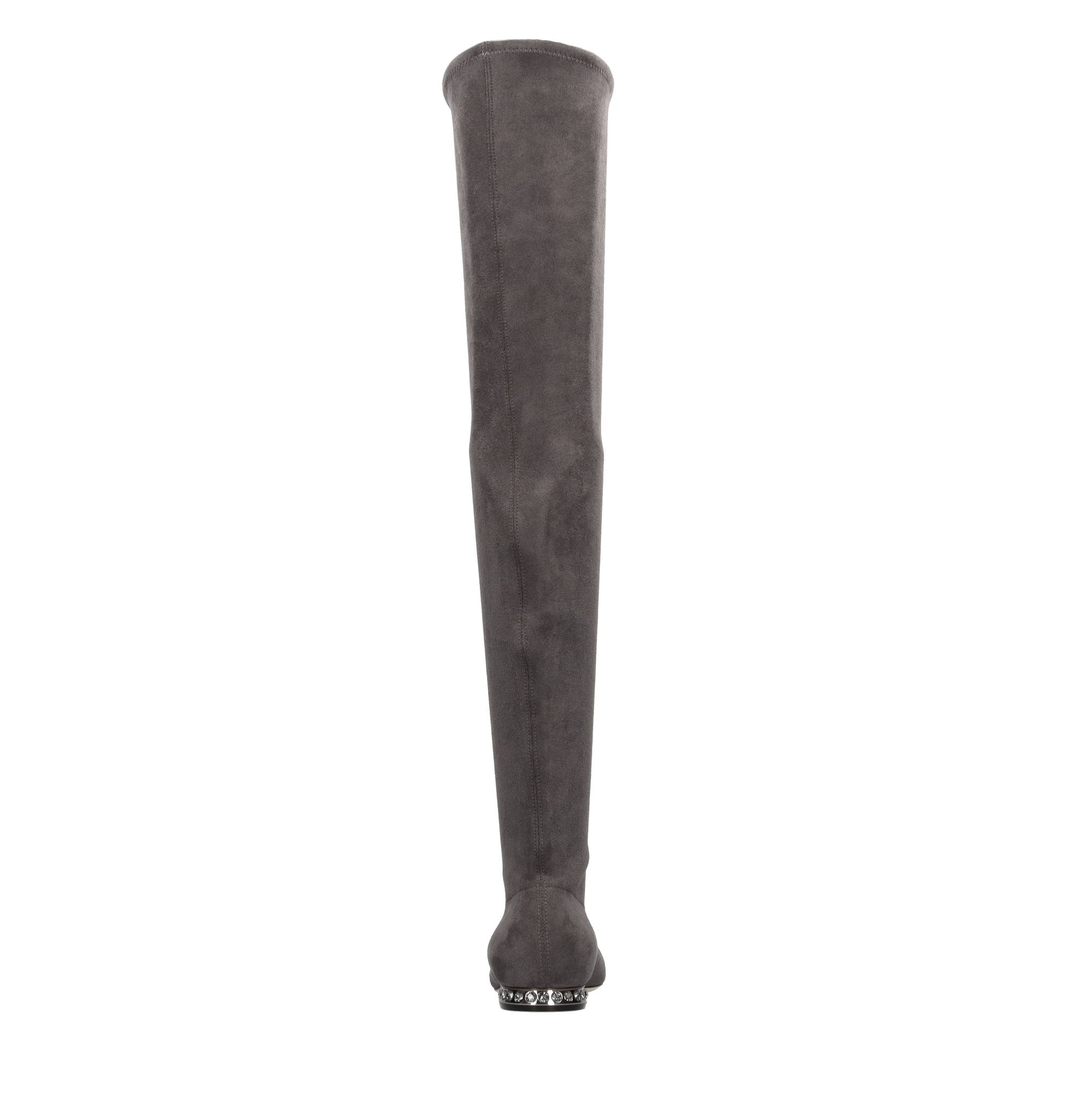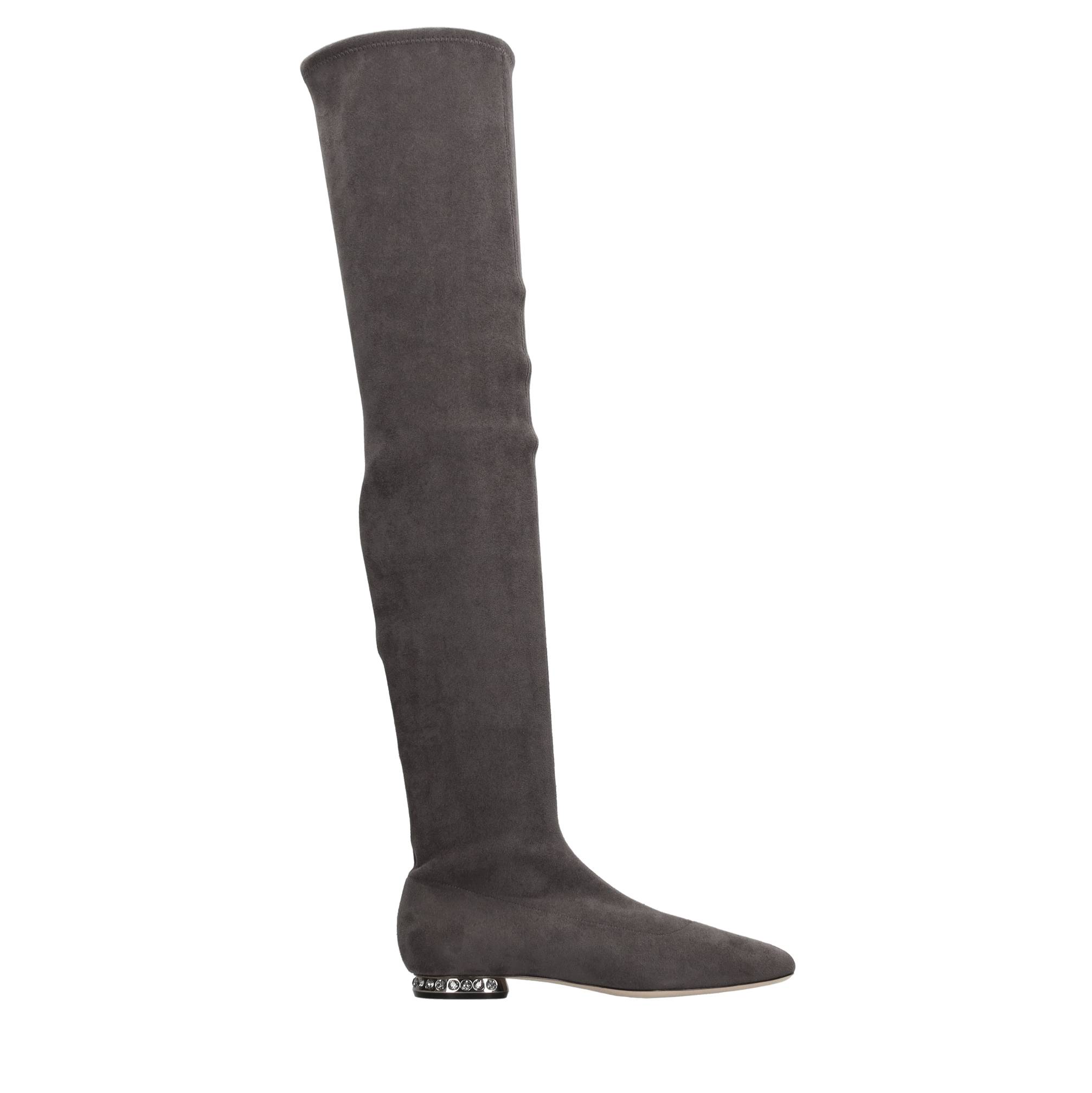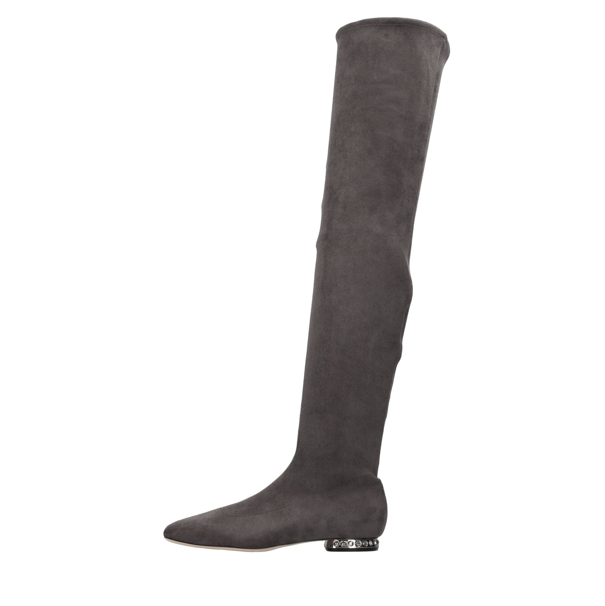 Galaxy eco-suede cuissard boots with heels embellished with rhinestones. Inner upper in stretch fabric and leather. Leather sole. Samples shipped in a plain box.