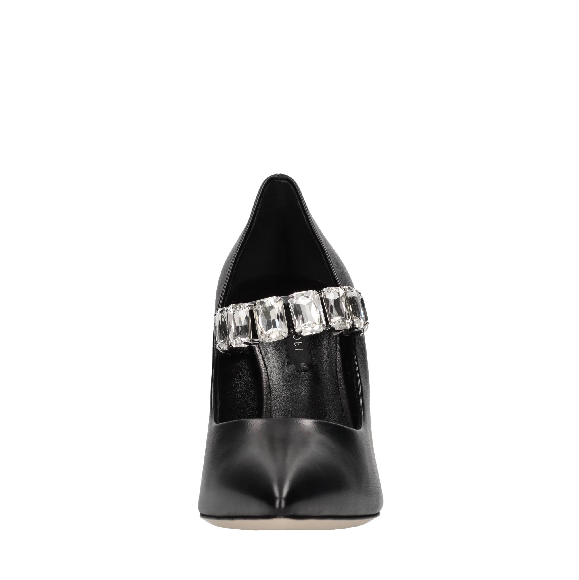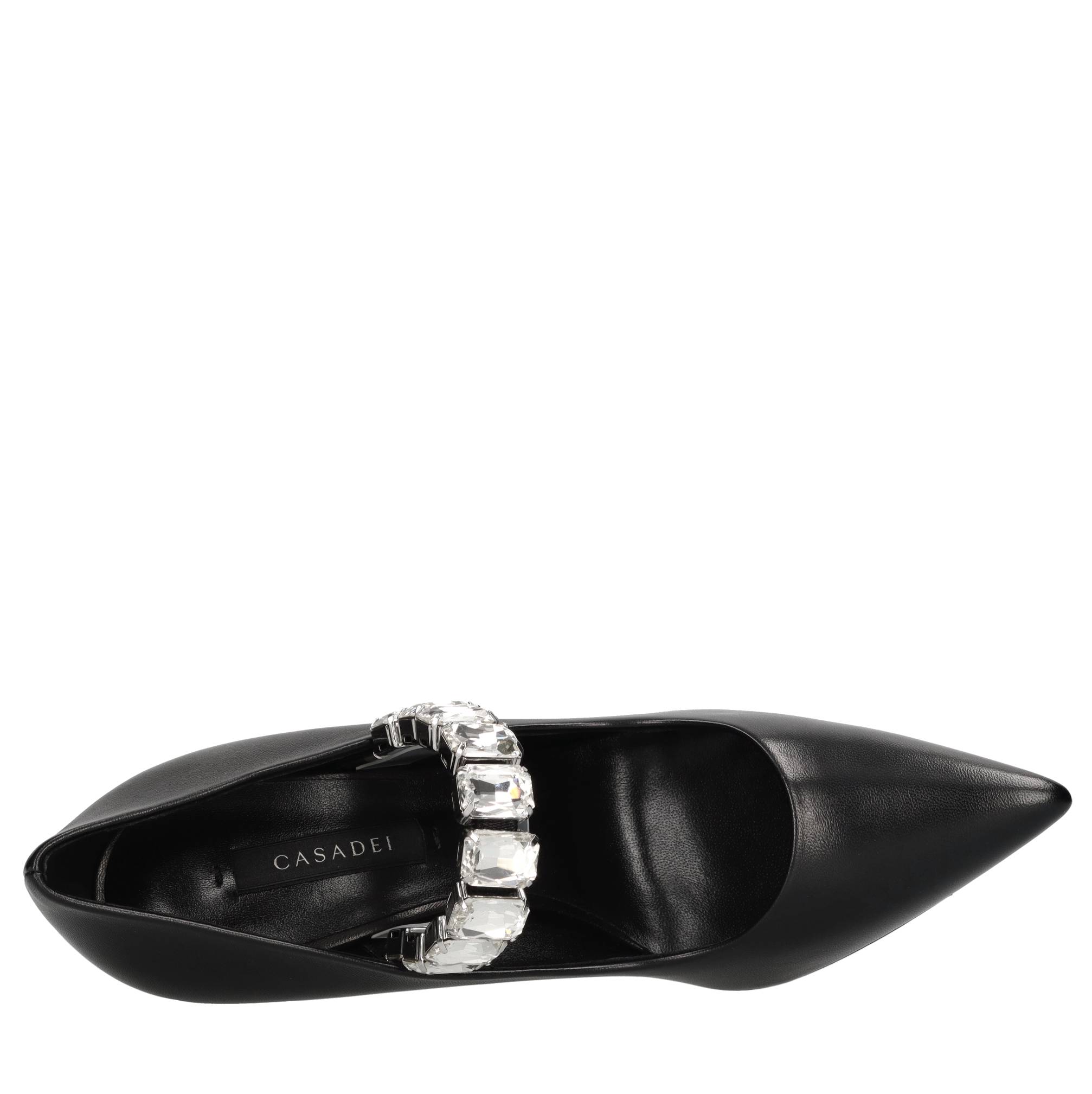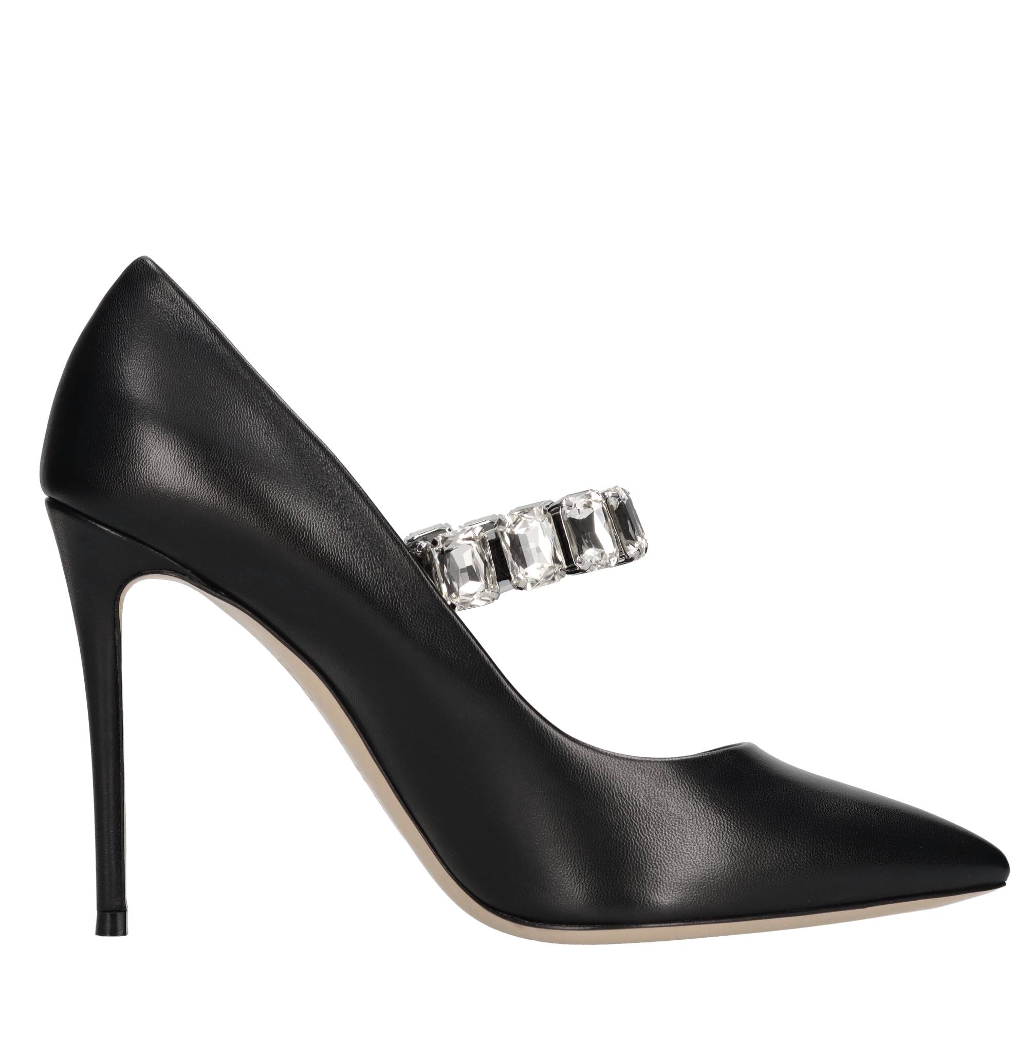 Julia Minorca pumps in nappa leather and rhinestones. Embellished with a maxi elastic crystal bracelet. Leather upper. Leather outer sole. We do not recommend applying protective rubber to the sole. Doing so alters the balance of the shoe and may cause the heel to break. Any repairs to damage caused by this modification will be at the customer's expense.