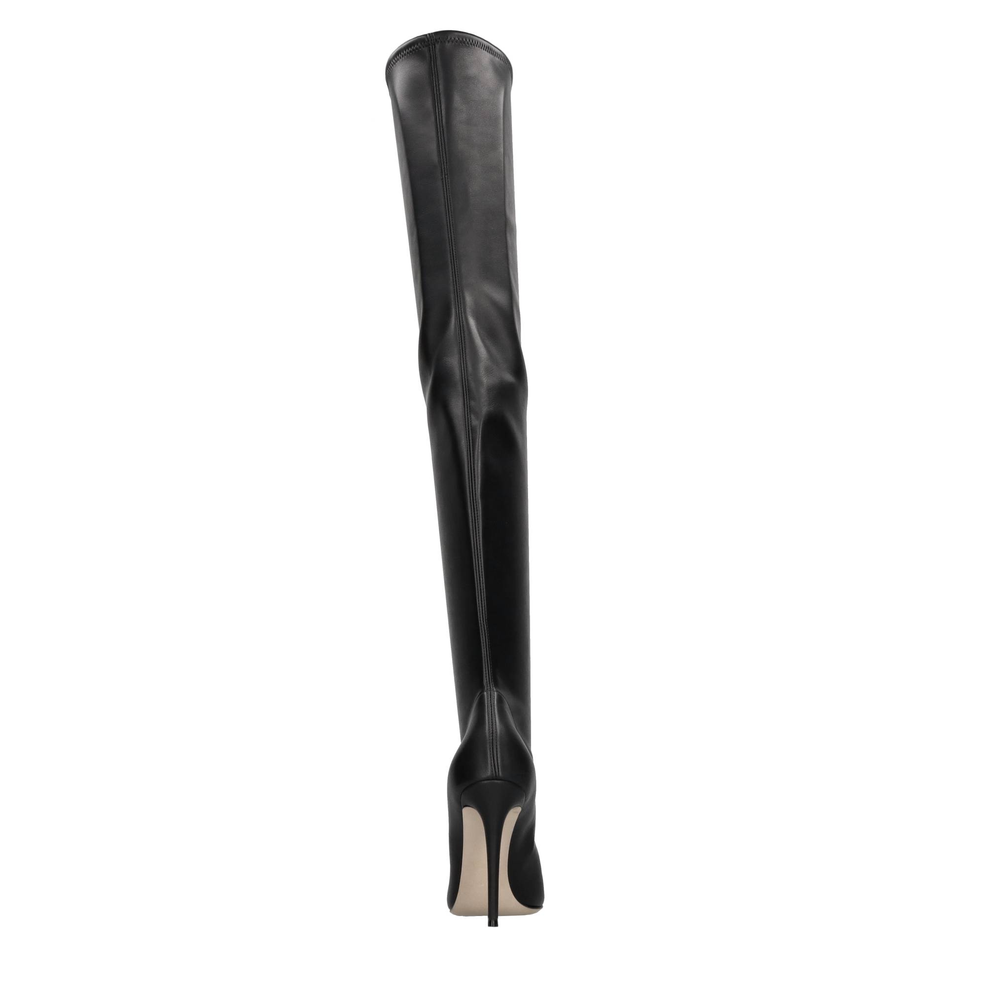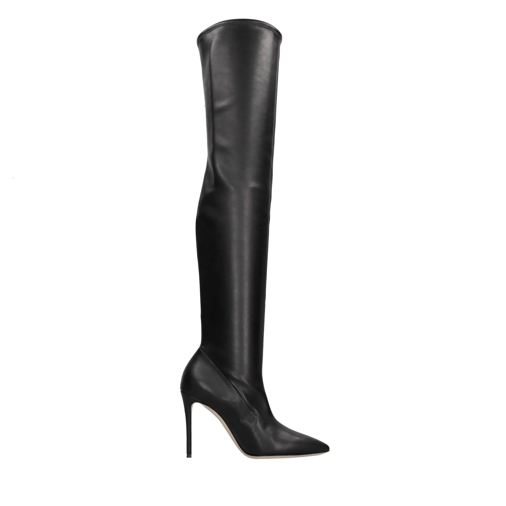 Julia stretch faux leather cuissard boots. Inner upper in stretch fabric and leather. Leather sole. Samples shipped in a plain box. We do not recommend applying protective rubber to the sole. Doing so alters the balance of the shoe and may cause the heel to break. Any repairs to damage caused by this modification will be at the customer's expense.