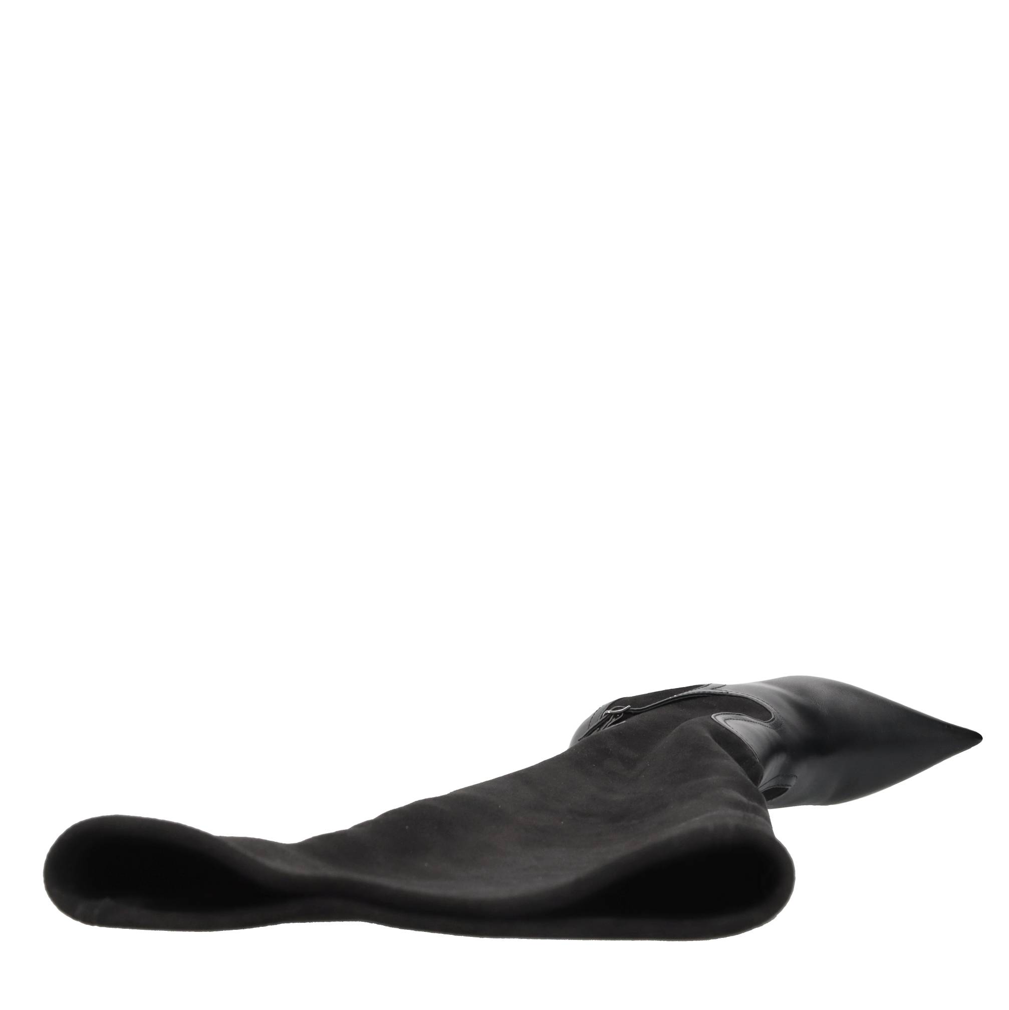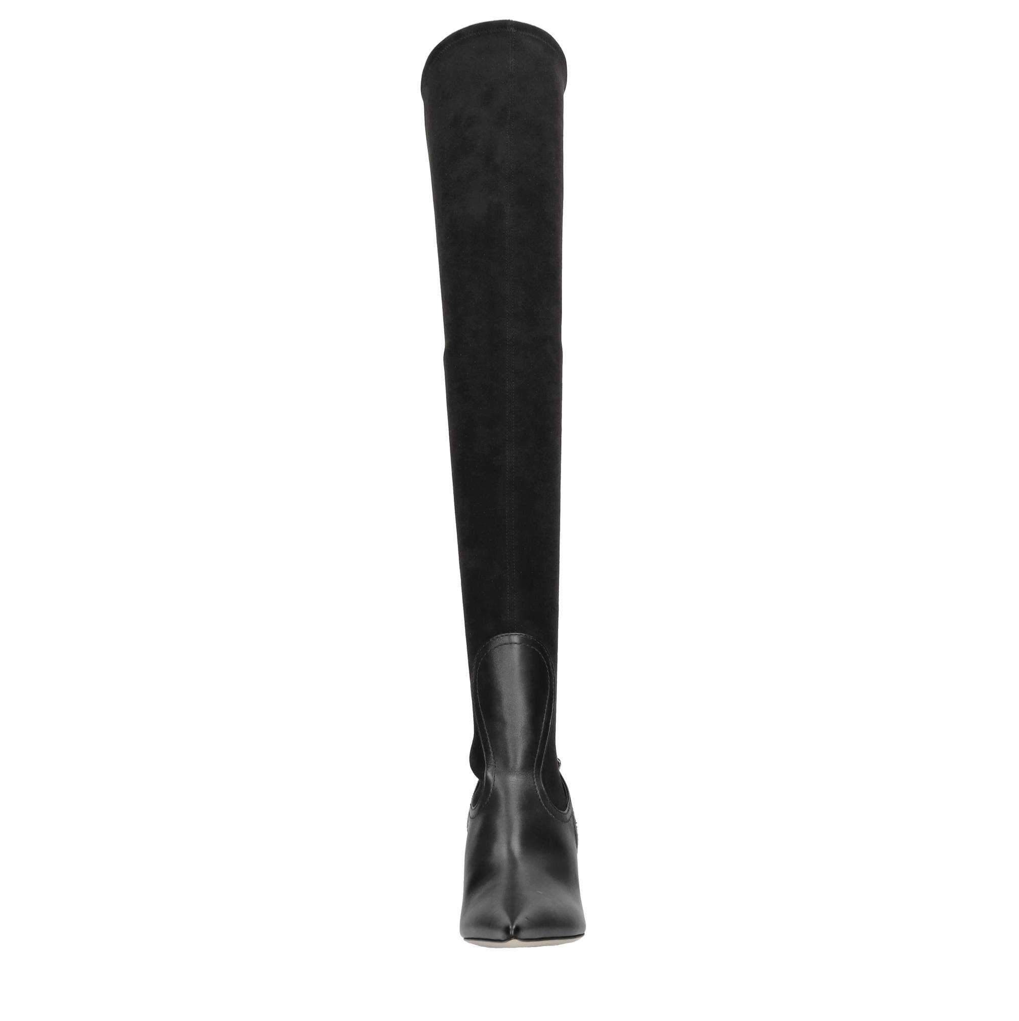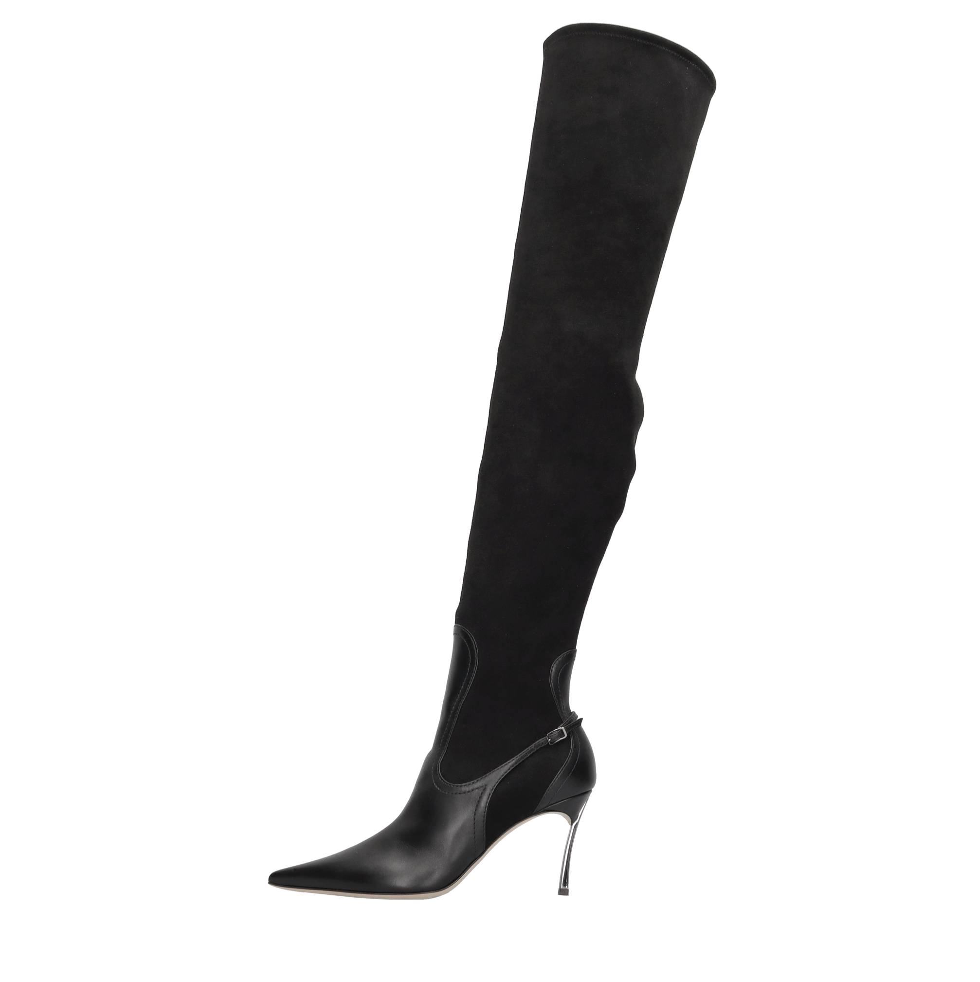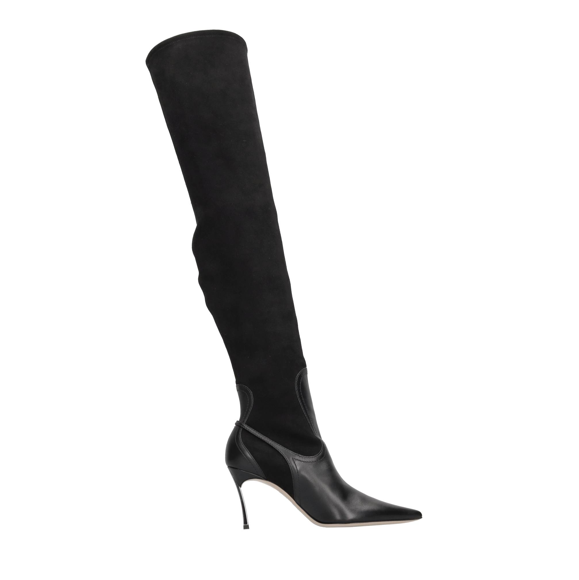 Superblade cuissard boots in leather and stretch eco-suede. Inner upper in stretch fabric and leather. Leather sole. Samples shipped in a plain box. We do not recommend applying protective rubber to the sole. Doing so alters the balance of the shoe and may cause the heel to break. Any repairs to damage caused by this modification will be at the customer's expense.