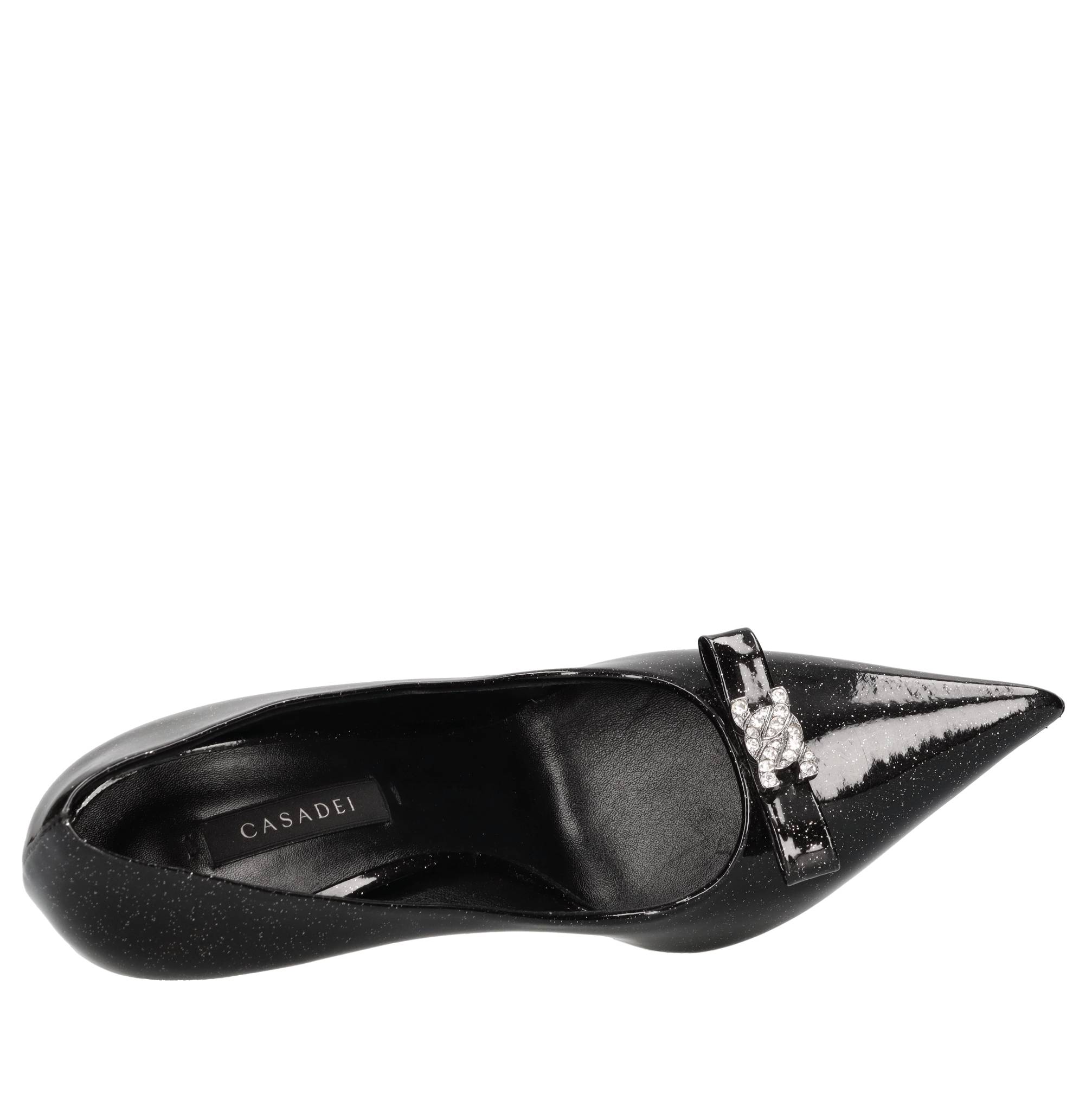 Superblade leather pumps with silver microglitter, bow with C-chain embellished with rhinestones. Leather upper. Leather sole. Sample, shipped in a plain box. We do not recommend applying protective rubber to the sole. This alters the balance of the shoe and may cause the heel to break. Any repairs to damage caused by this modification, if required, will be at the customer's expense.