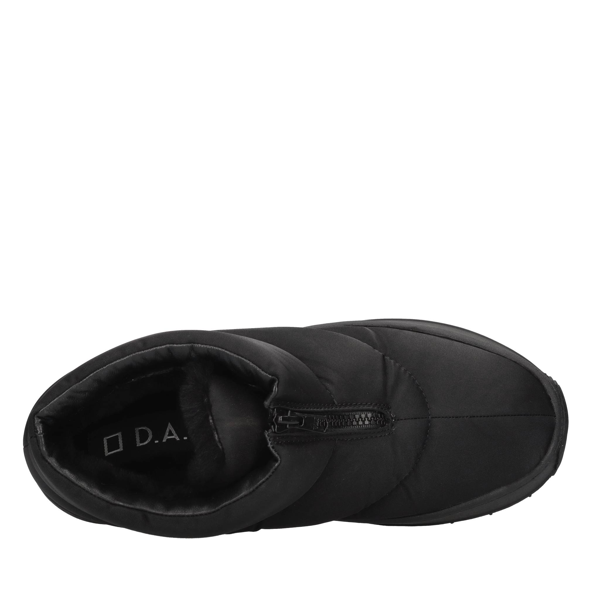 Fabric ankle boots. Internal upper with internal padding. Rubber outer sole. Front zip fastening.