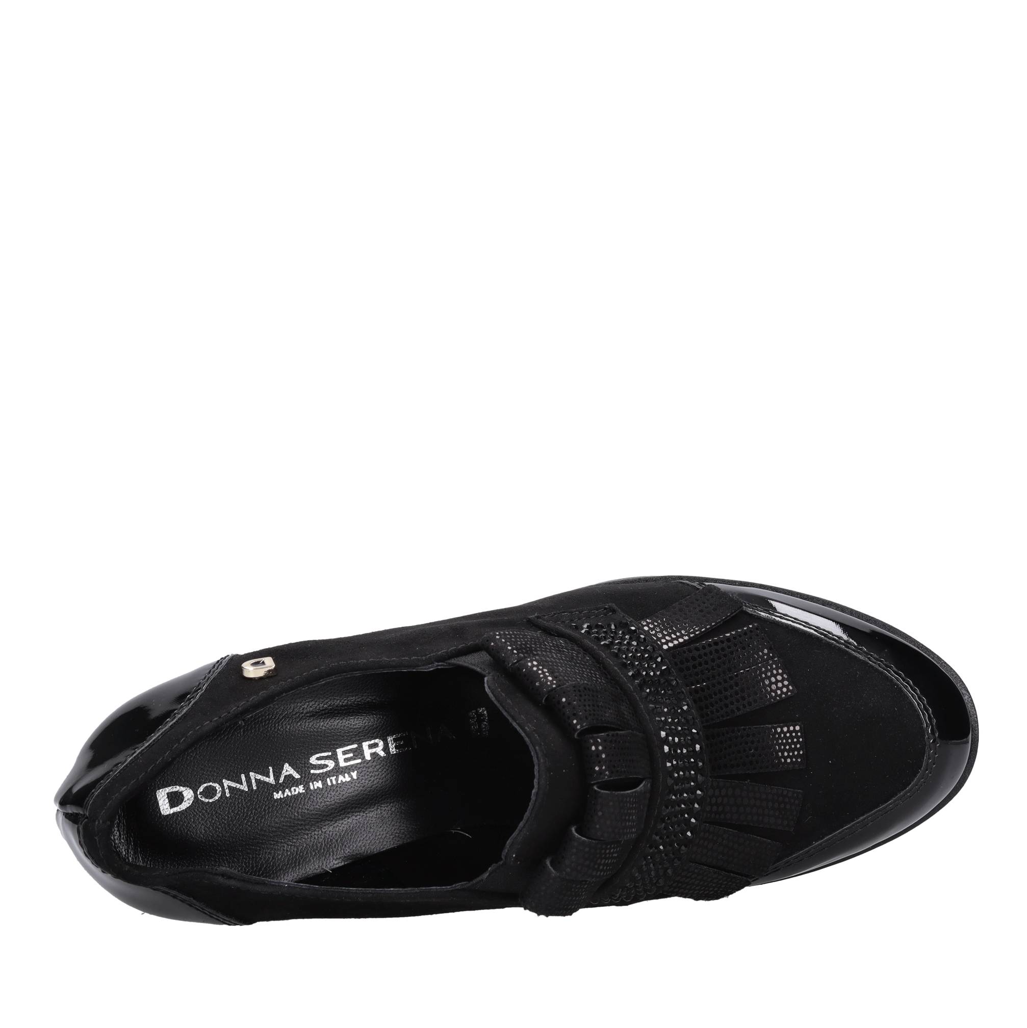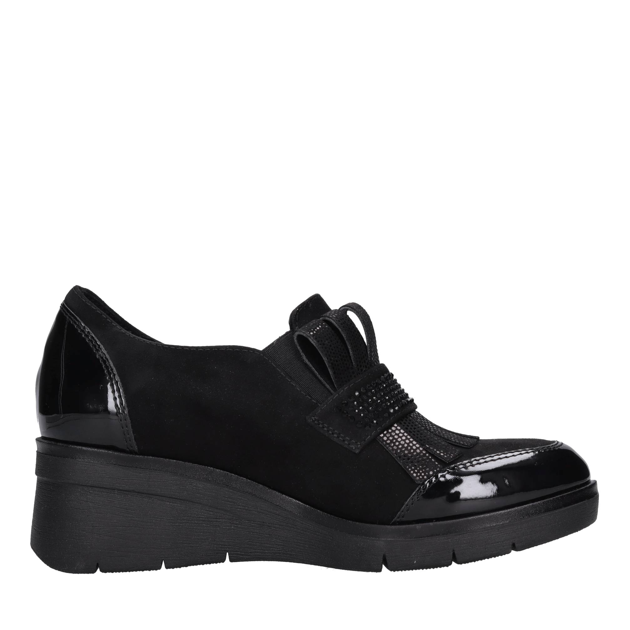 Wedges in shiny faux leather and fabric. Leather inner upper.Rubber outsole.