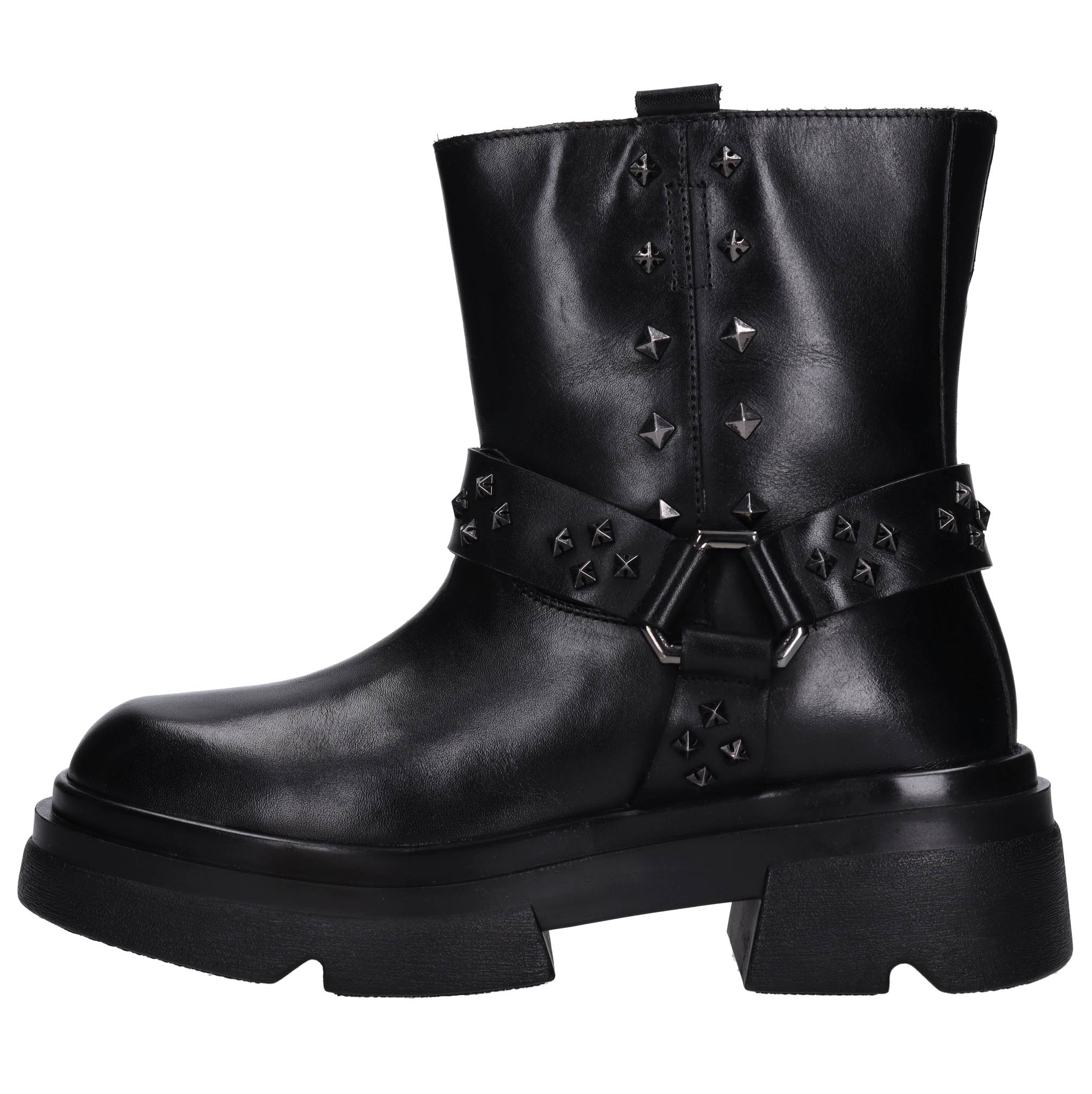 Leather ankle boots. Anthracite studs. Leather upper. Rubber outsole.