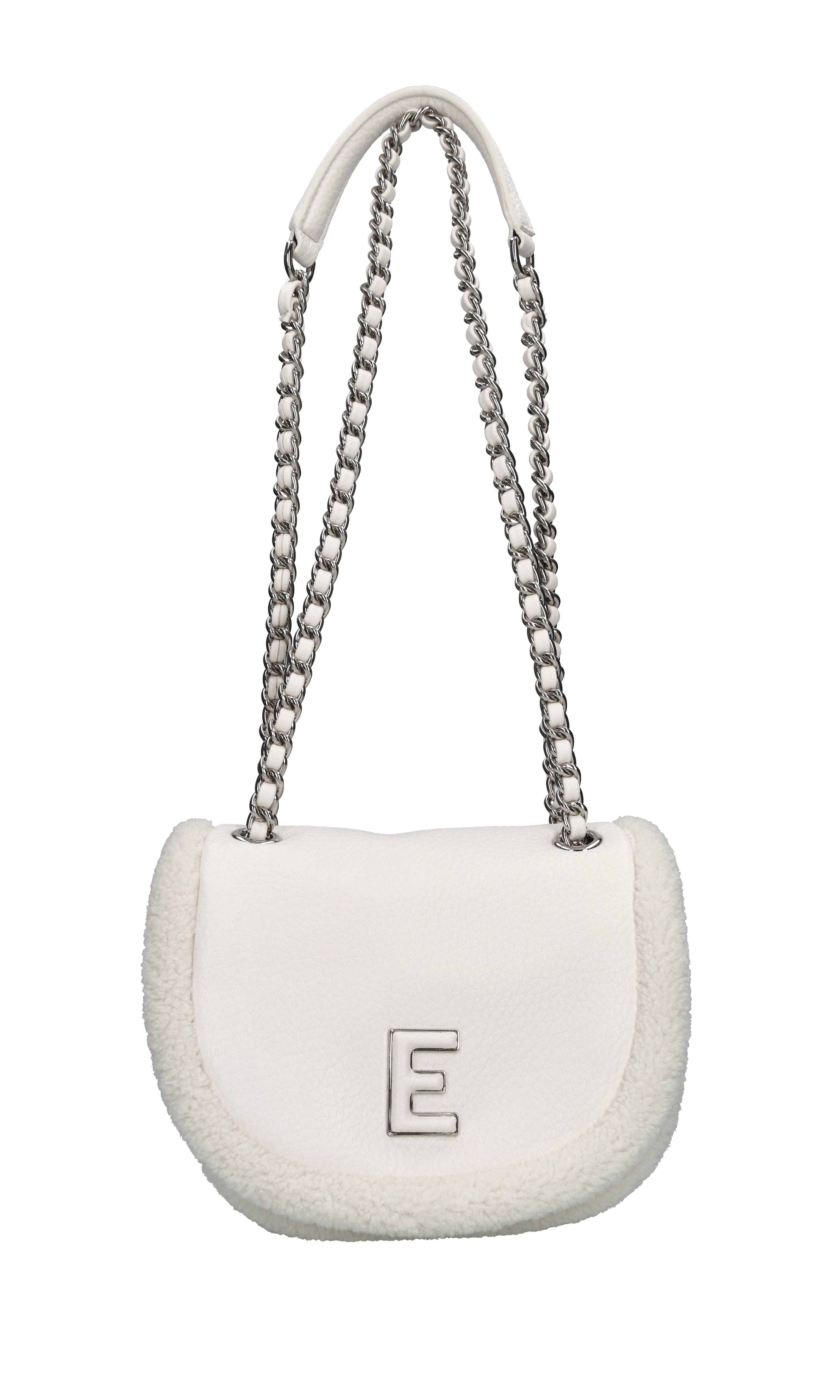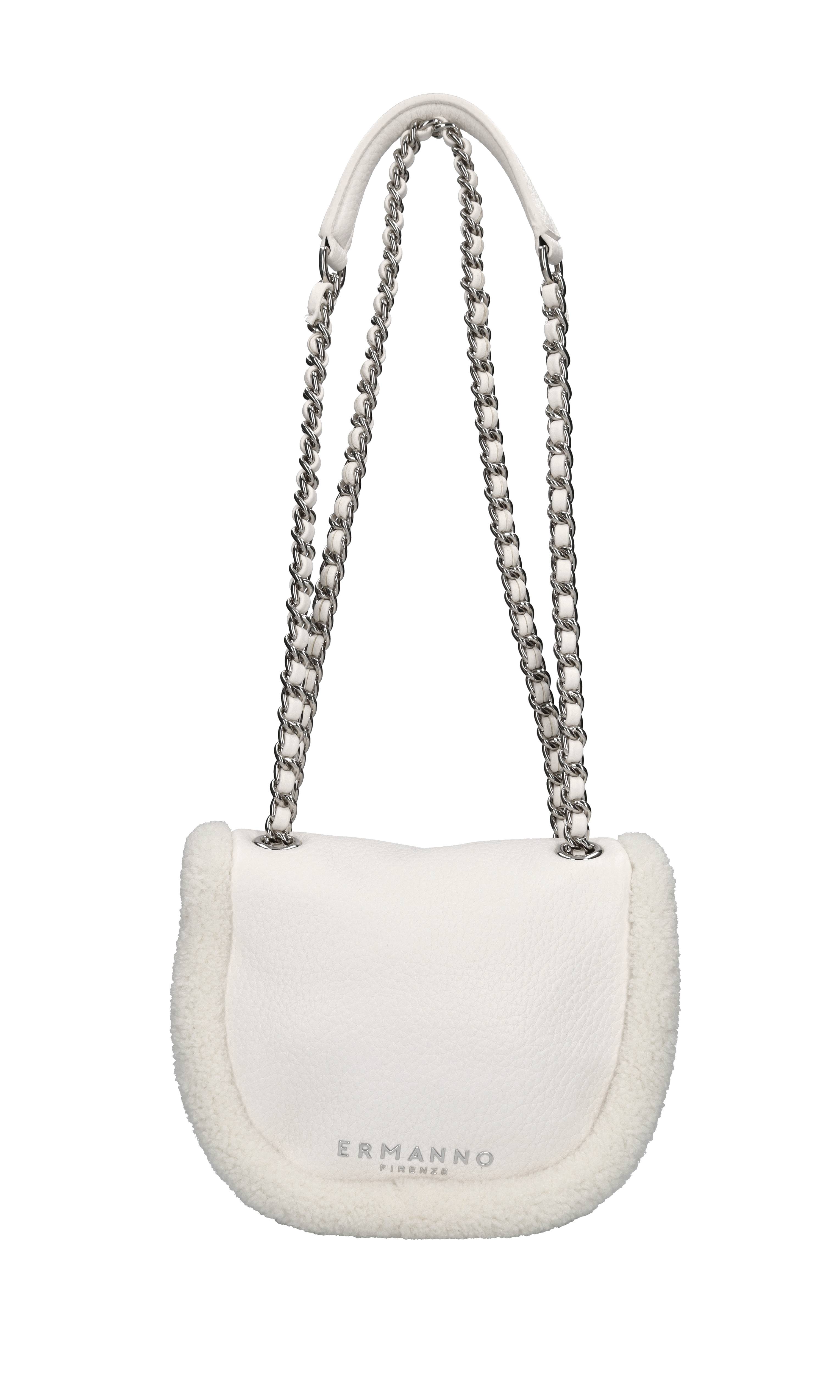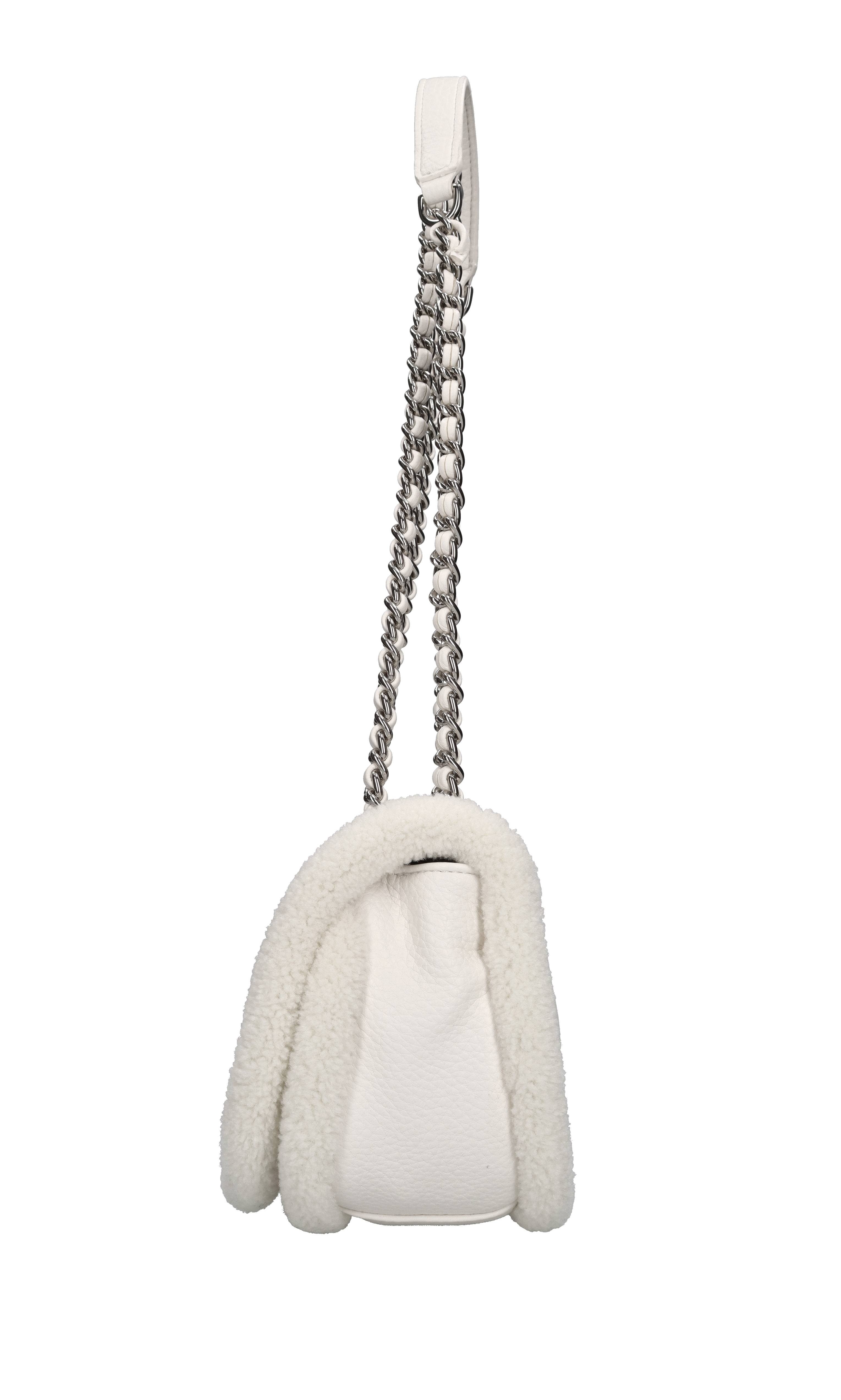 Faux leather and faux fur bag. Hammered finish. 1 compartment. Flap closure with snap button. Silver chain and faux leather shoulder strap. Shipped in a transparent bag.