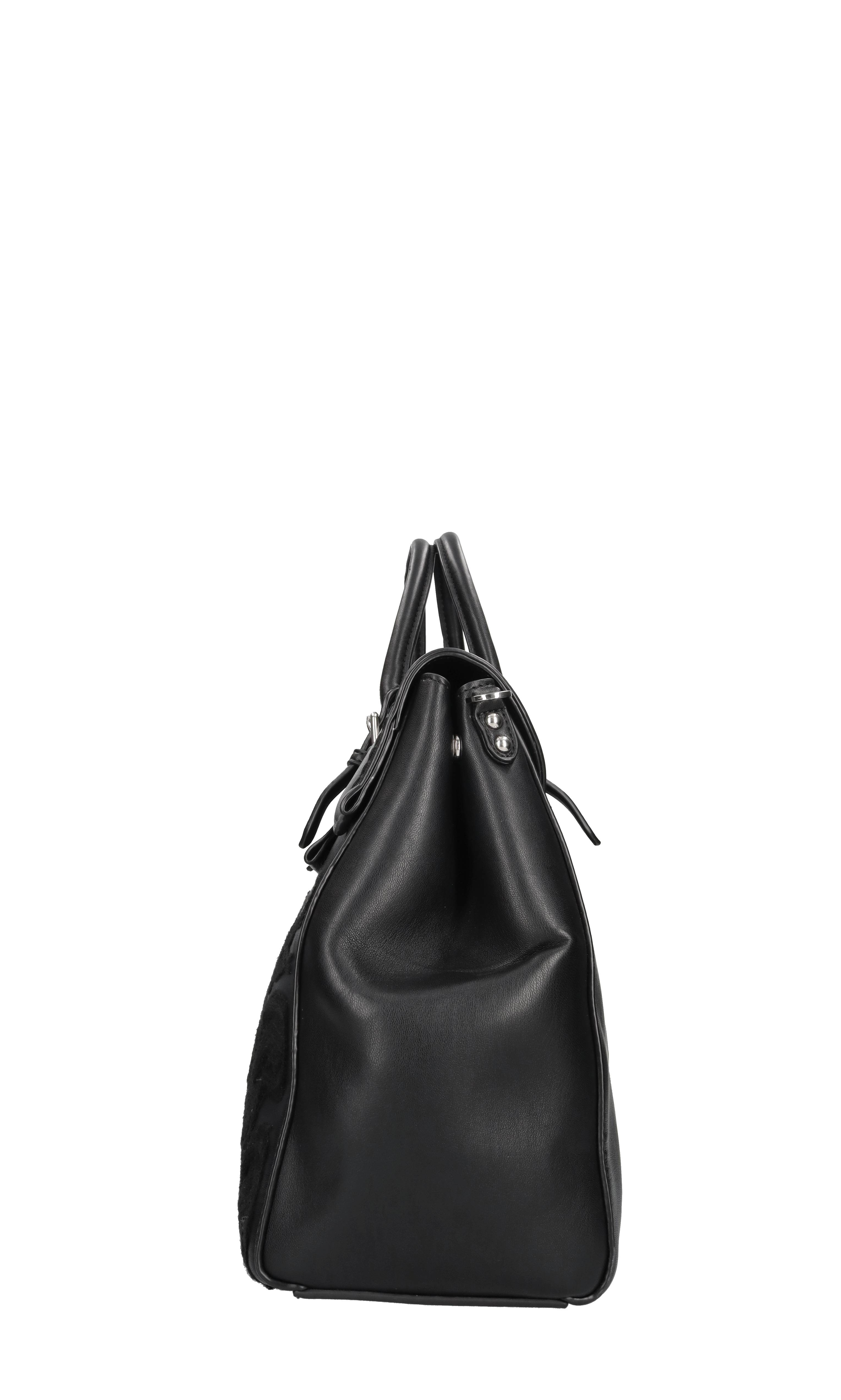 Faux leather bag. Fabric motif. 1 compartment. Flap closure with double magnetic button. Adjustable and removable faux leather shoulder strap.
