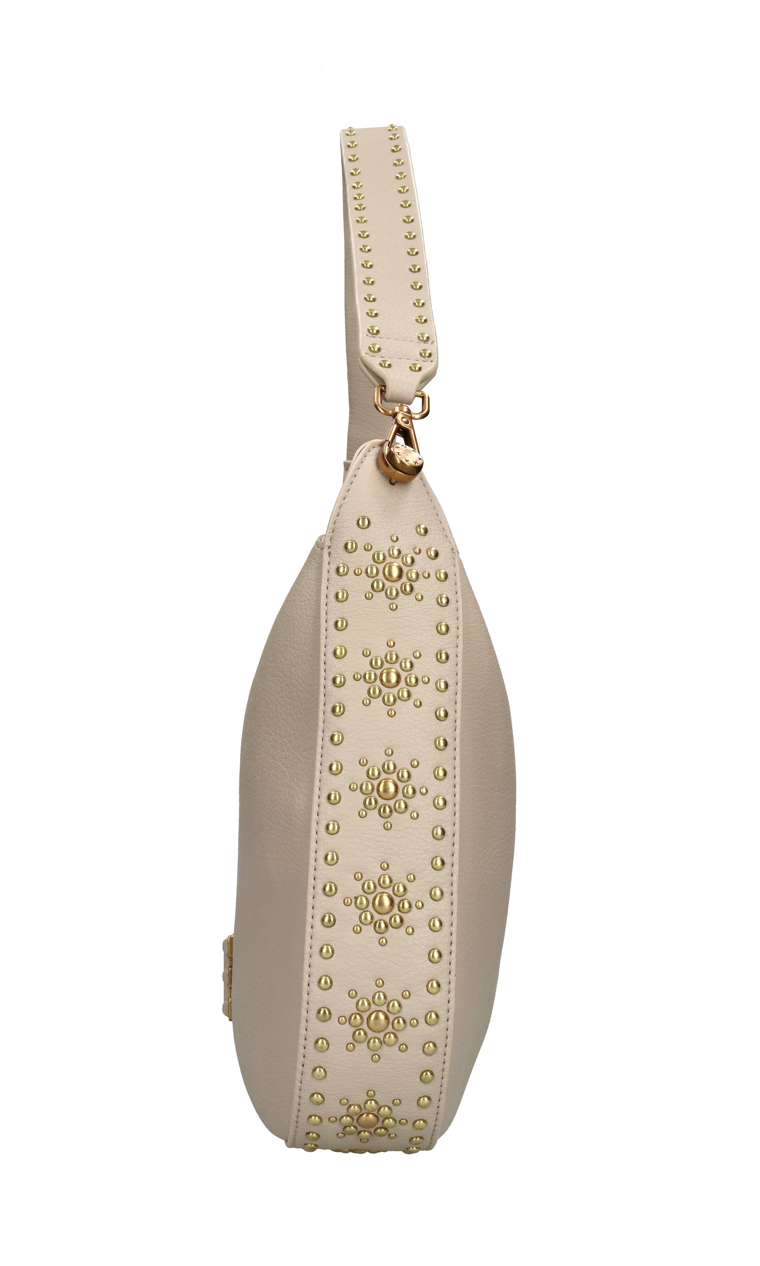 Faux leather bag. Hammered finish. 1 compartment. Zip closure. Removable handle with bronze studs. Adjustable and removable faux leather shoulder strap.