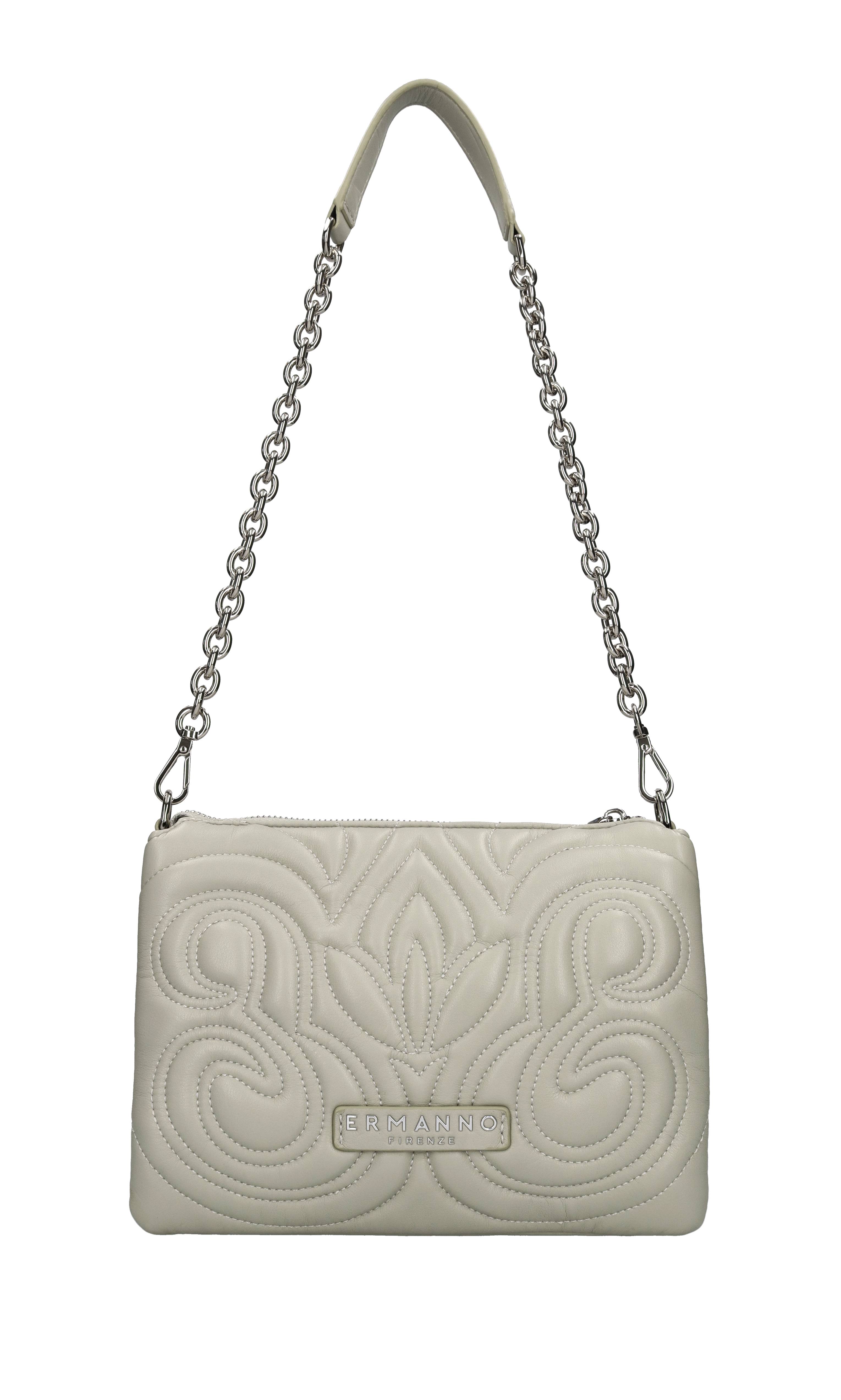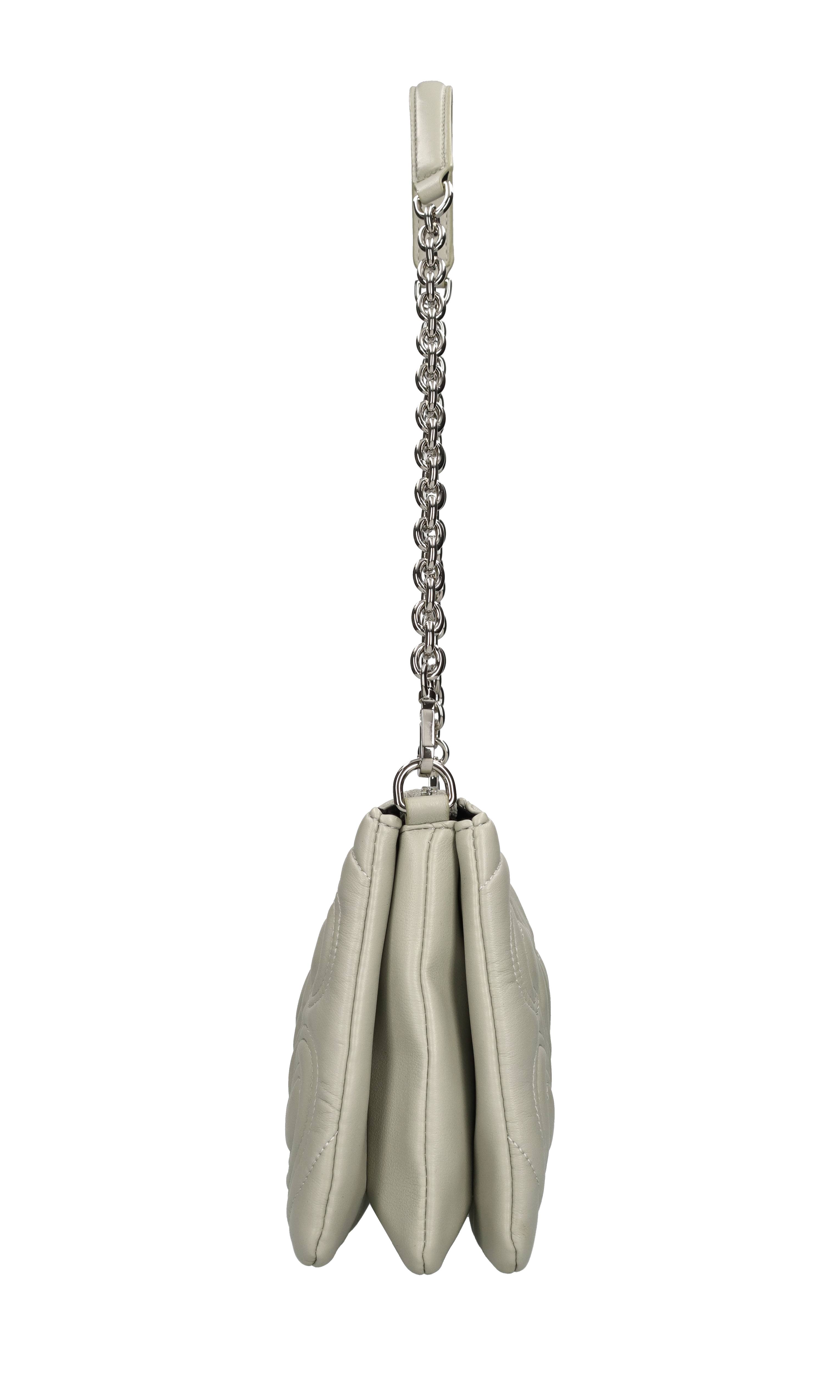 Faux leather bag. 3 compartments. Zip closure. Faux leather handle and removable silver chain. Adjustable and removable faux leather shoulder strap. Shipped in a transparent bag. Grey-green colour.