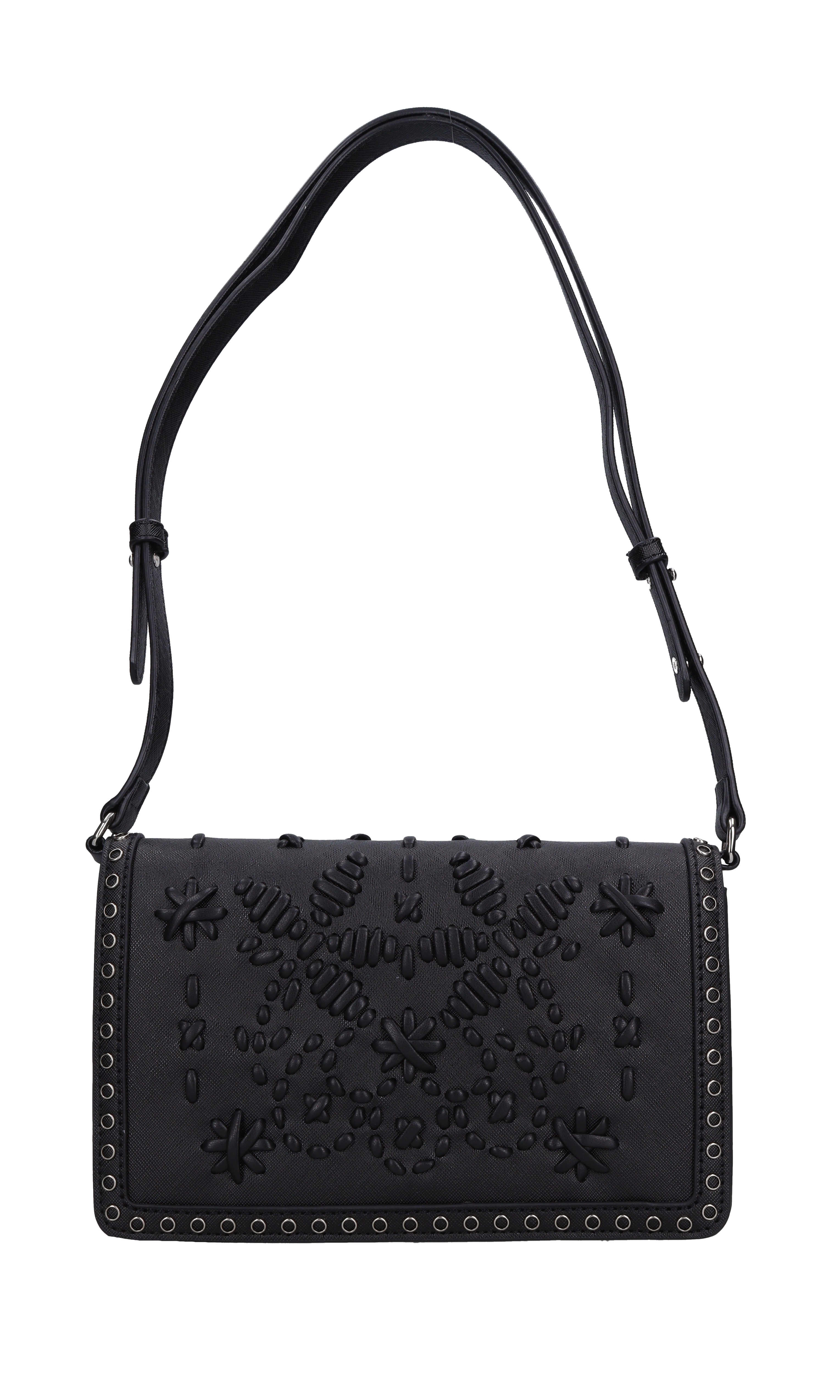 Faux leather bag. 1 Compartment. Flap closure with magnetic buttons. Adjustable and removable shoulder strap. Shipped on transparent pouch.