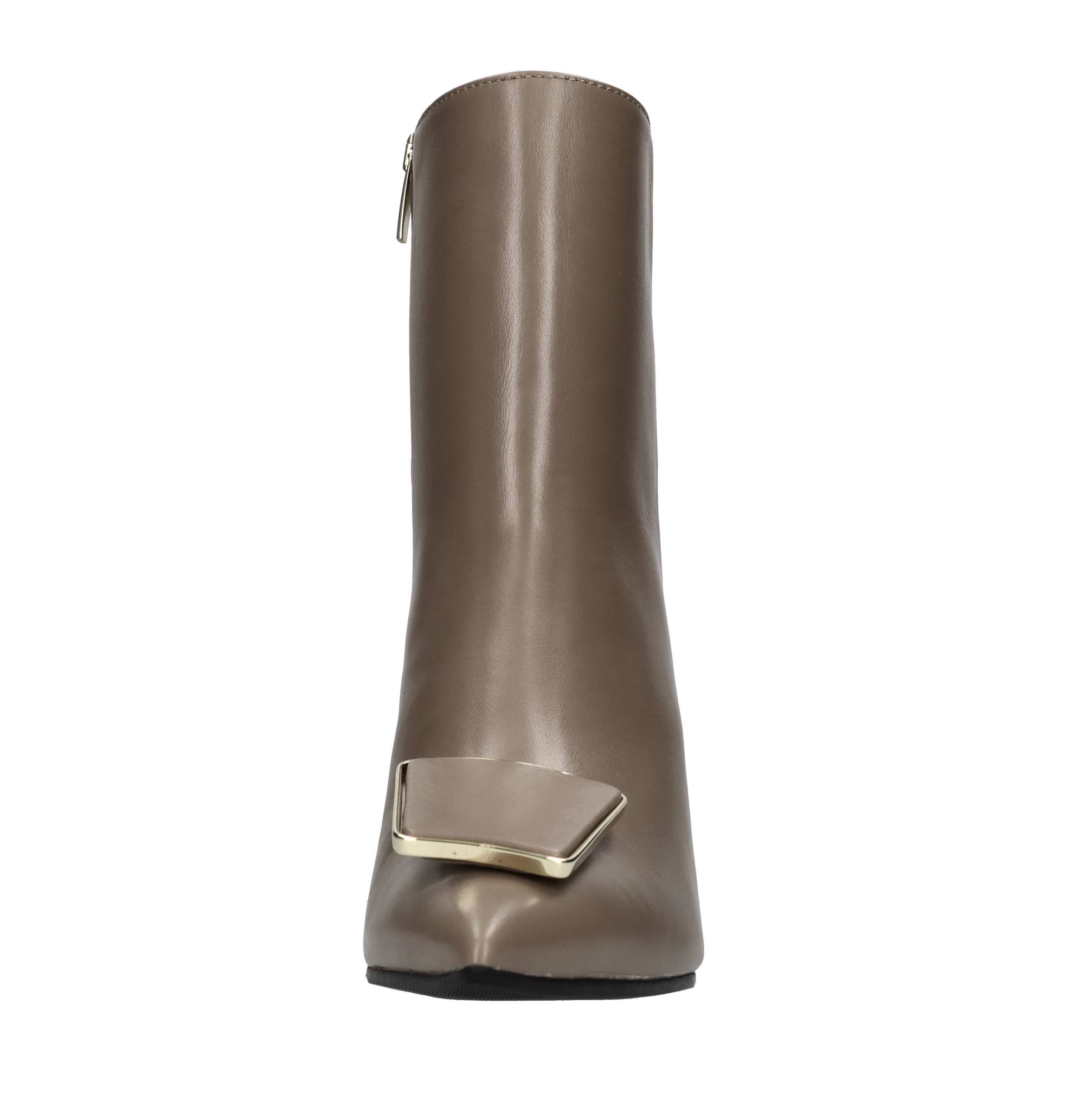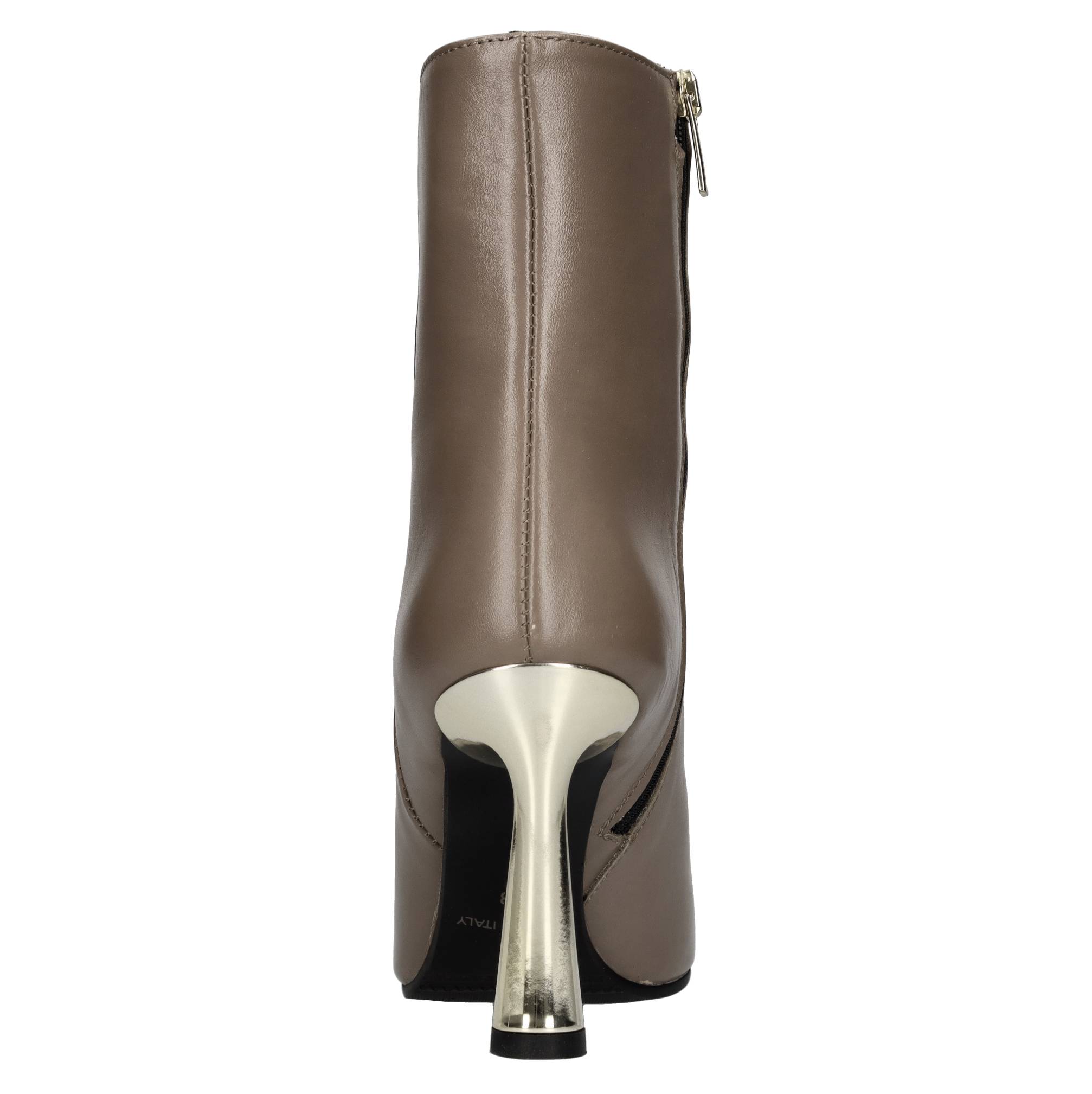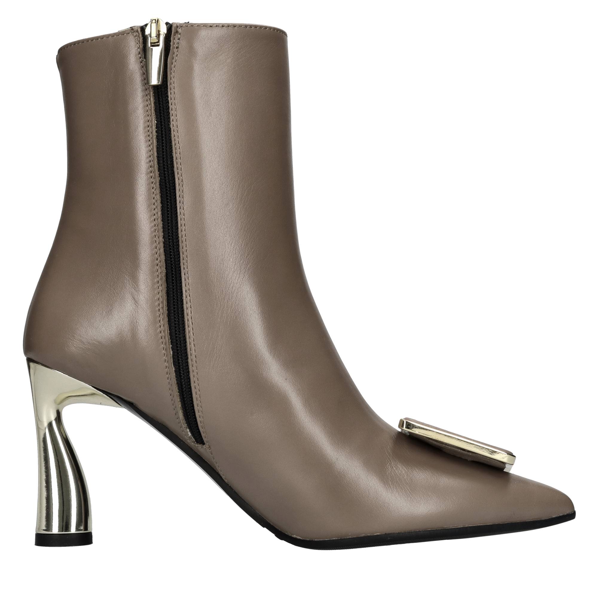 Leather ankle boots. Leather appliqué with gold-coloured trim. Leather inner upper. Rubber outer sole. Internal side zip. Gold-coloured metal heel.