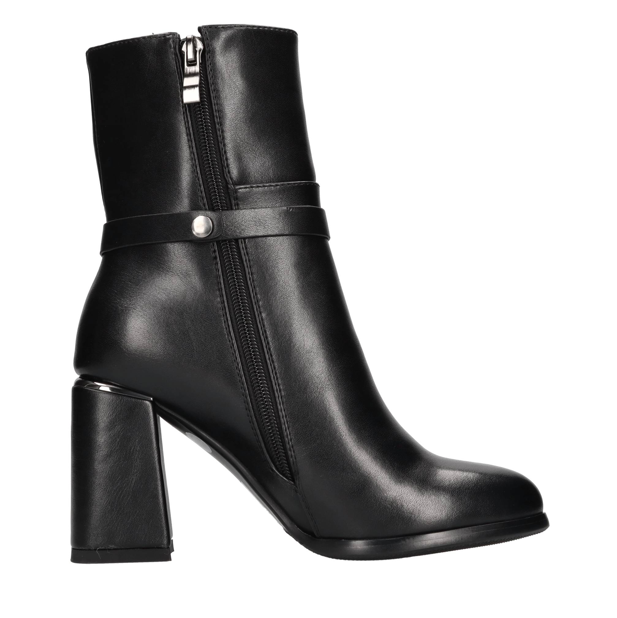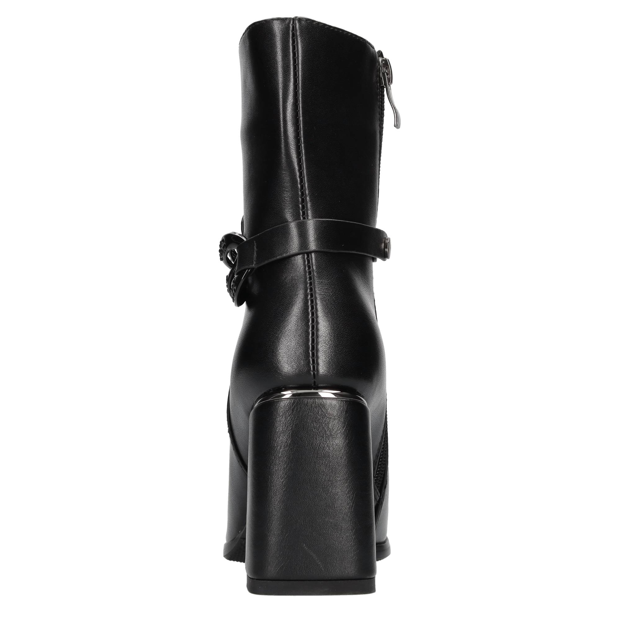 Faux leather ankle boots with chain and rhinestones. Faux leather and fabric upper. Rubber sole.