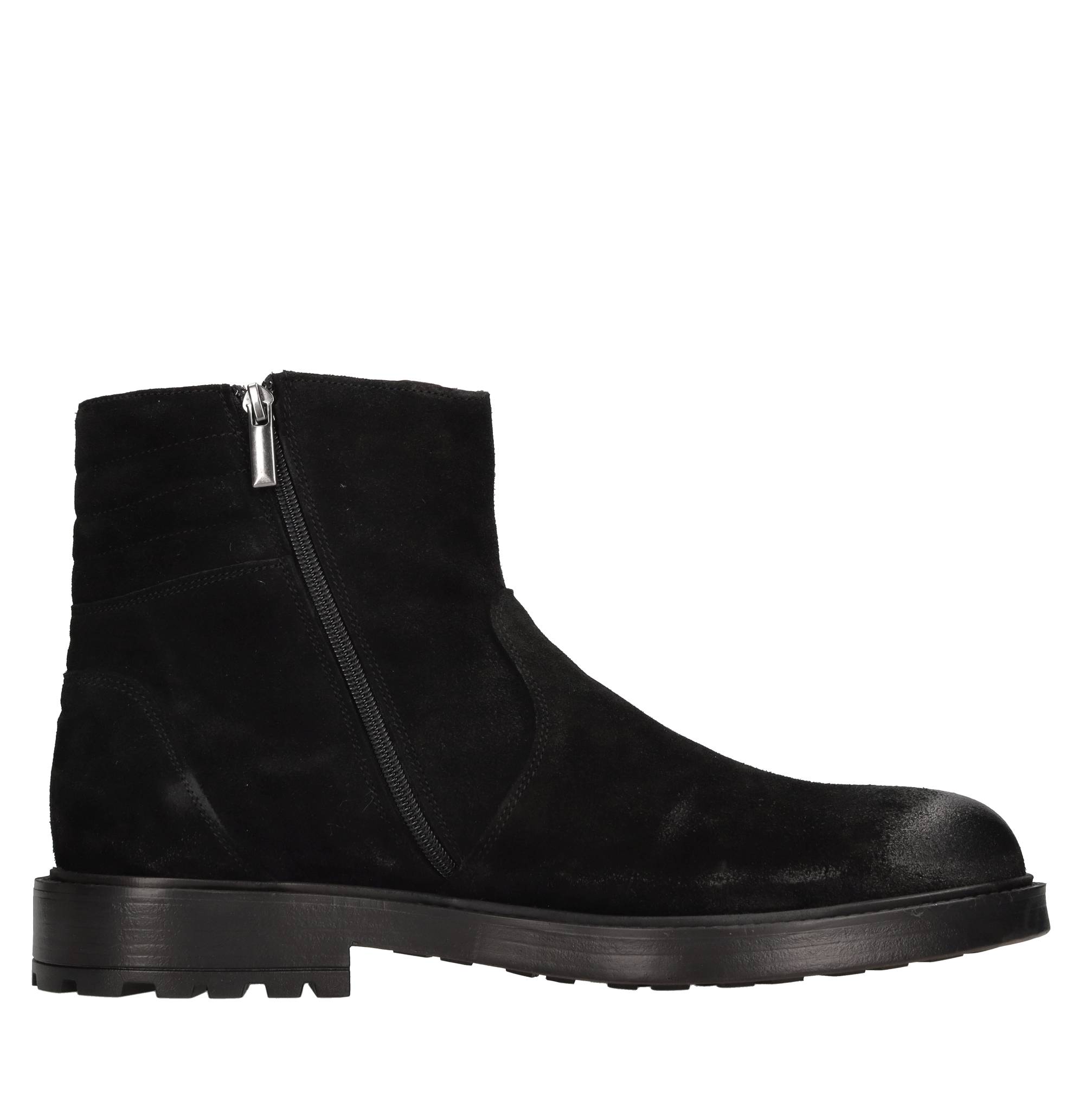 Suede ankle boots. Vintage effect. Leather inner upper. Rubber outsole. Double side zip.