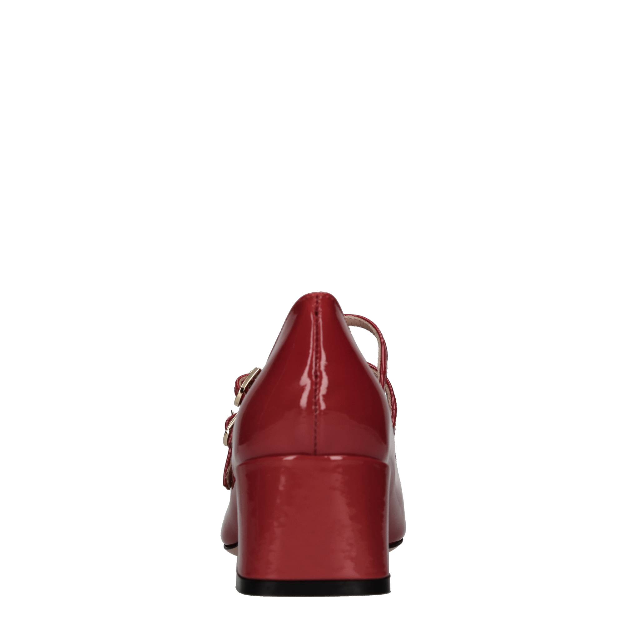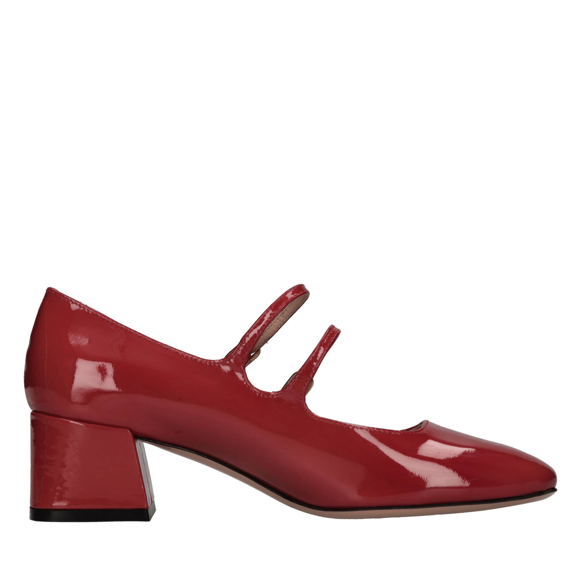 Patent leather pumps. Leather inner upper. Rubber and leather outer sole. Double buckle.