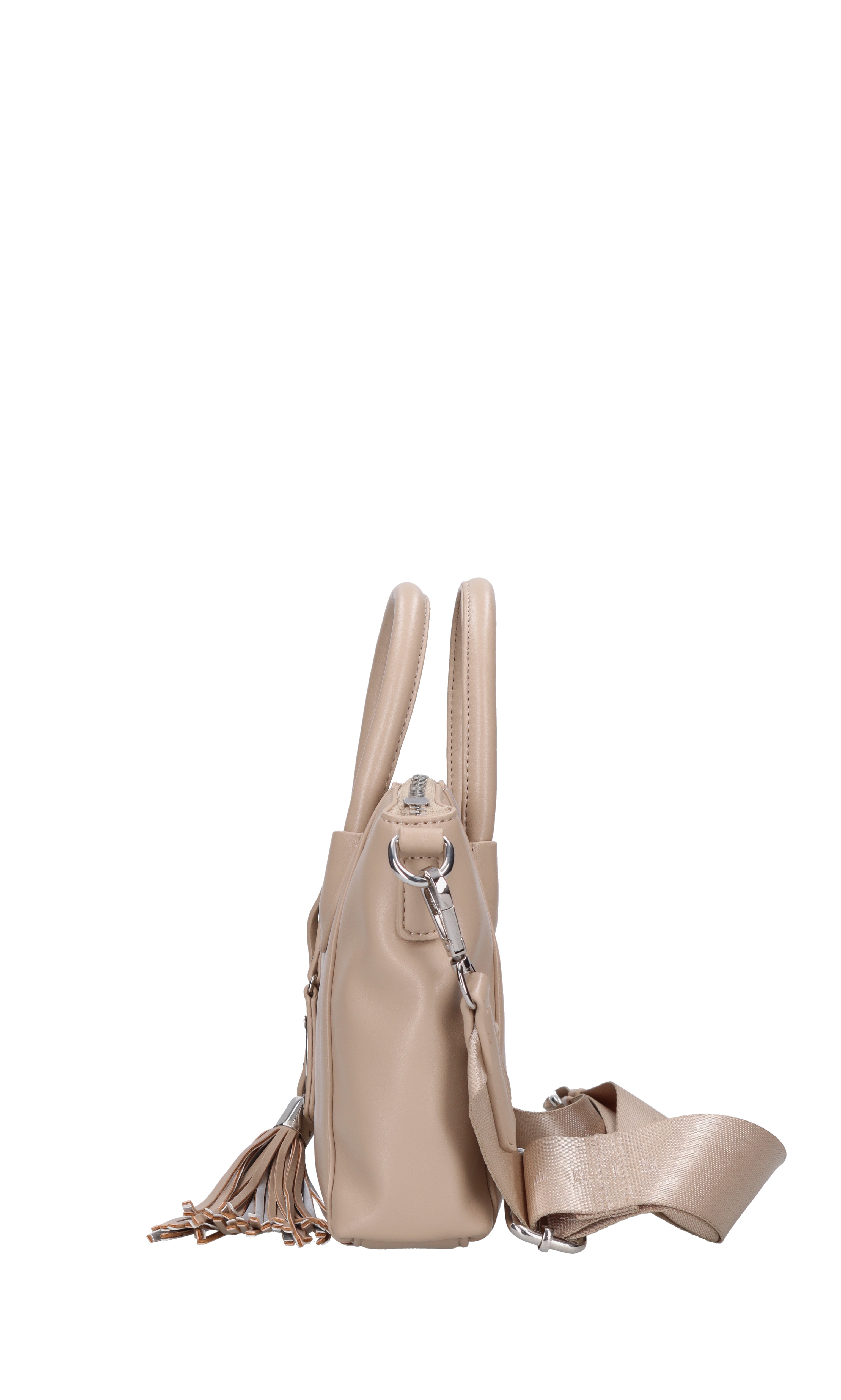 Faux leather bag. Zipper closure. 1 Compartment. 2 Removable charms. Adjustable and removable shoulder strap.