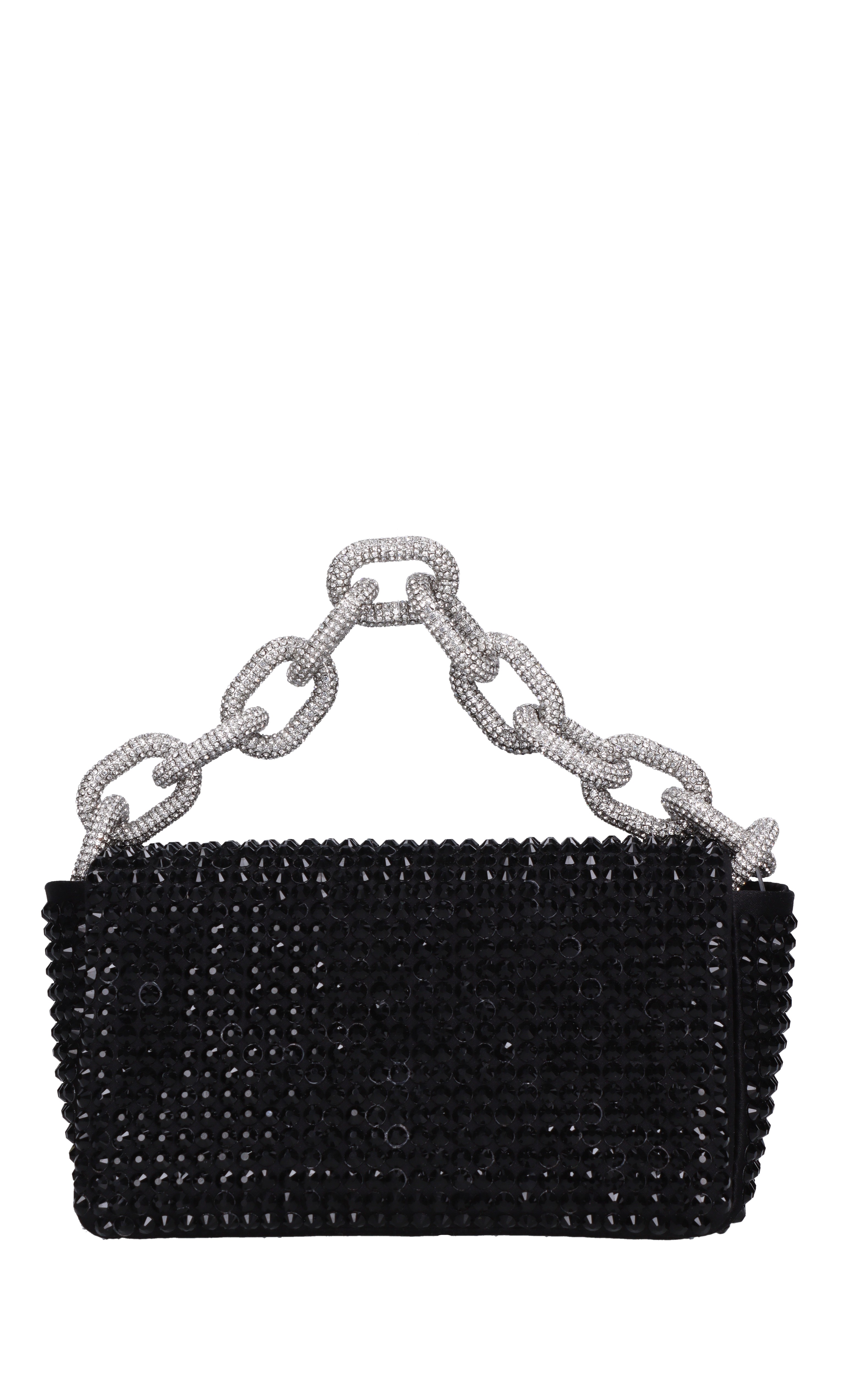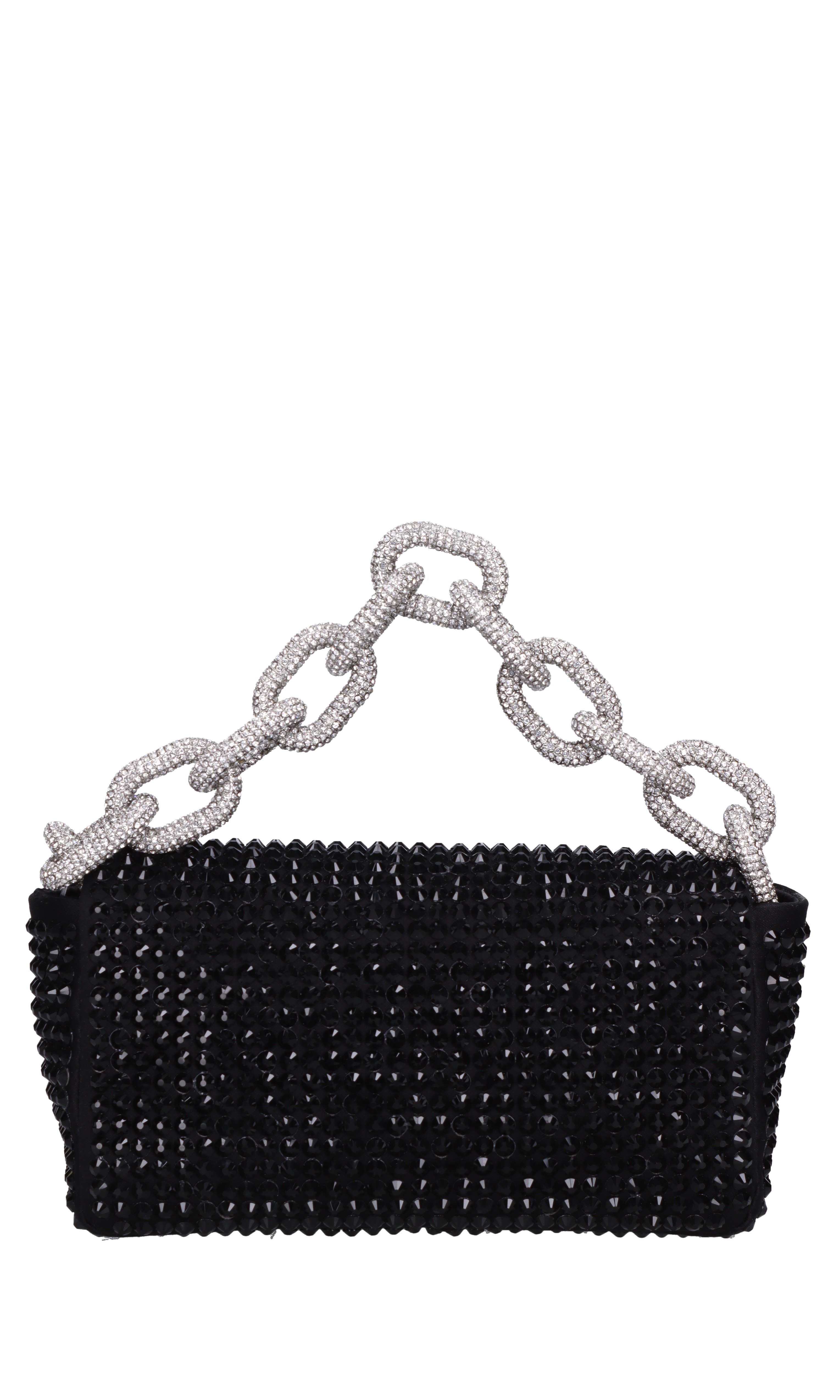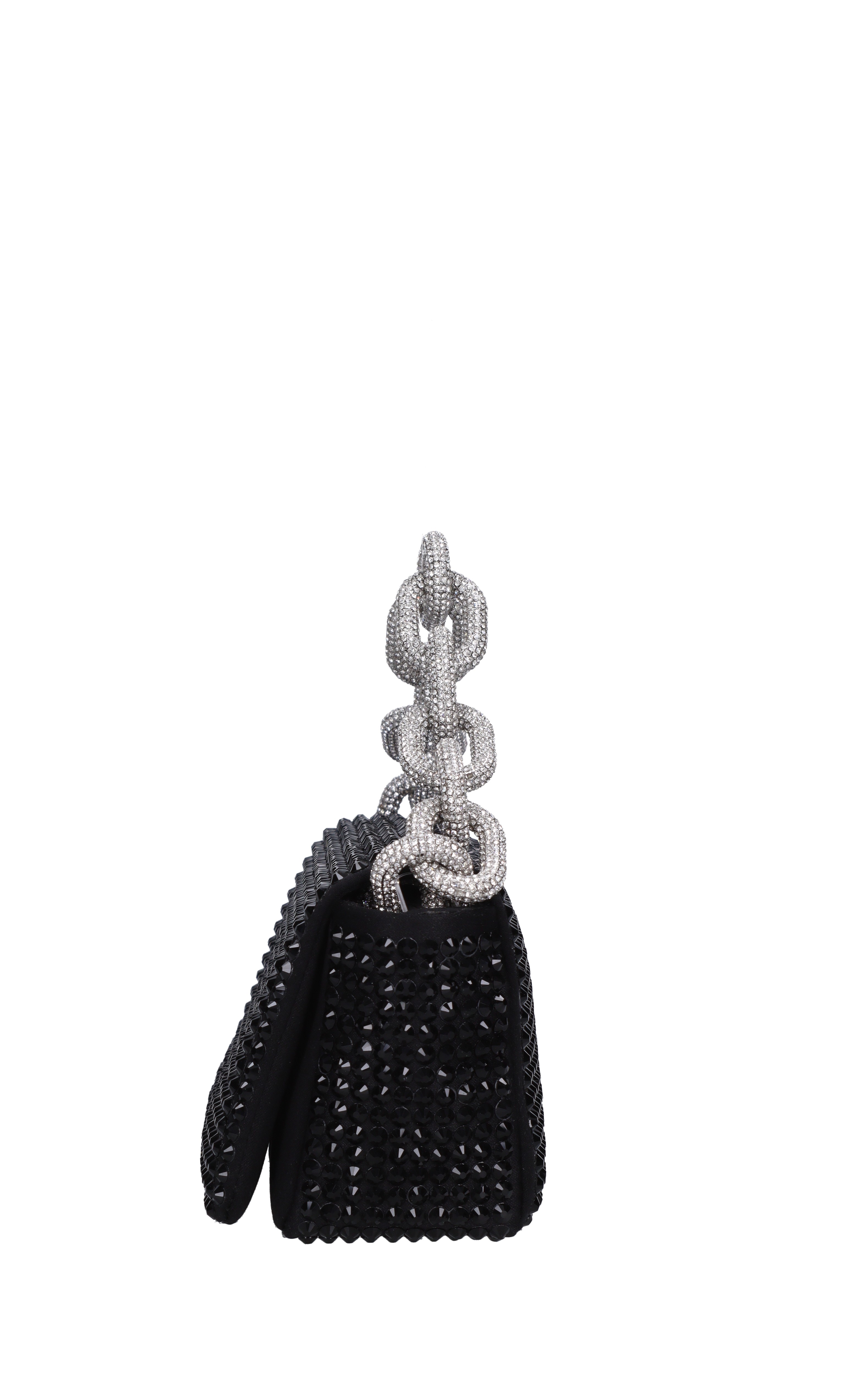 My Dream mini bag in satin and rhinestones. One compartment. Silver chain jewel handle. Magnetic flap closure. Without tag but with certificate of authenticity. Shipped in a transparent bag.