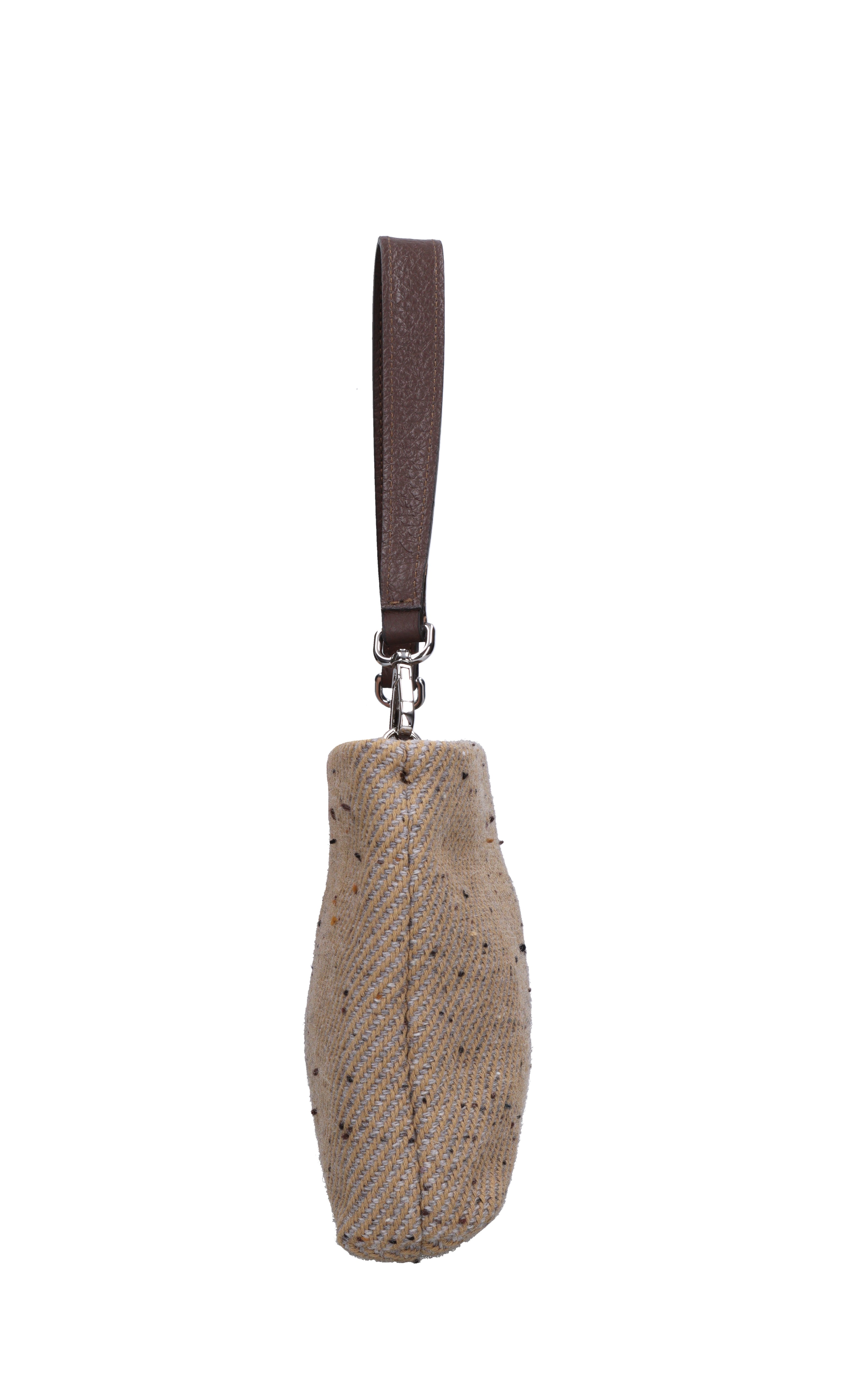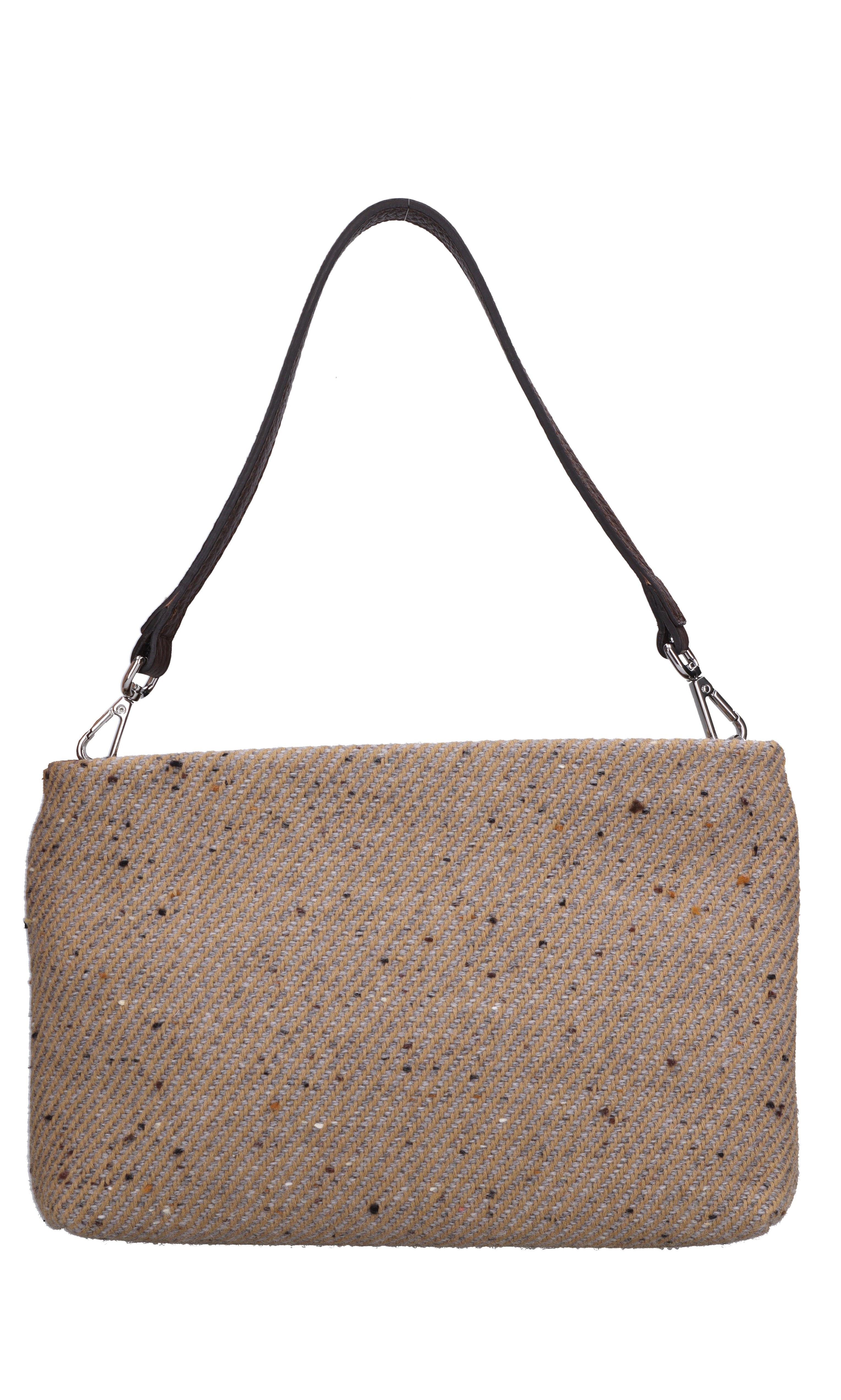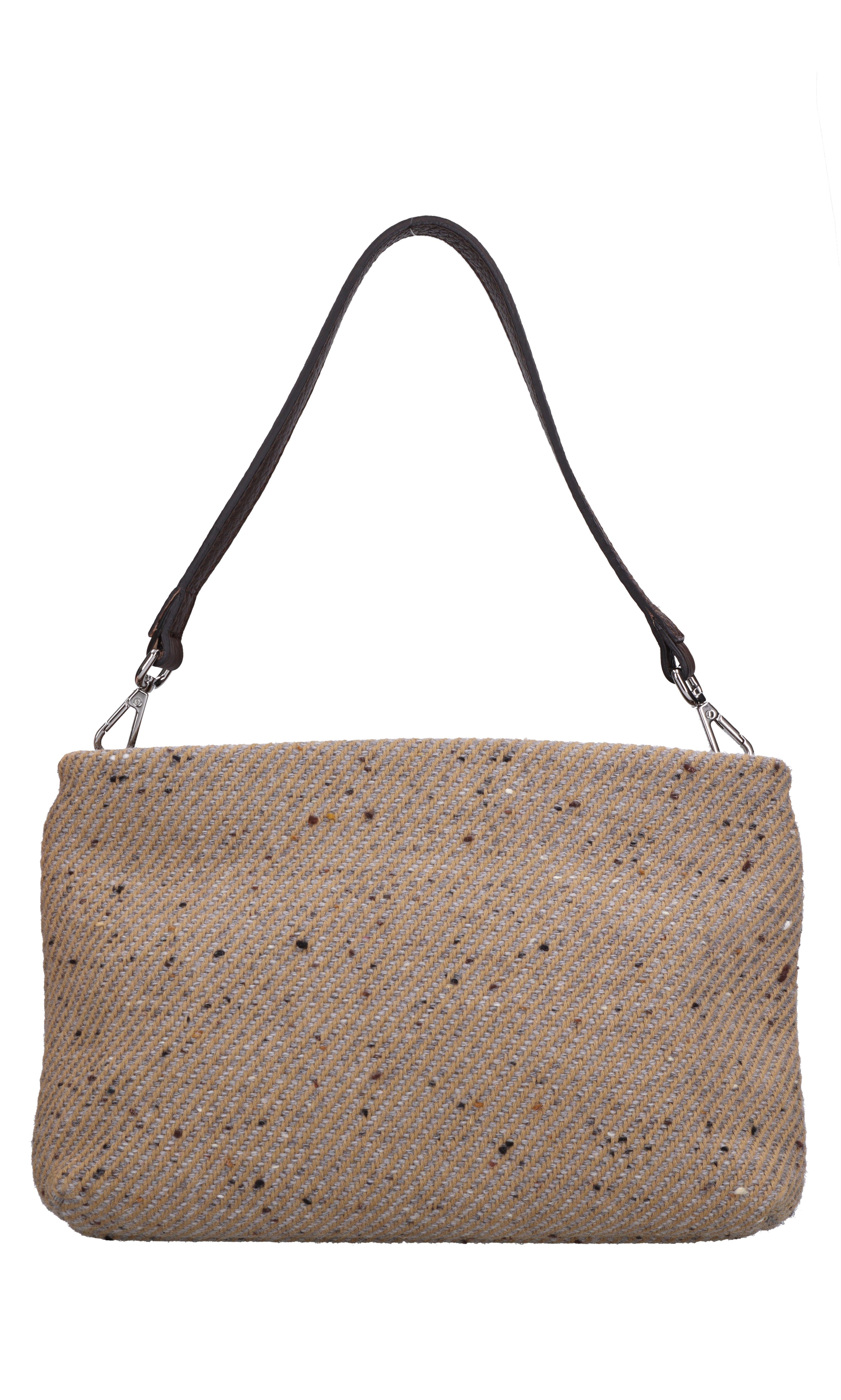 Fabric bag. 1 compartment. Zip closure. Adjustable and removable leather shoulder strap. Removable leather handle. Clutch portability.