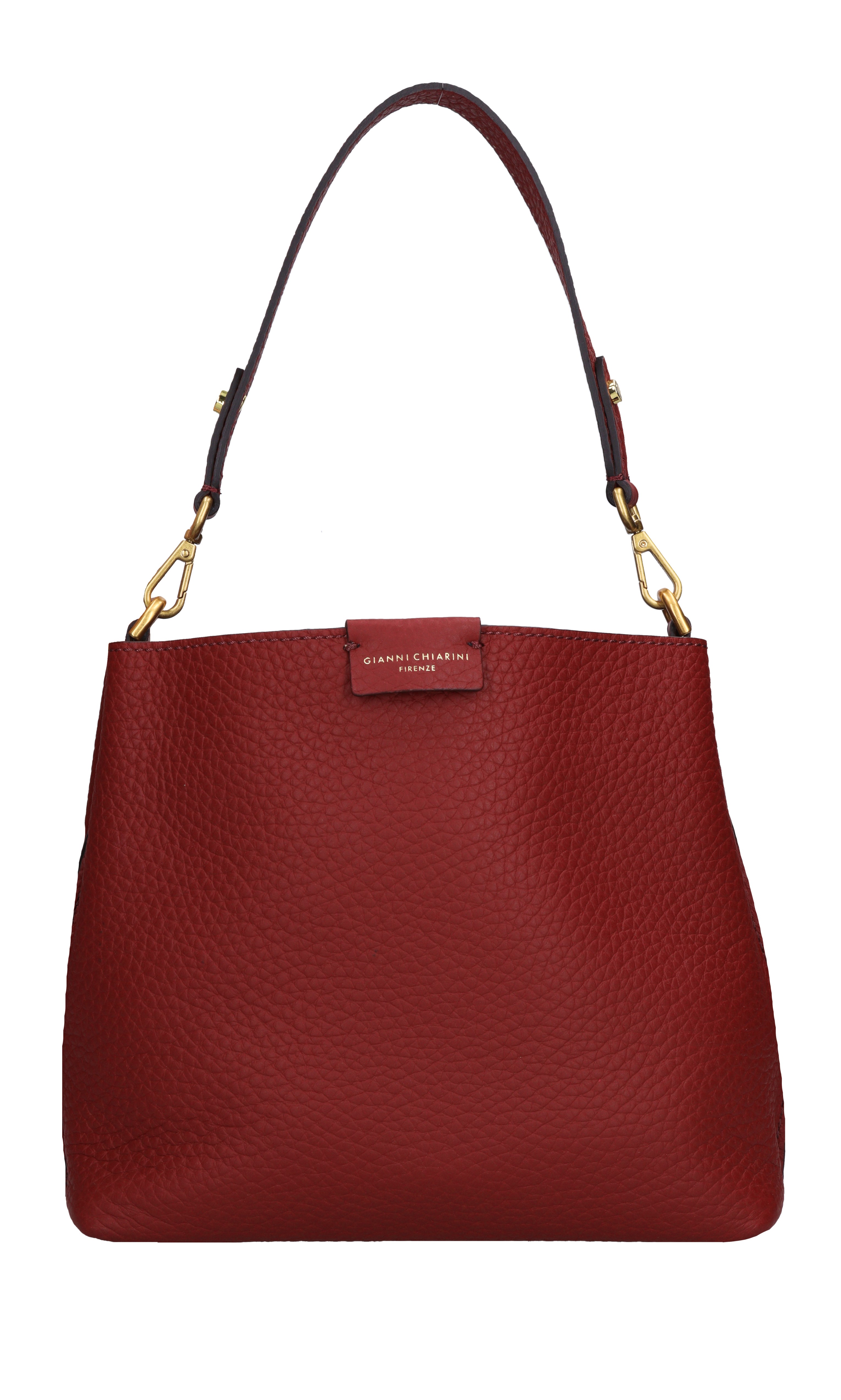 Leather bag. Hammered. 3 compartments. Zip and snap button closure. Adjustable and removable leather shoulder strap. Removable leather handle. Shipped in a transparent bag.