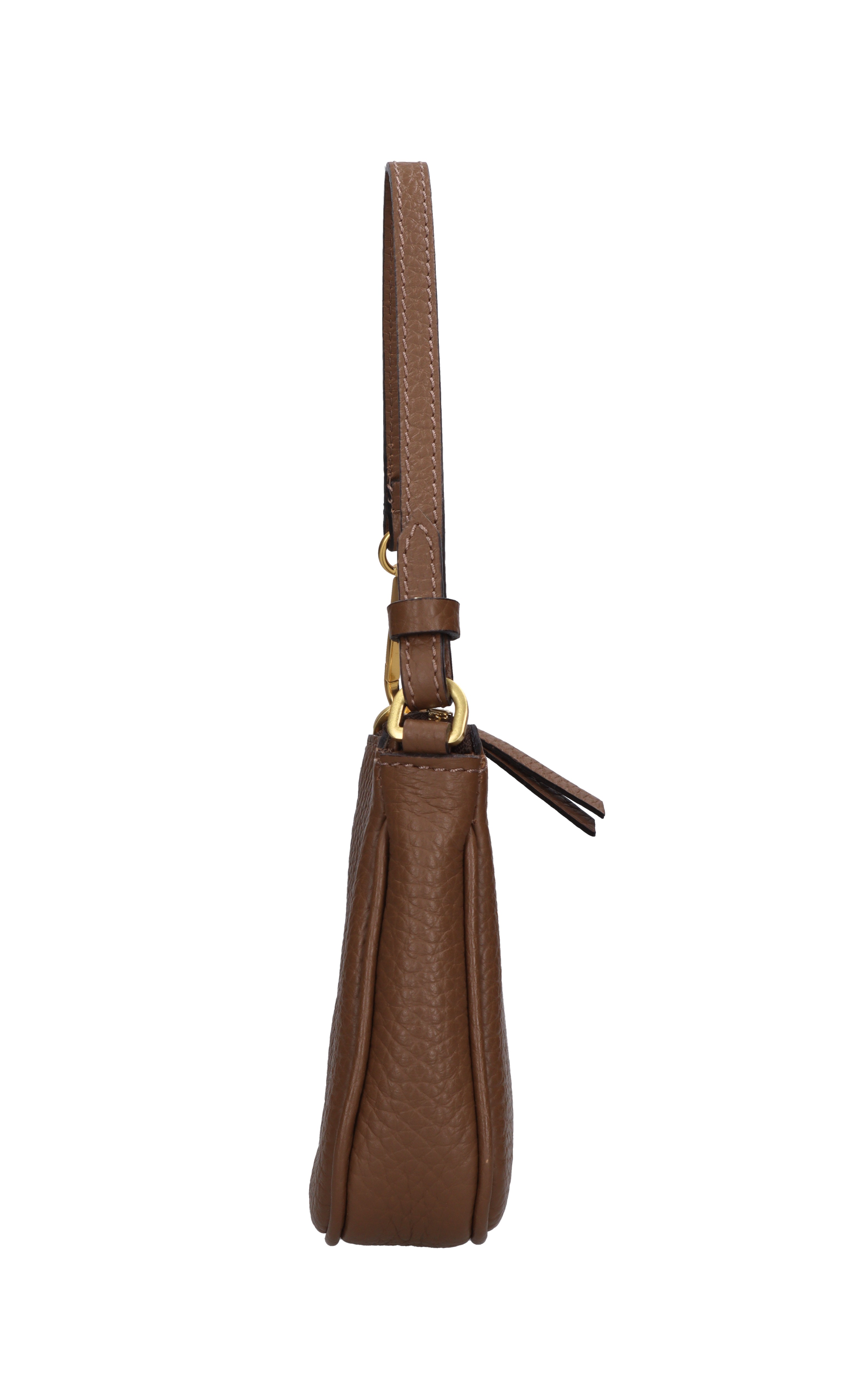 Leather bag. Hammered finish. 1 compartment. Zip closure. Adjustable and removable leather shoulder strap. Removable handle. Shipped in a transparent bag.