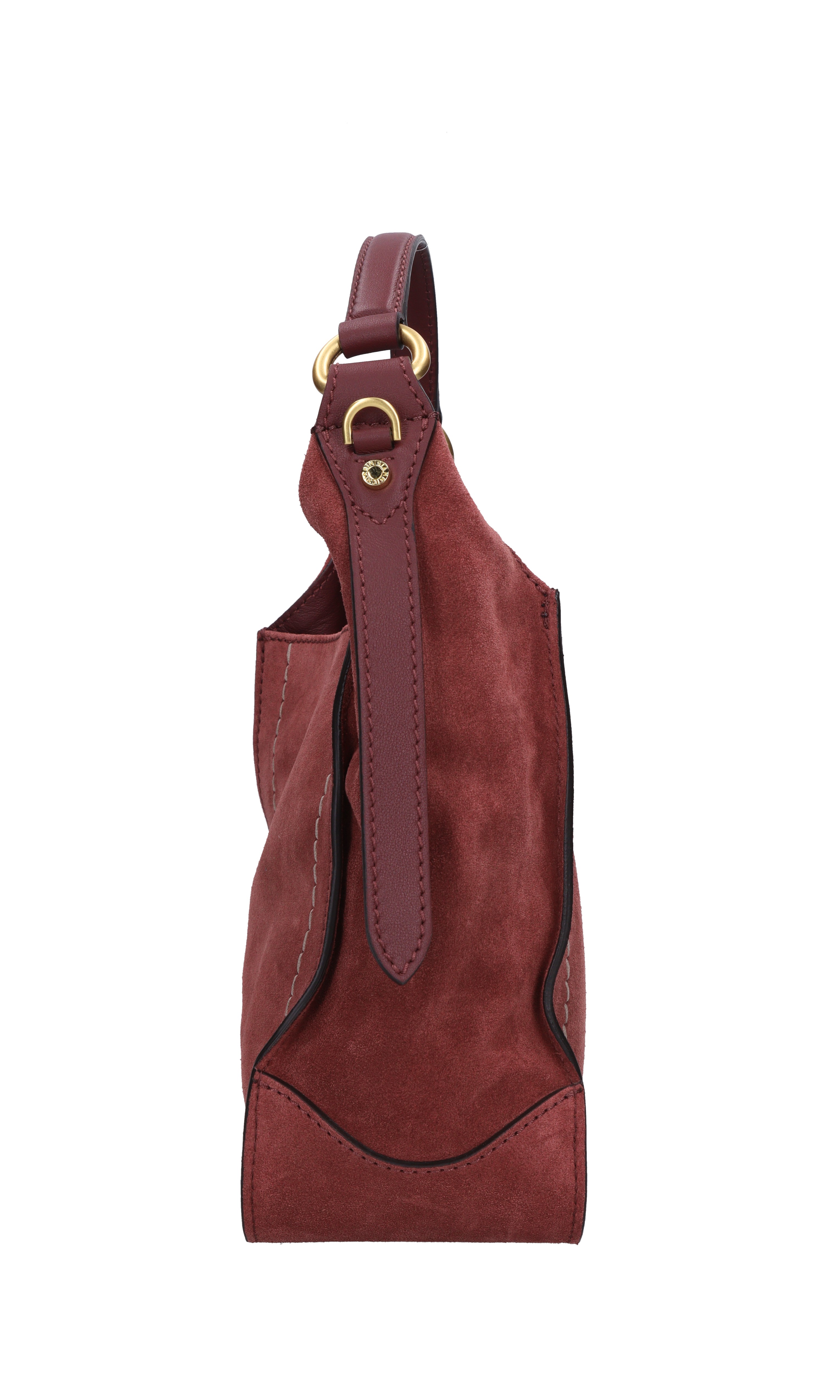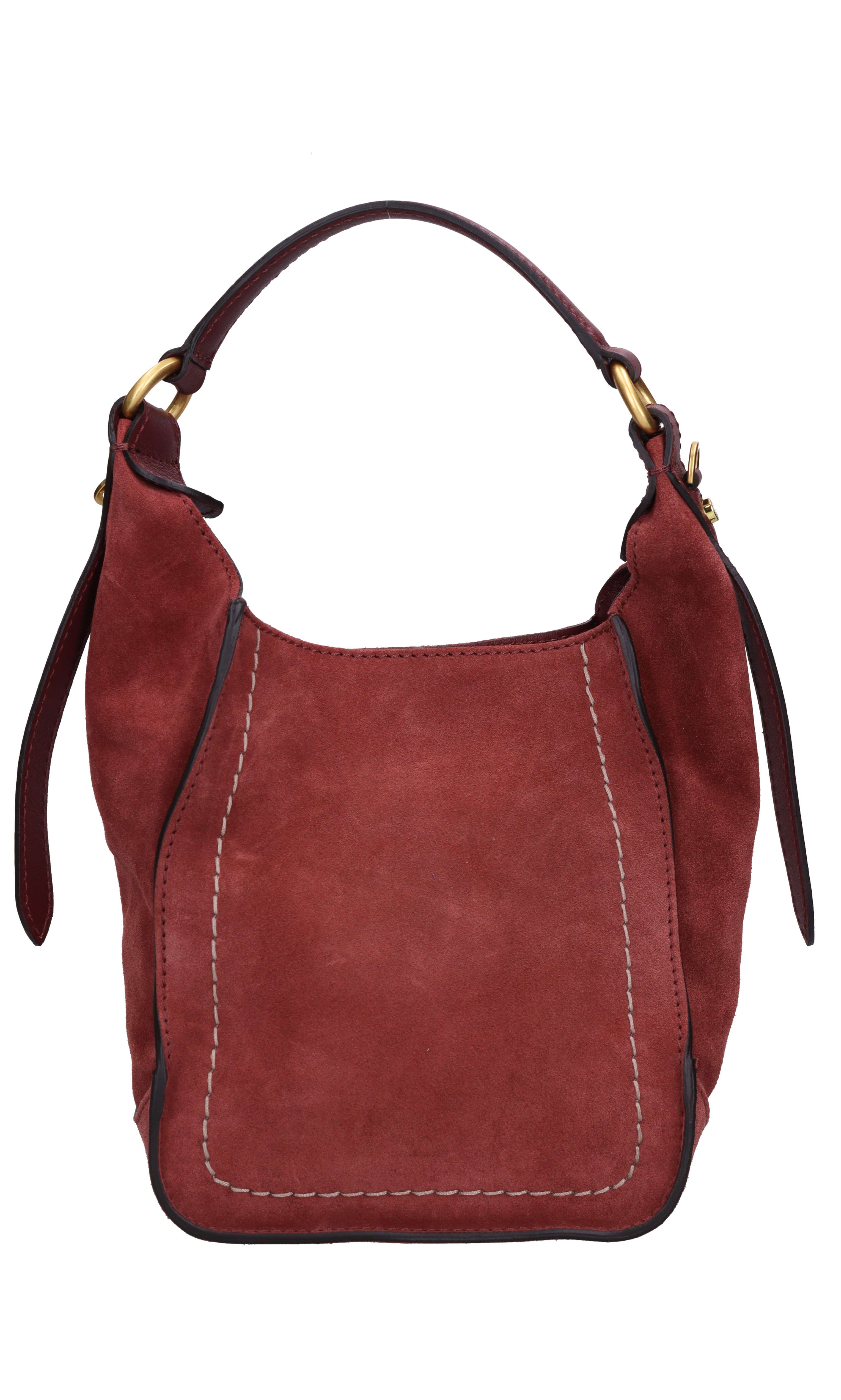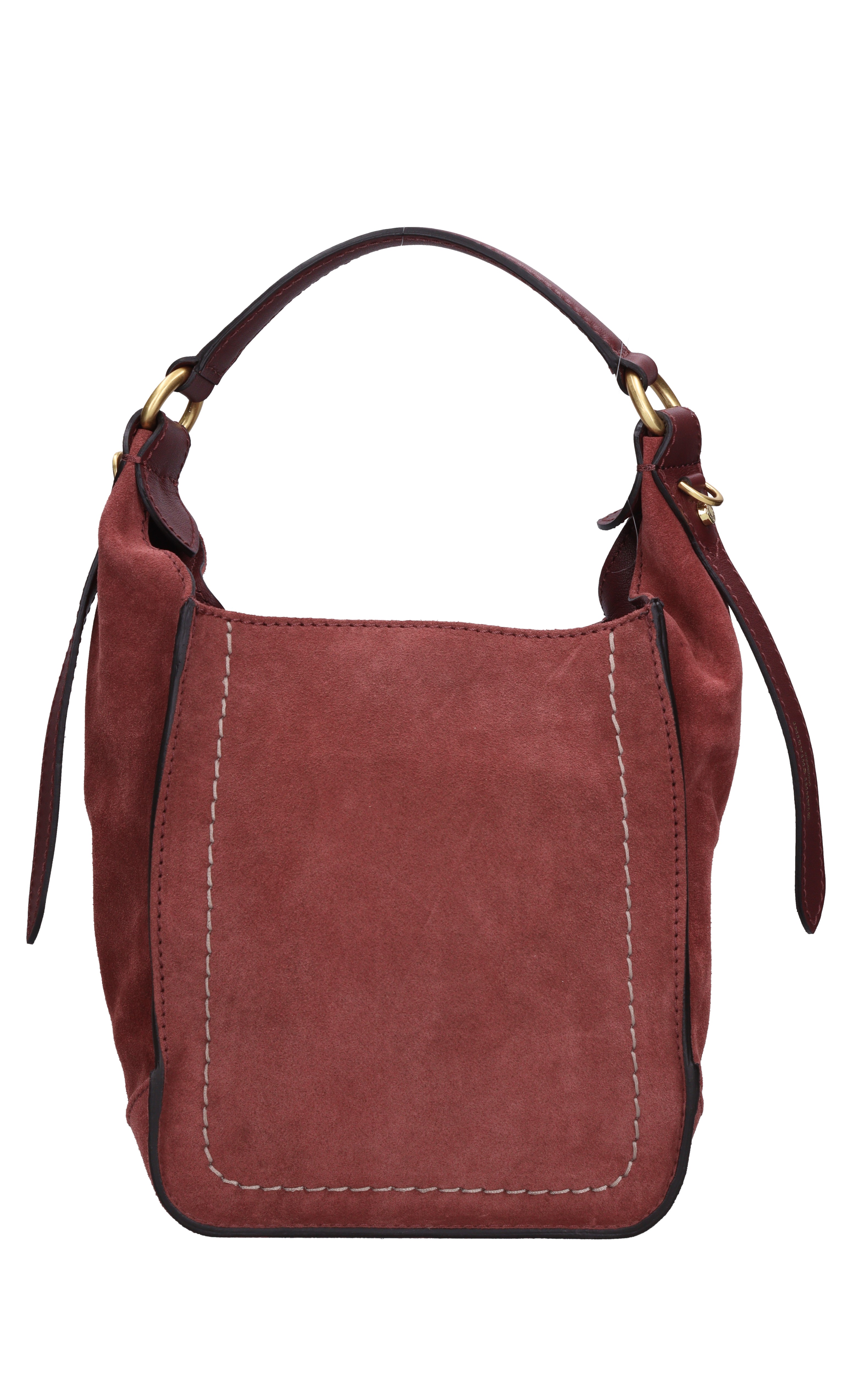 Suede bag. 1 compartment. Snap button closure. Adjustable and removable fabric shoulder strap.