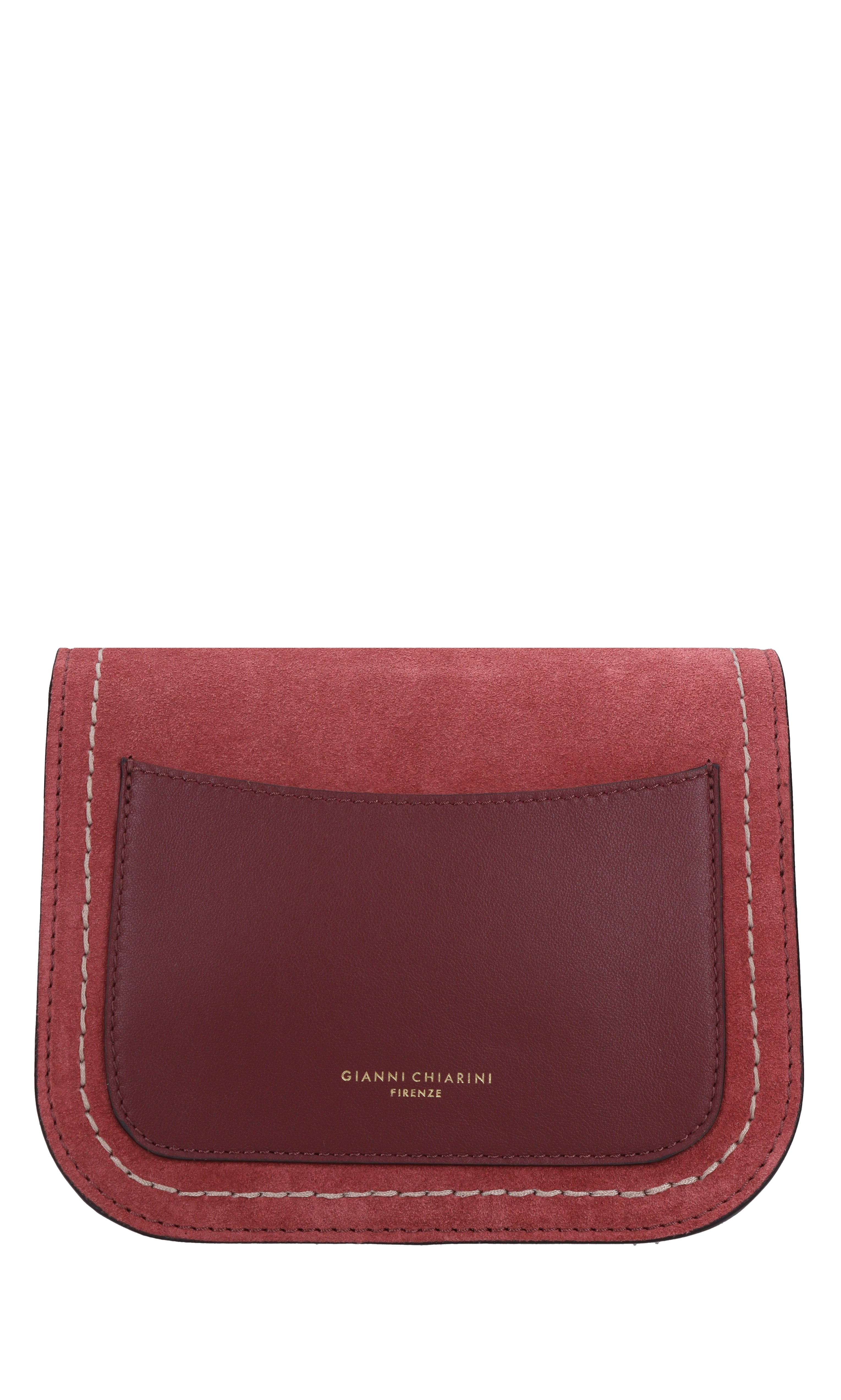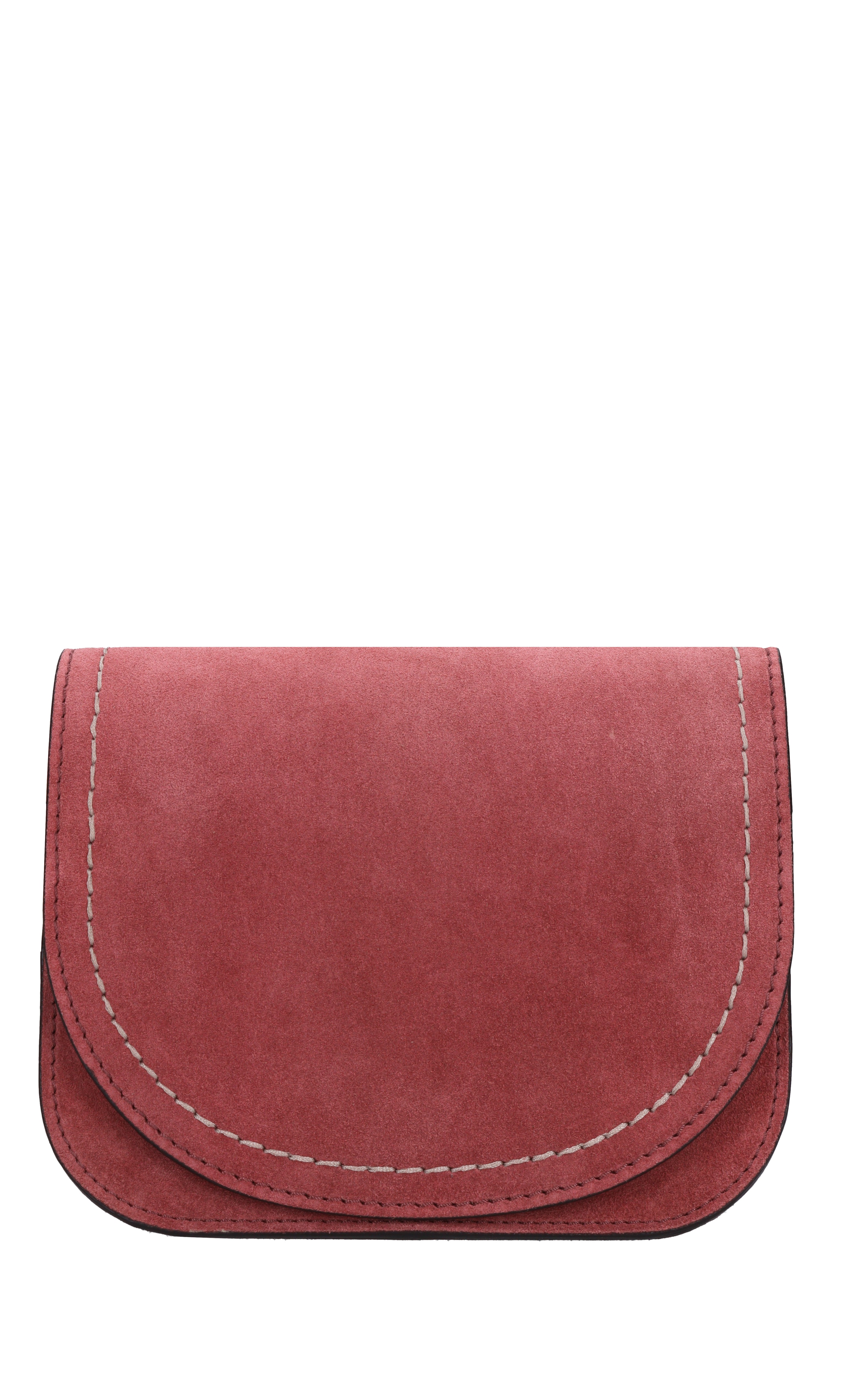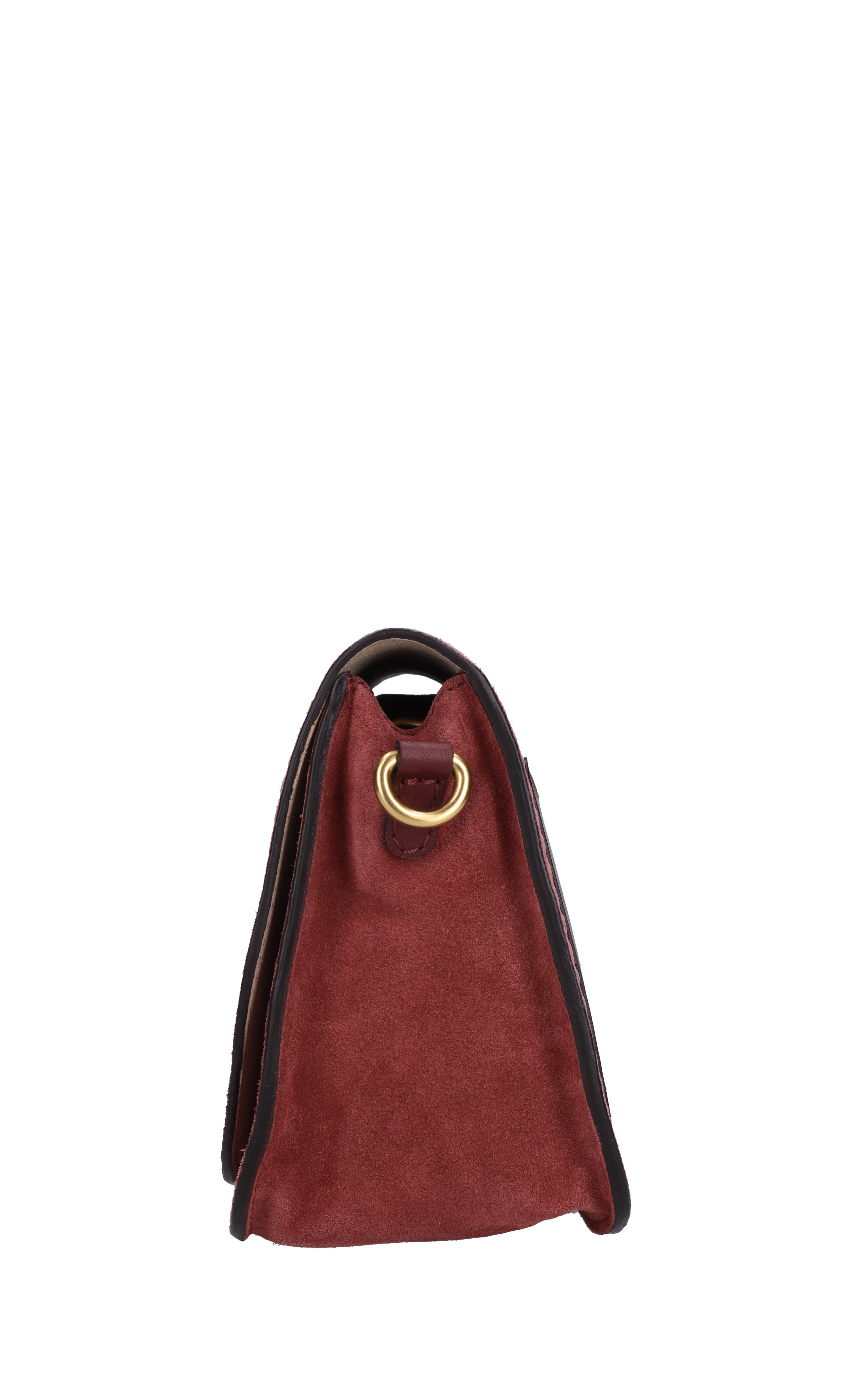 Suede bag. 1 compartment. Flap closure with snap button. Adjustable and removable fabric shoulder strap.
