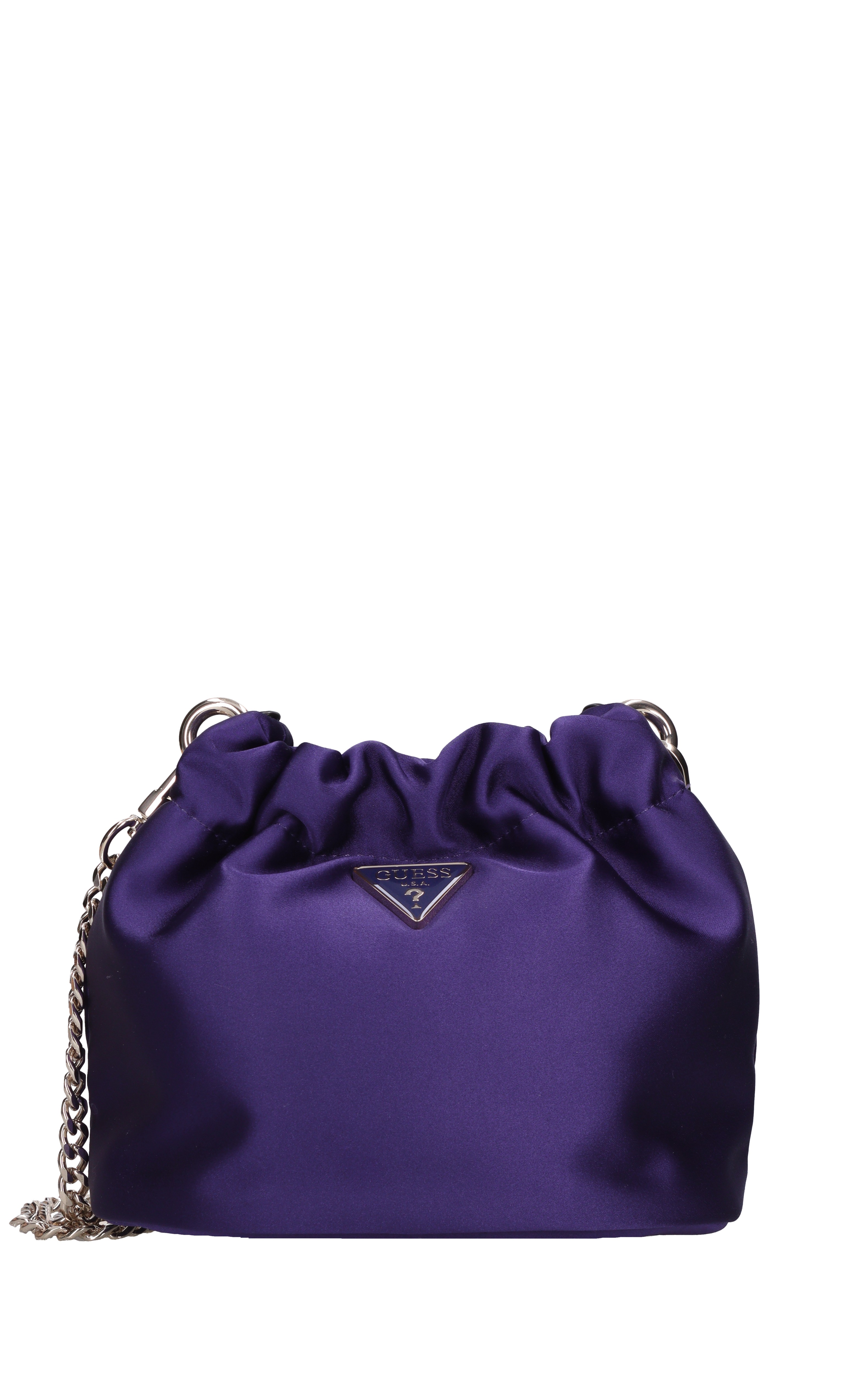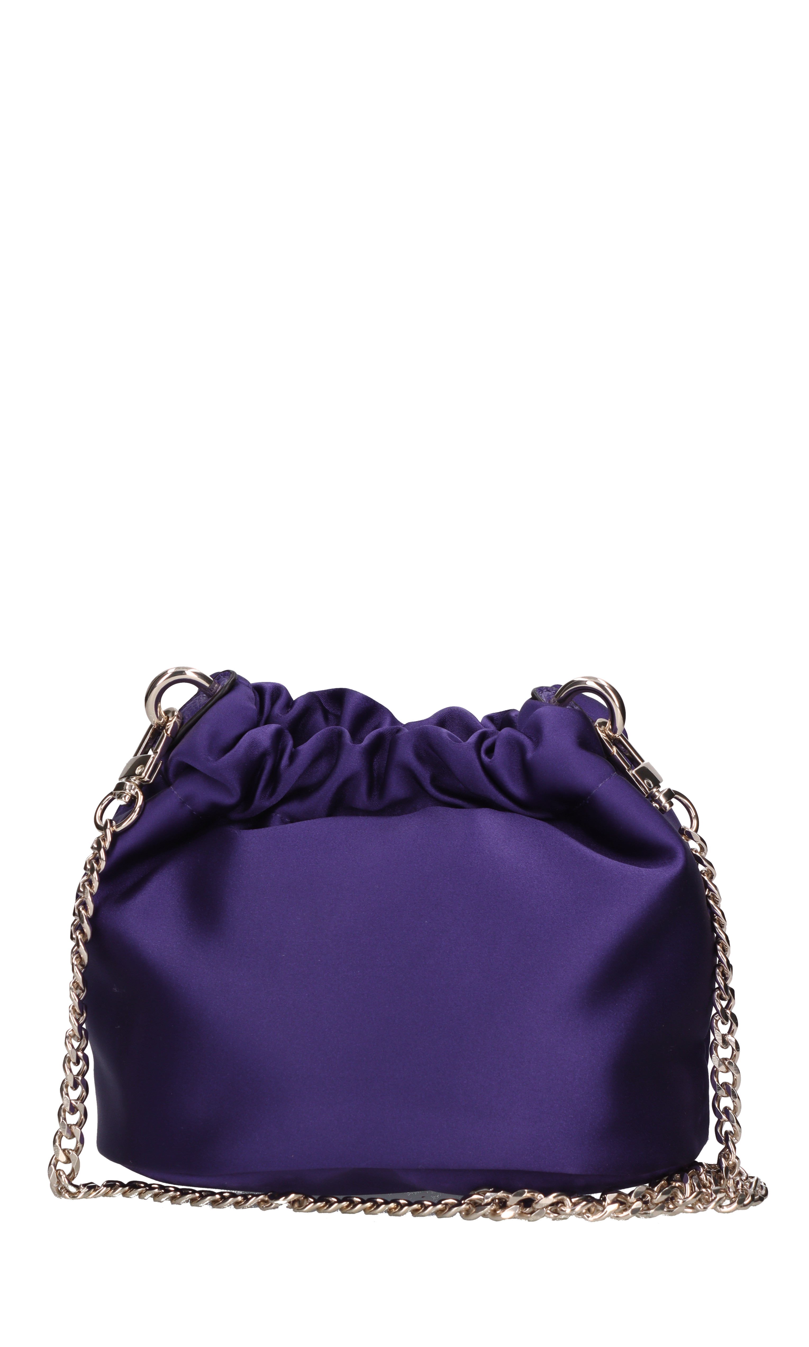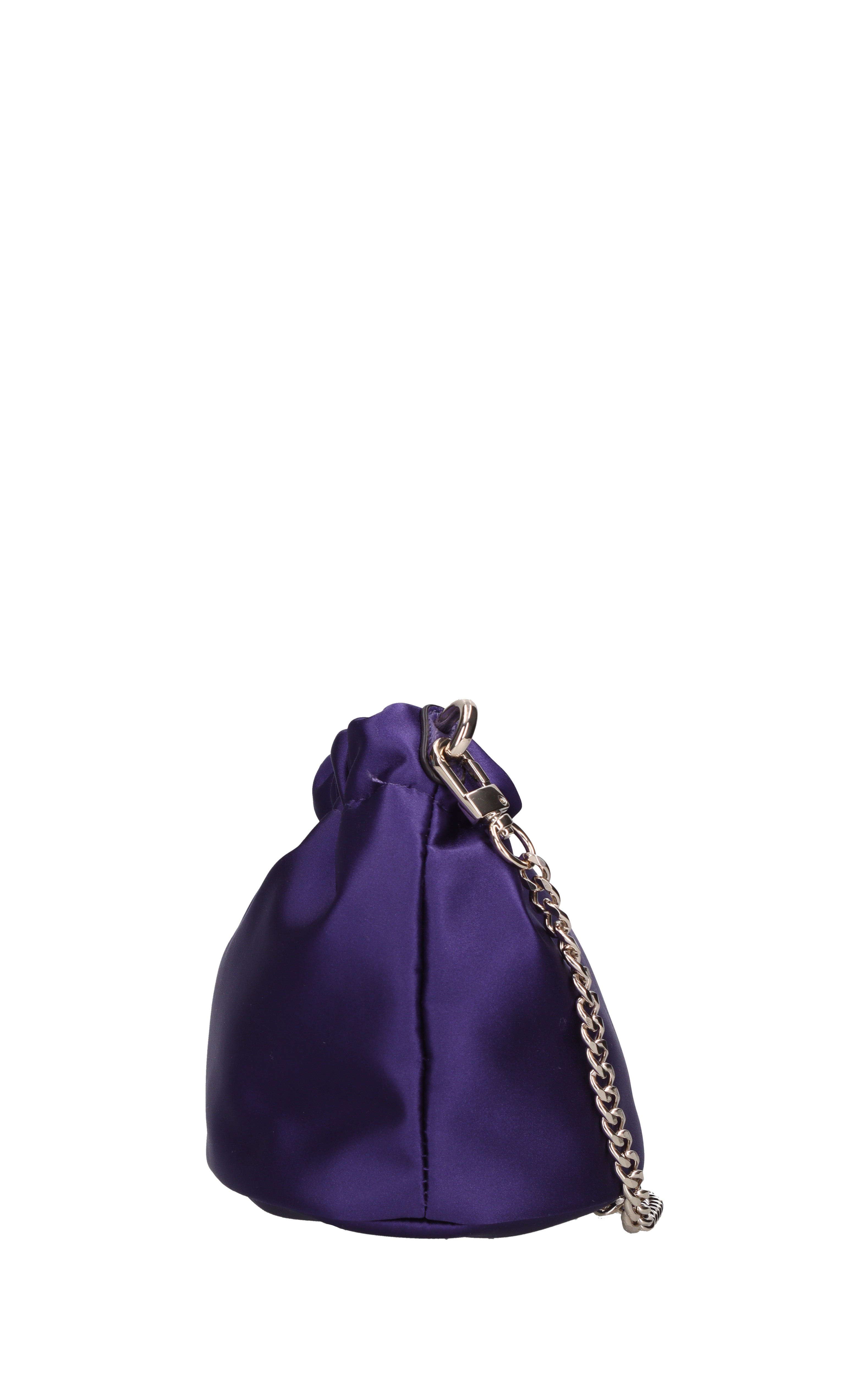 Fabric bag. 1 compartment. Snap button closure. Removable golden chain shoulder strap. Shipped in a transparent bag.