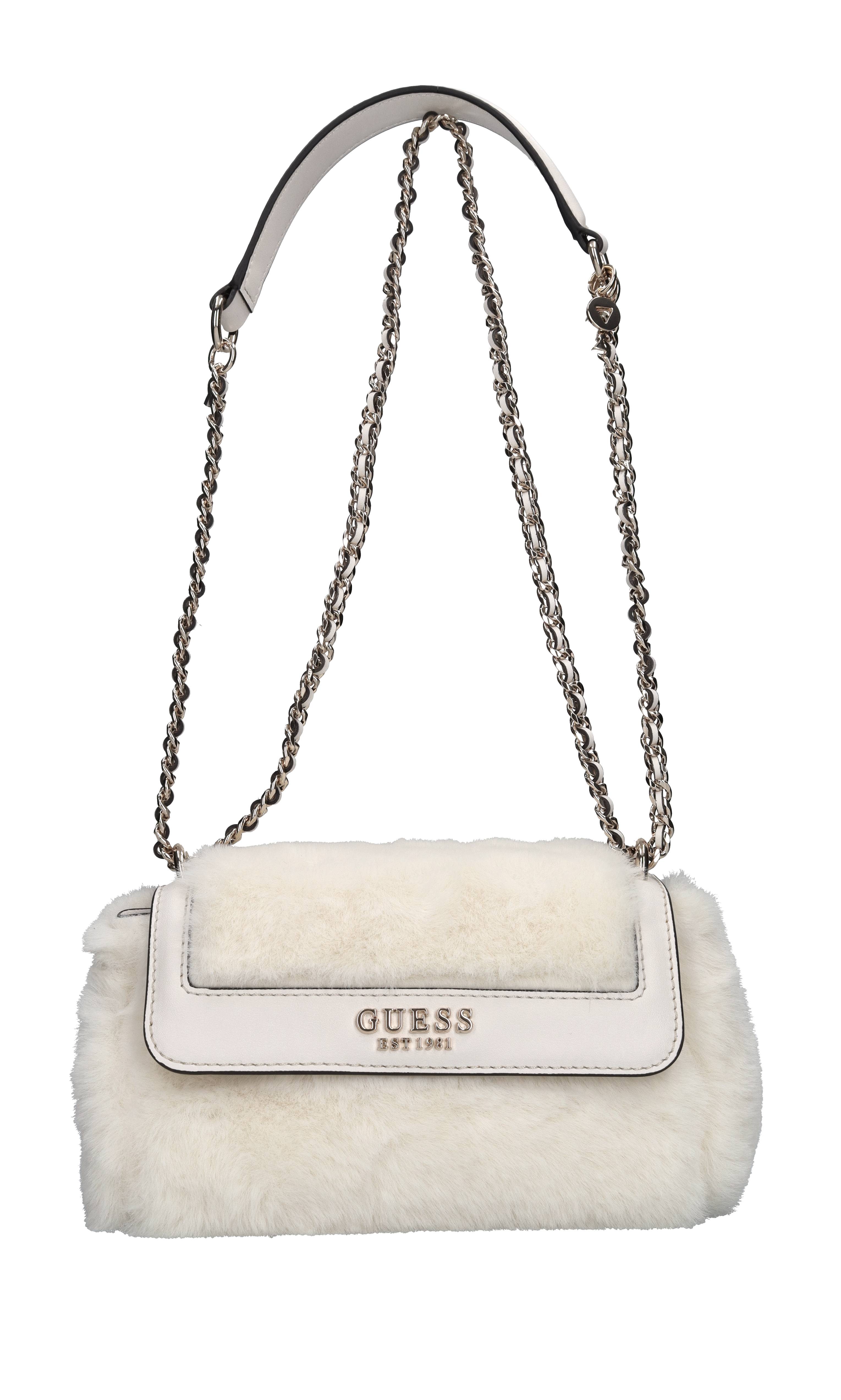 Faux fur bag. 1 compartment. Flap closure with snap button. Adjustable faux leather and gold chain shoulder strap. Shipped in a transparent bag.