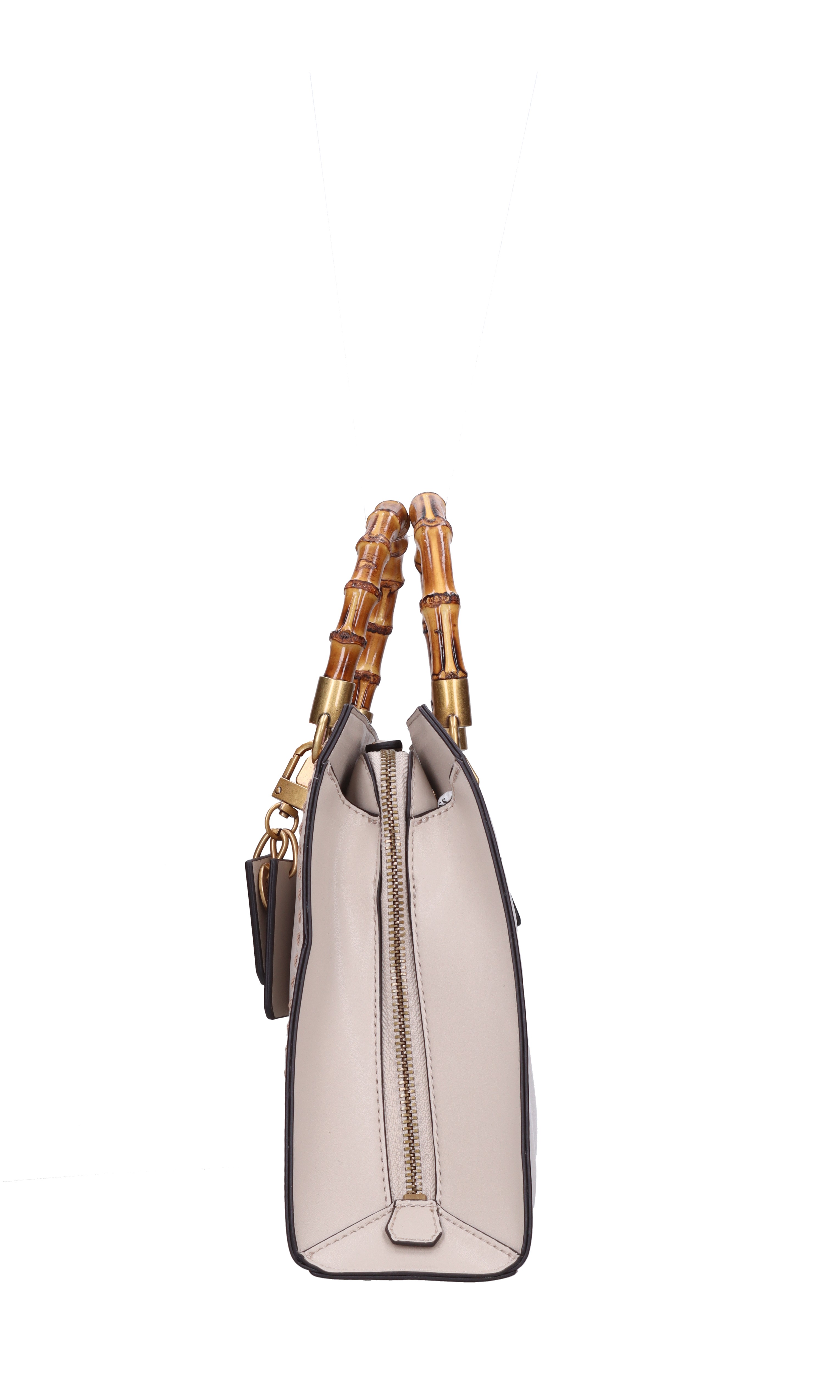 Faux leather bag. 3 Compartments. Zip and snap button closure. External back pocket. Adjustable and removable shoulder strap. Removable charm. Bamboo handles. Shipped on transparent bag.