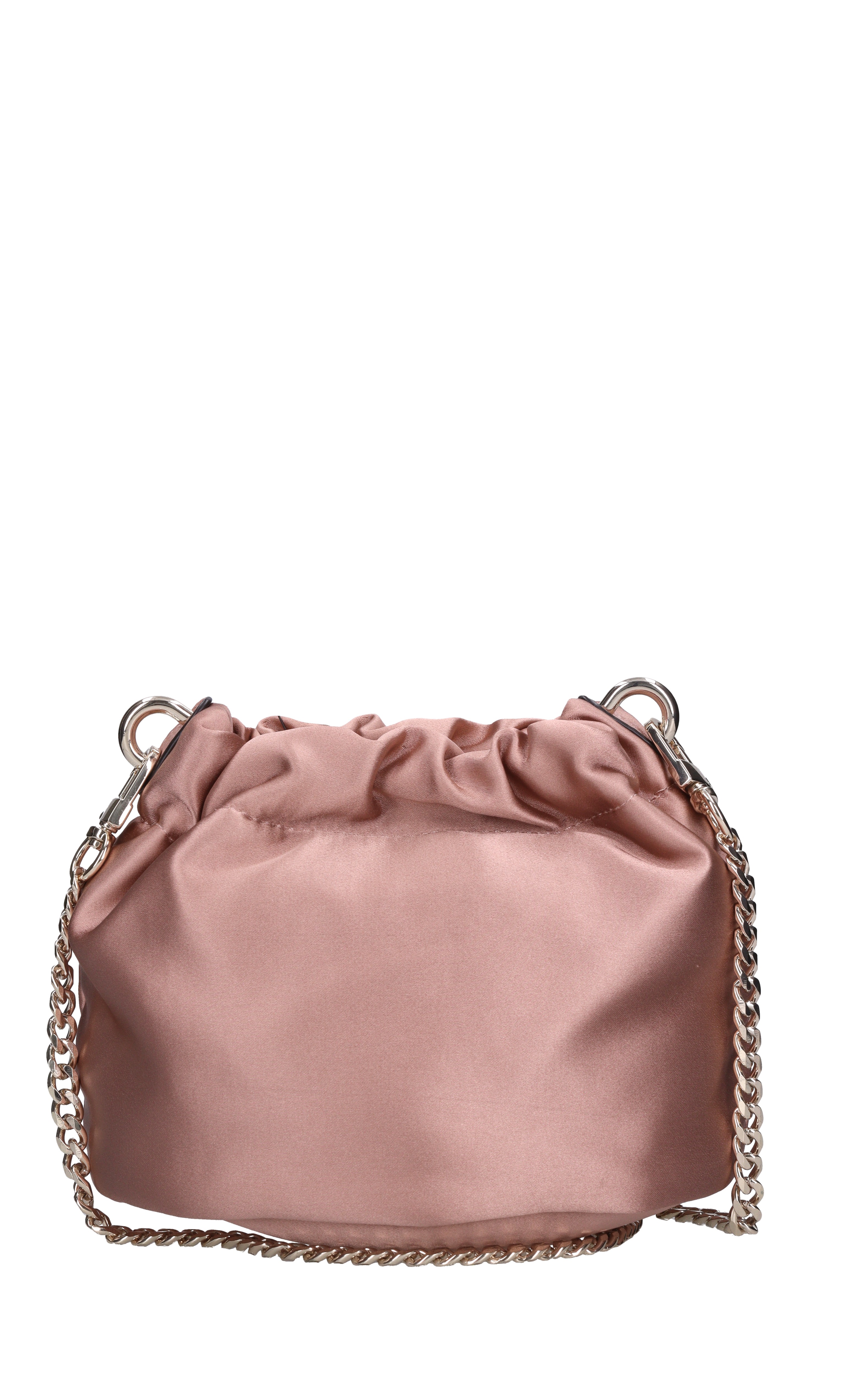 Mini satin bag. One compartment. Snap button closure. Removable silver chain shoulder strap.