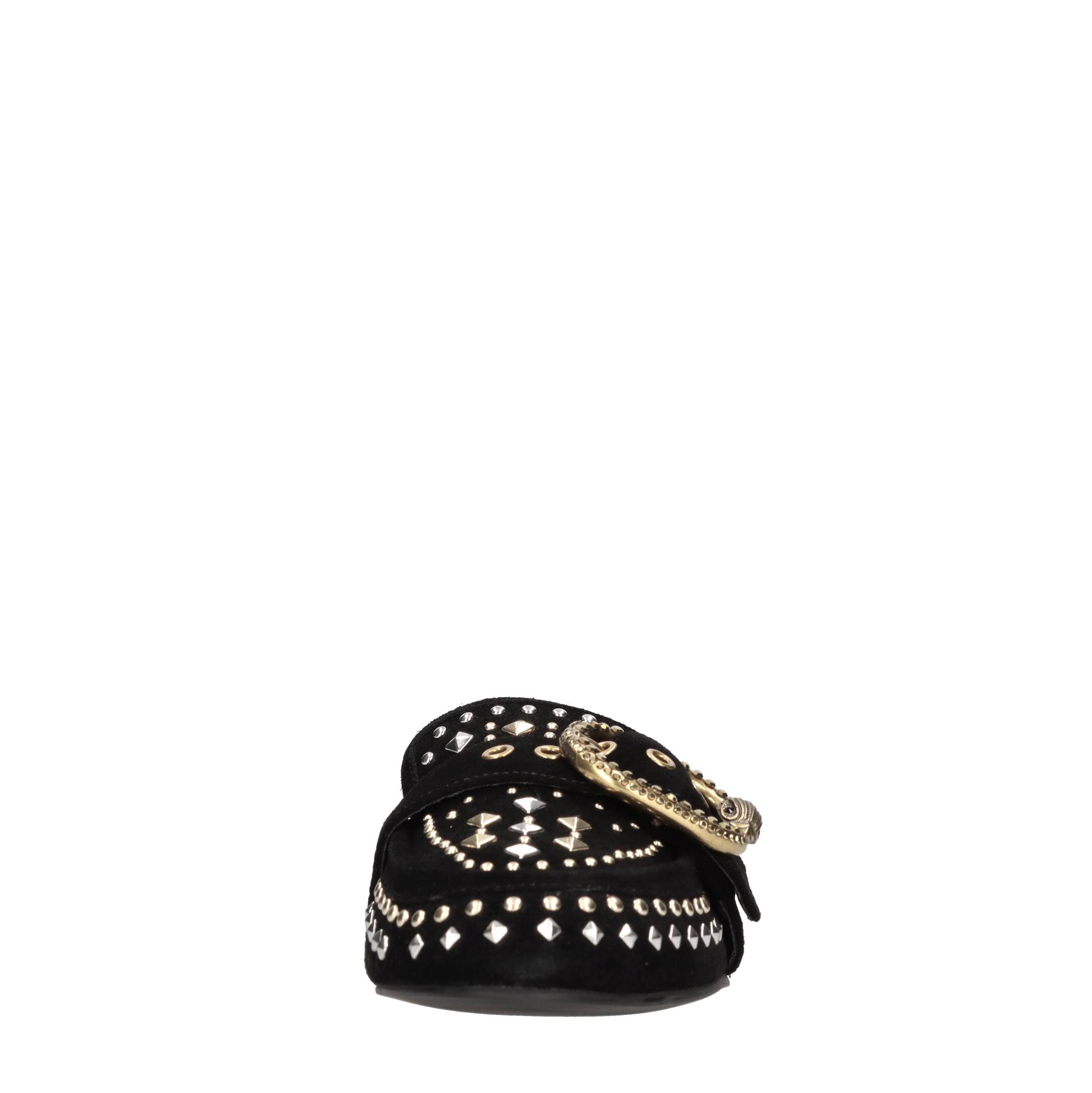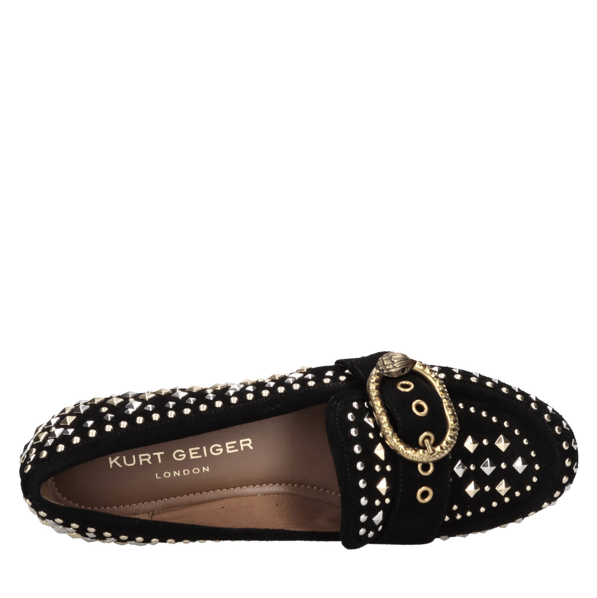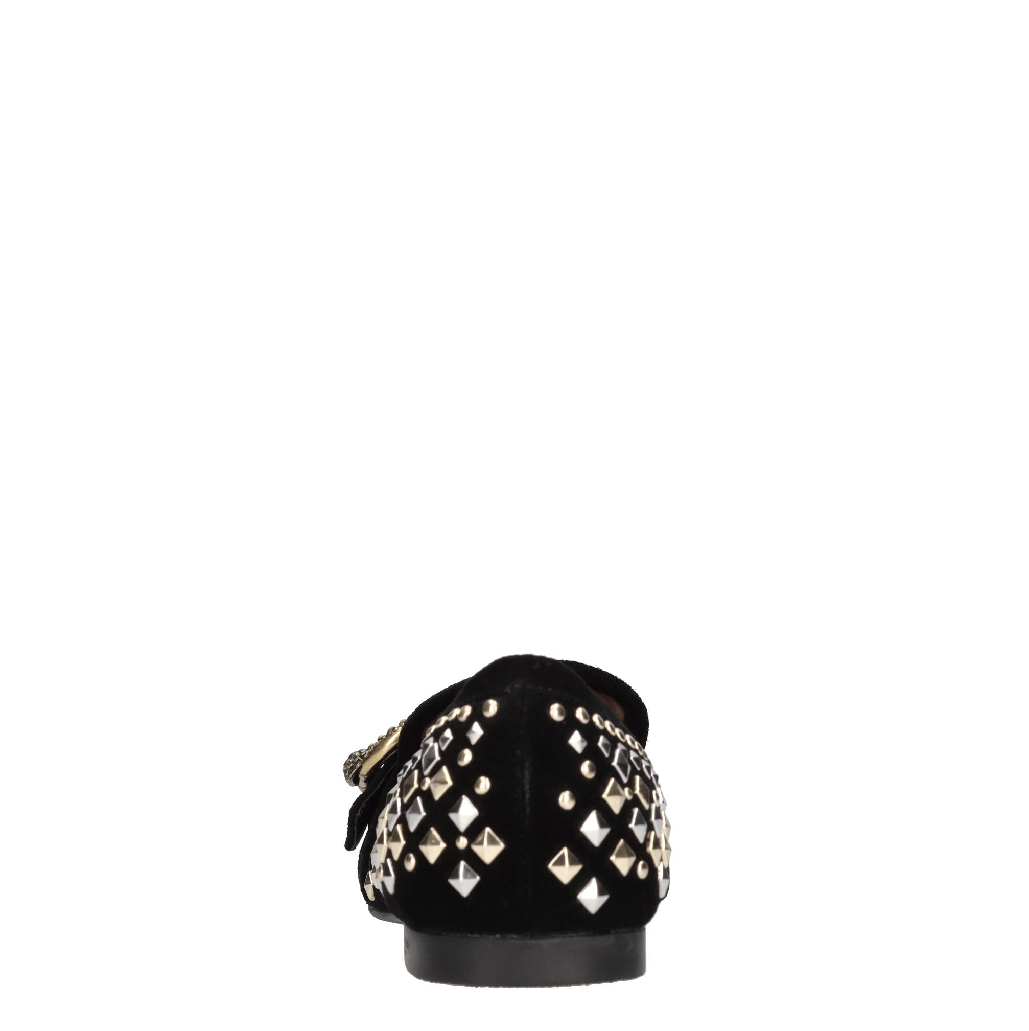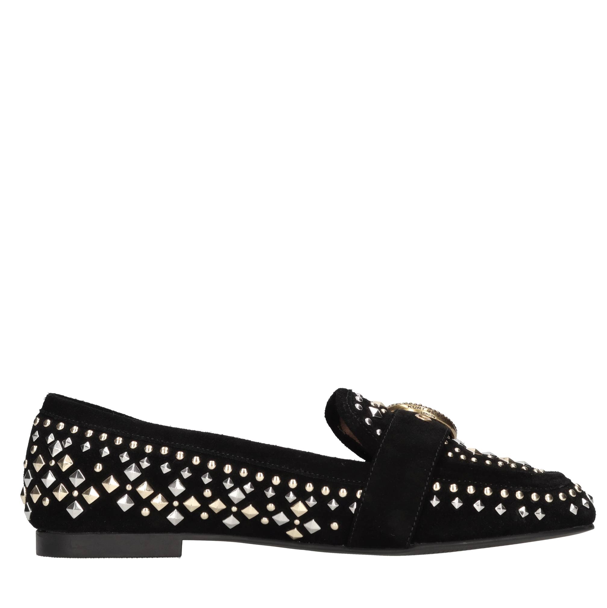 Suede moccasins. Decorative gold and silver studs and jewel buckle. Inner upper in leather and fabric. Outer sole in rubber.