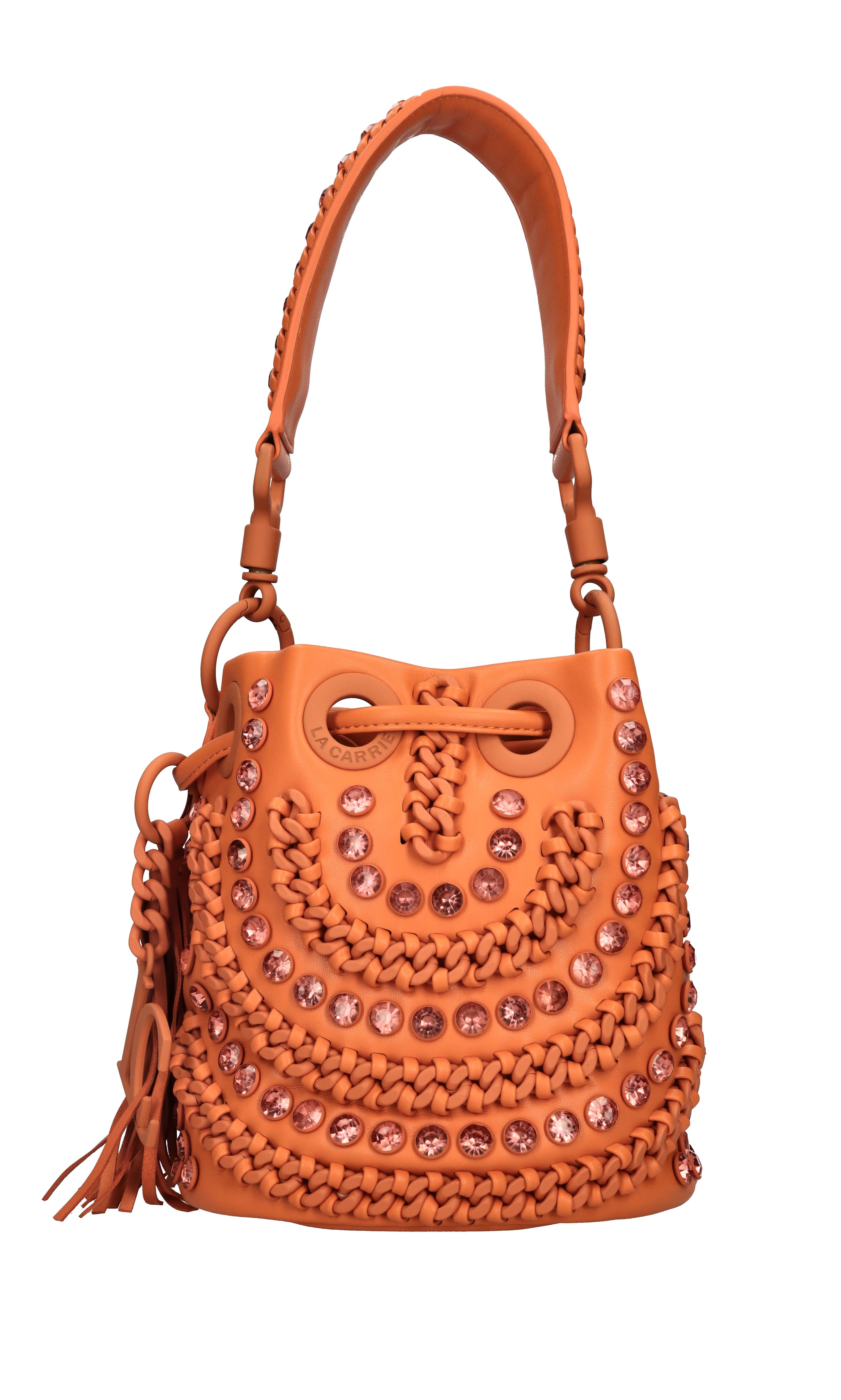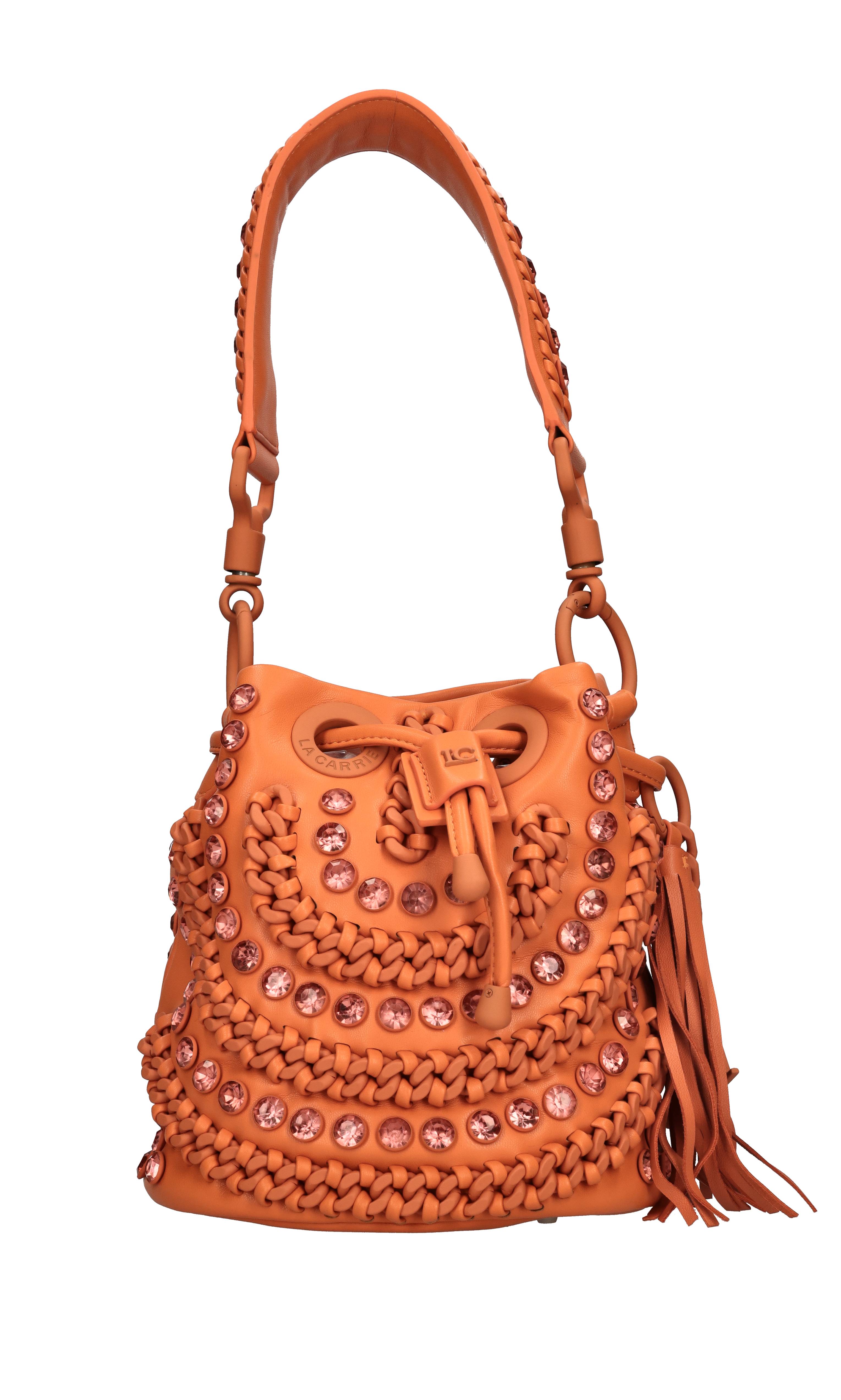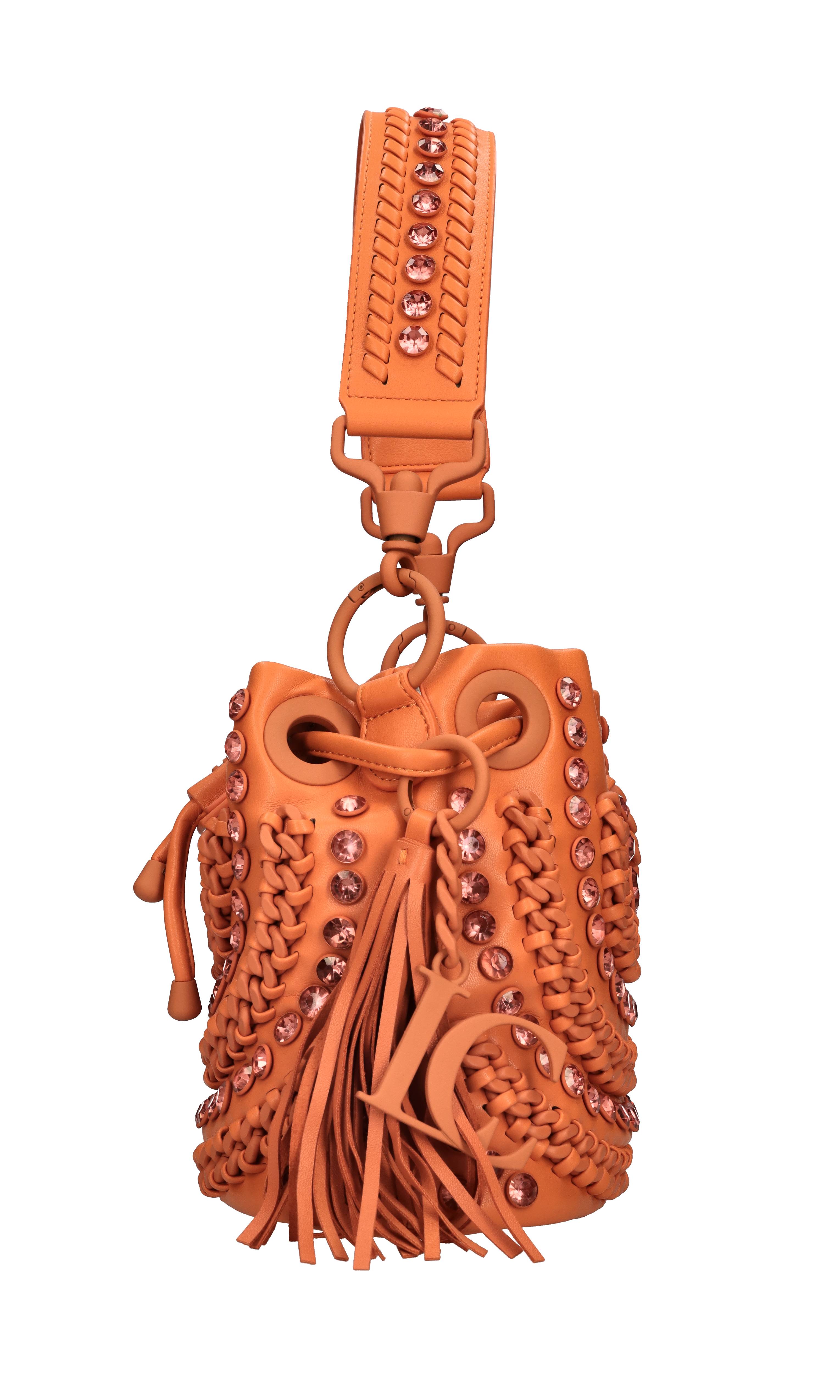 Andromeda bag in eco-leather. One compartment. Drawstring closure and snap button. Removable tone-on-tone chain shoulder strap in eco-leather. Removable charms.