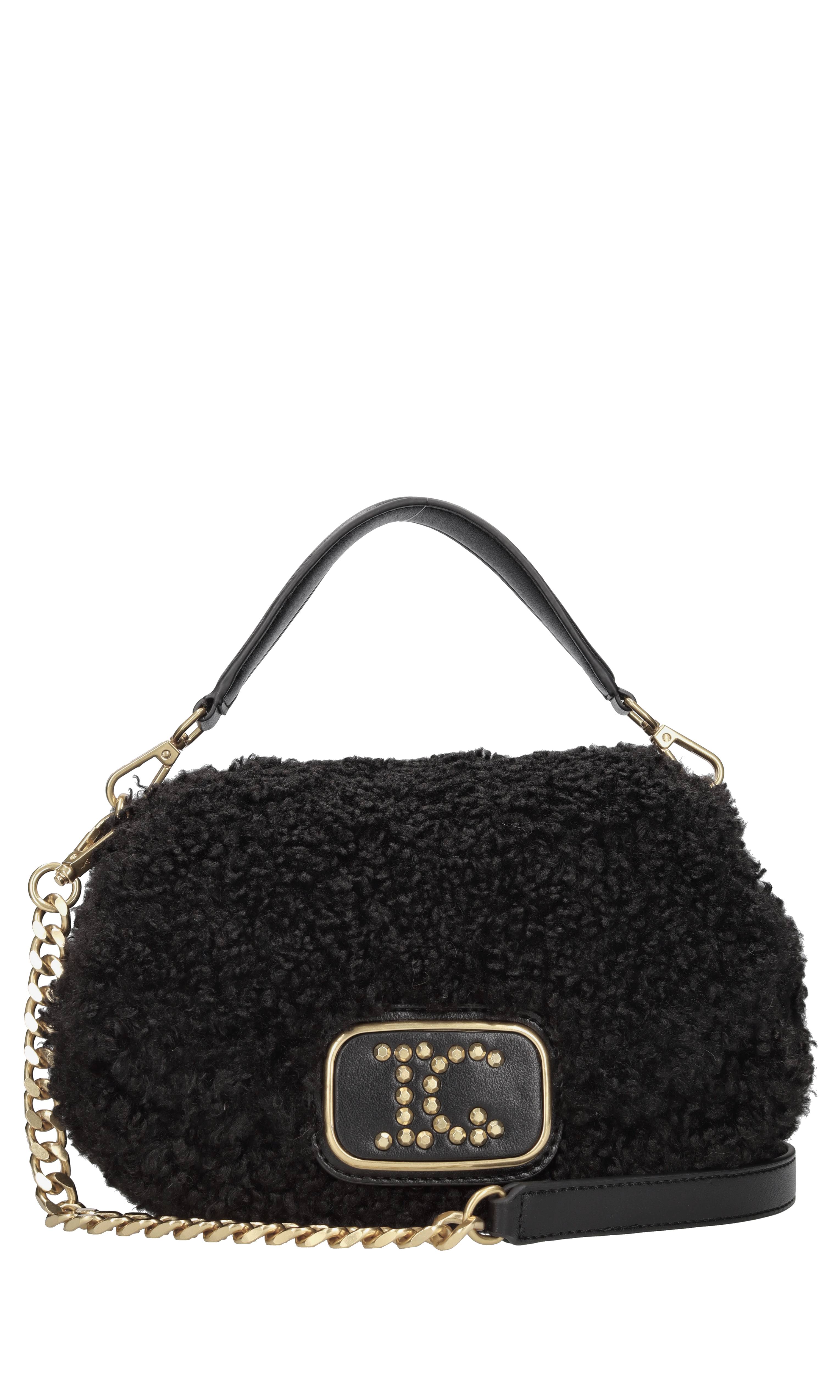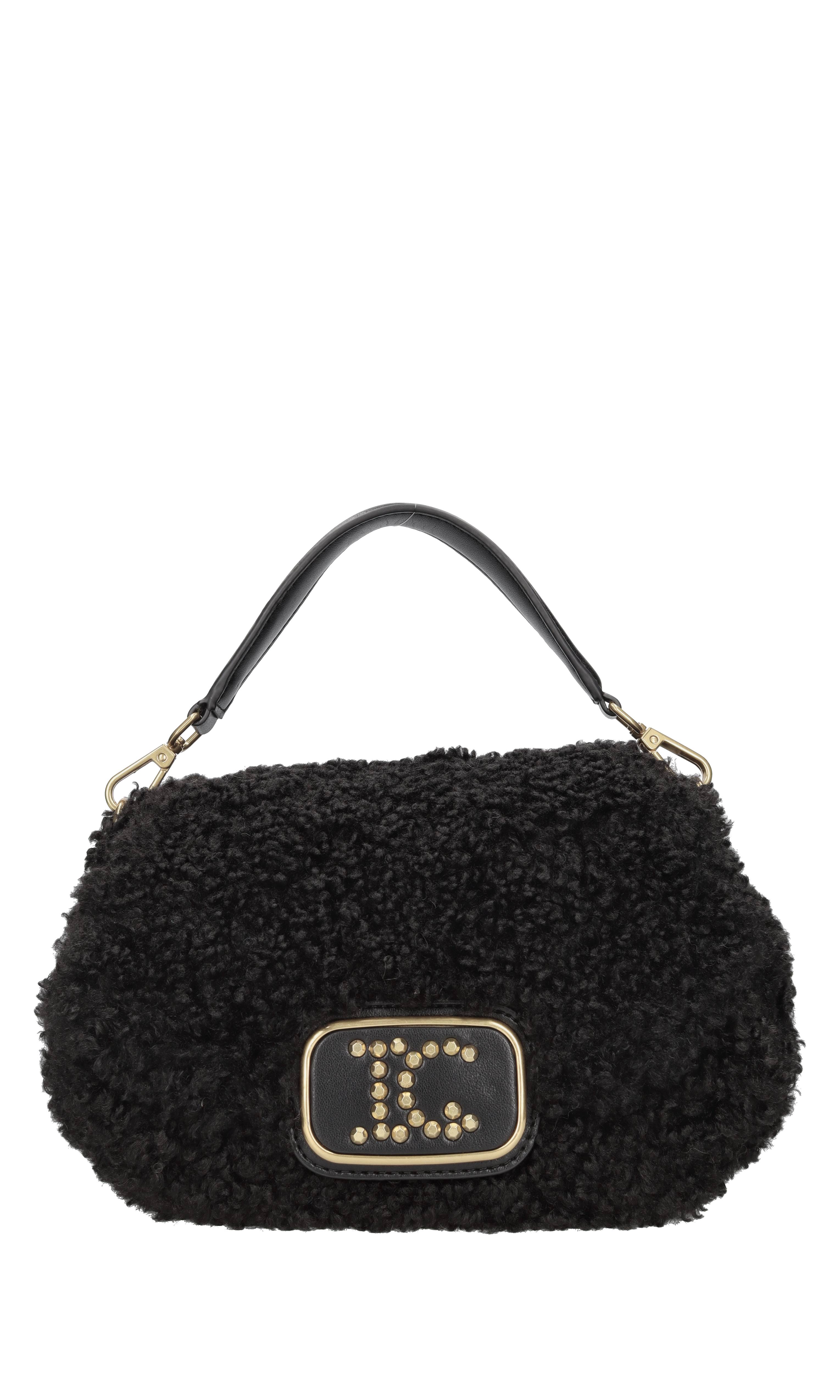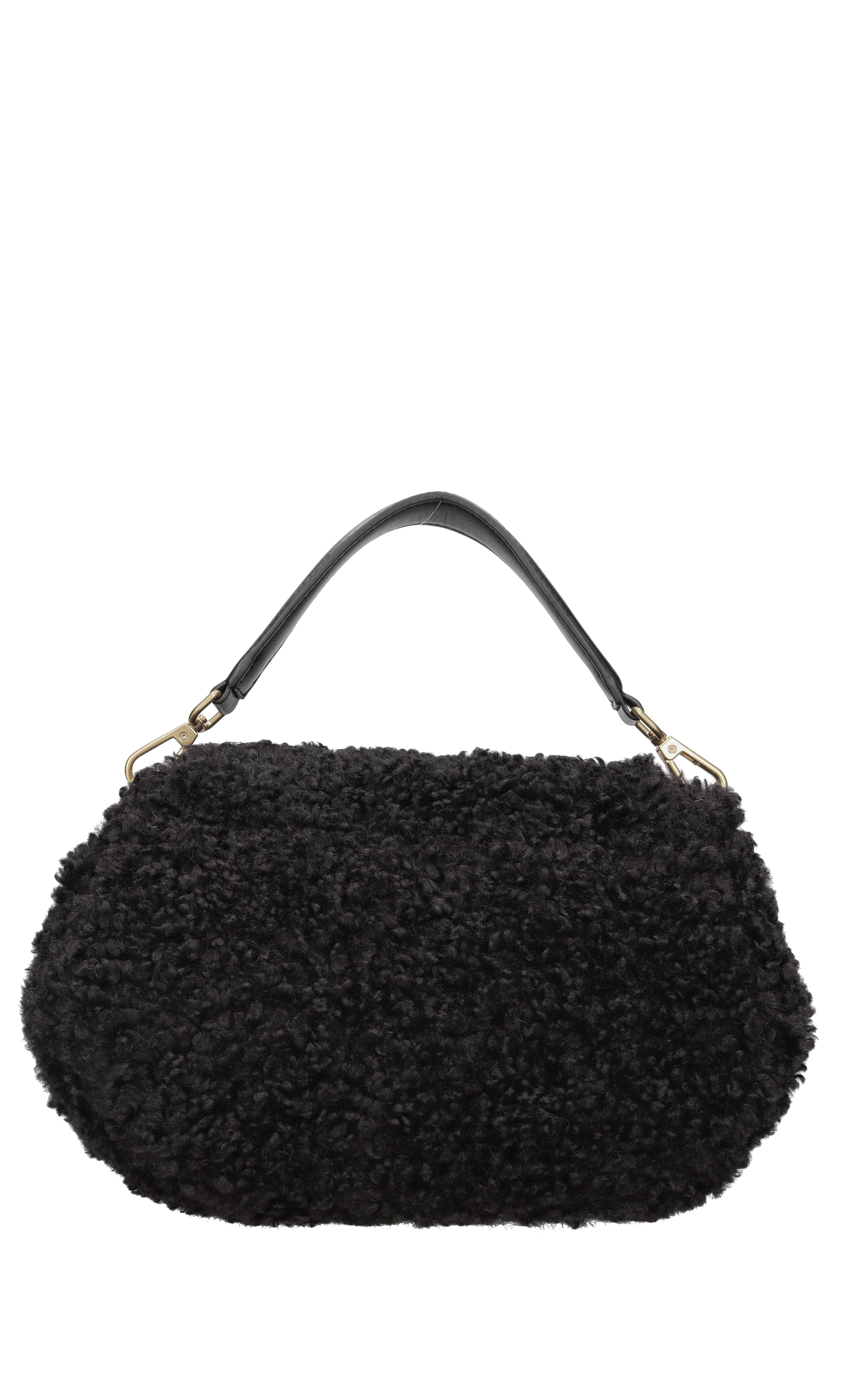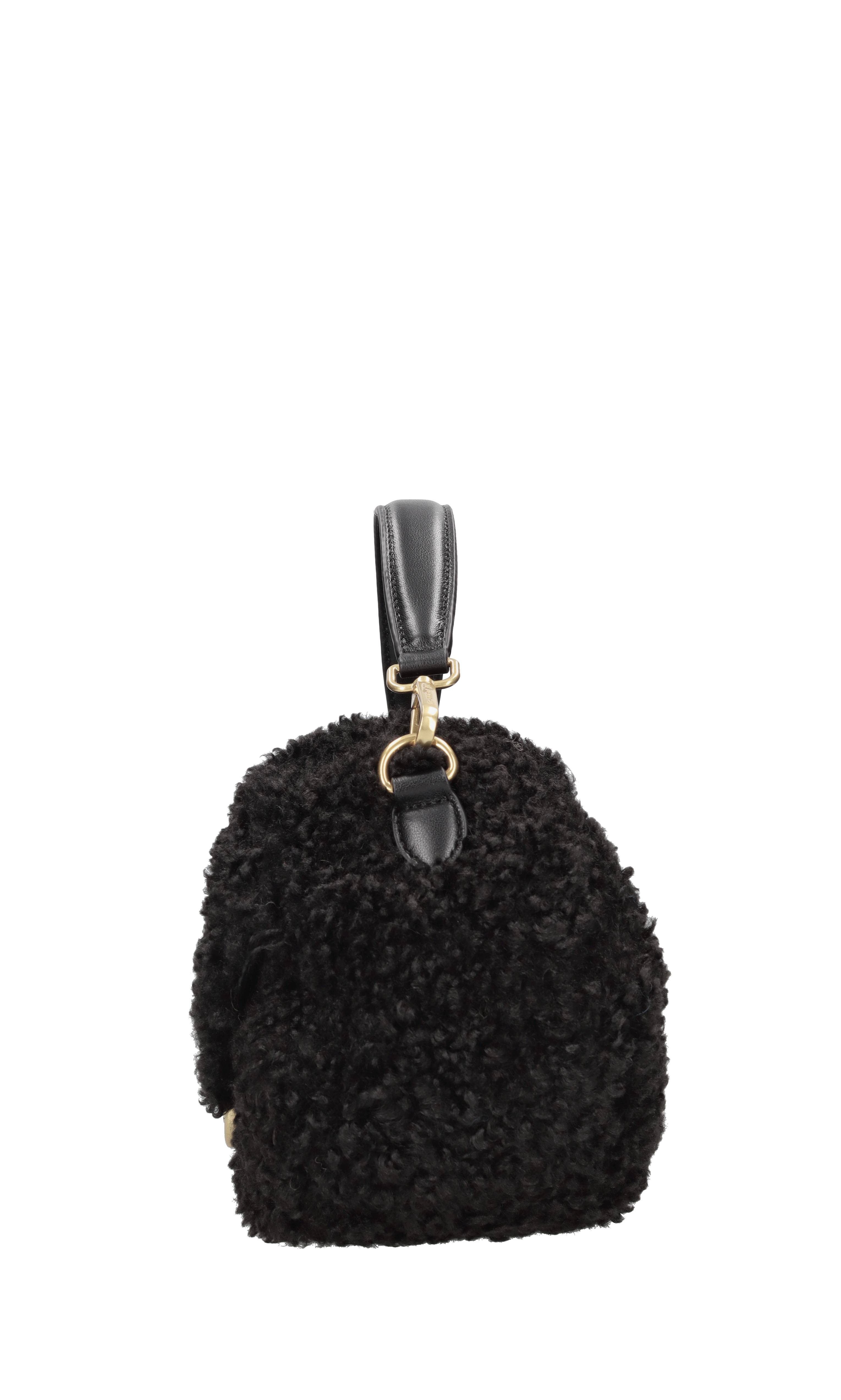 Faux fur bag. 1 compartment. Flap and magnetic button closure. Removable shoulder strap and handle.