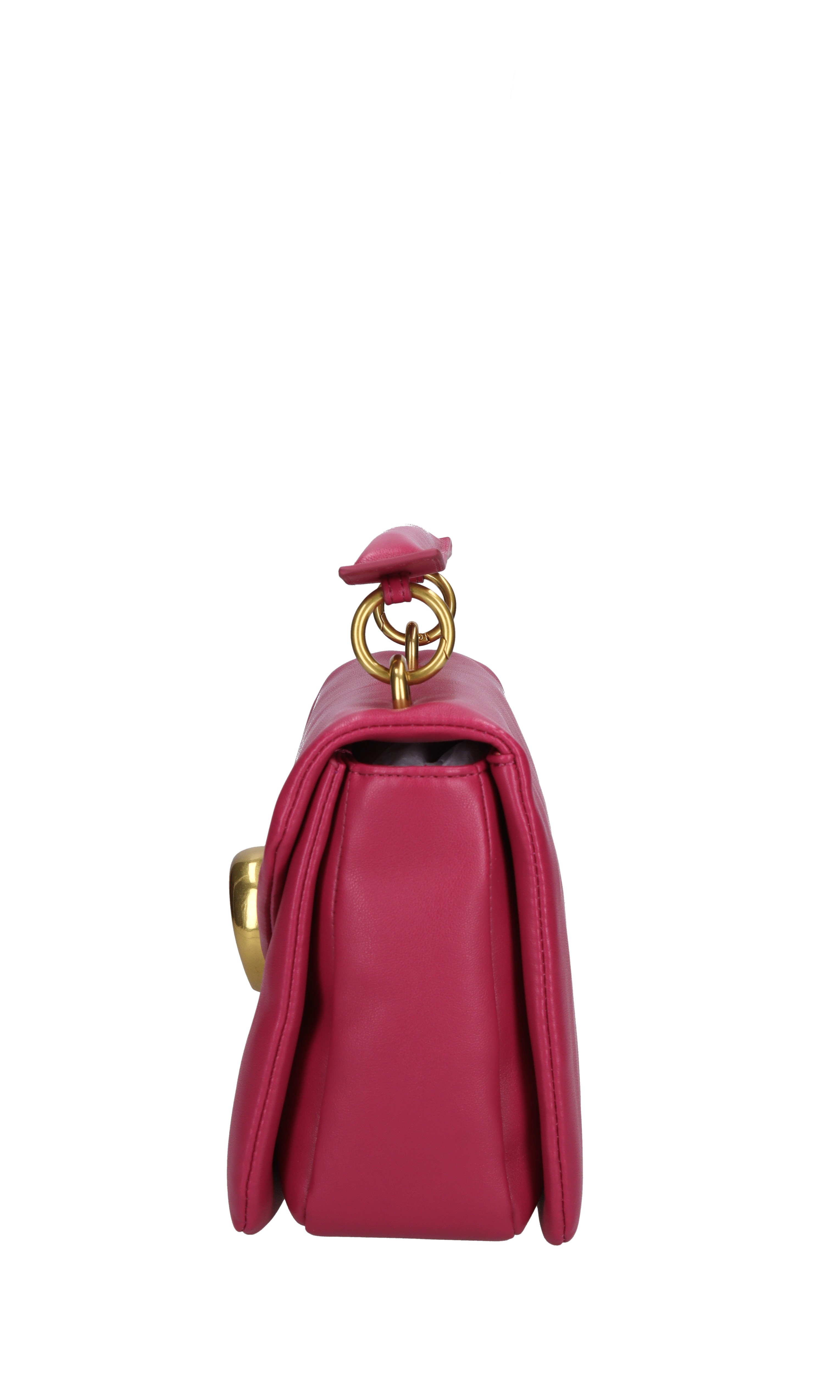 Faux leather bag. 1 compartment. Snap button closure. Faux leather handle and chain shoulder strap, both removable.