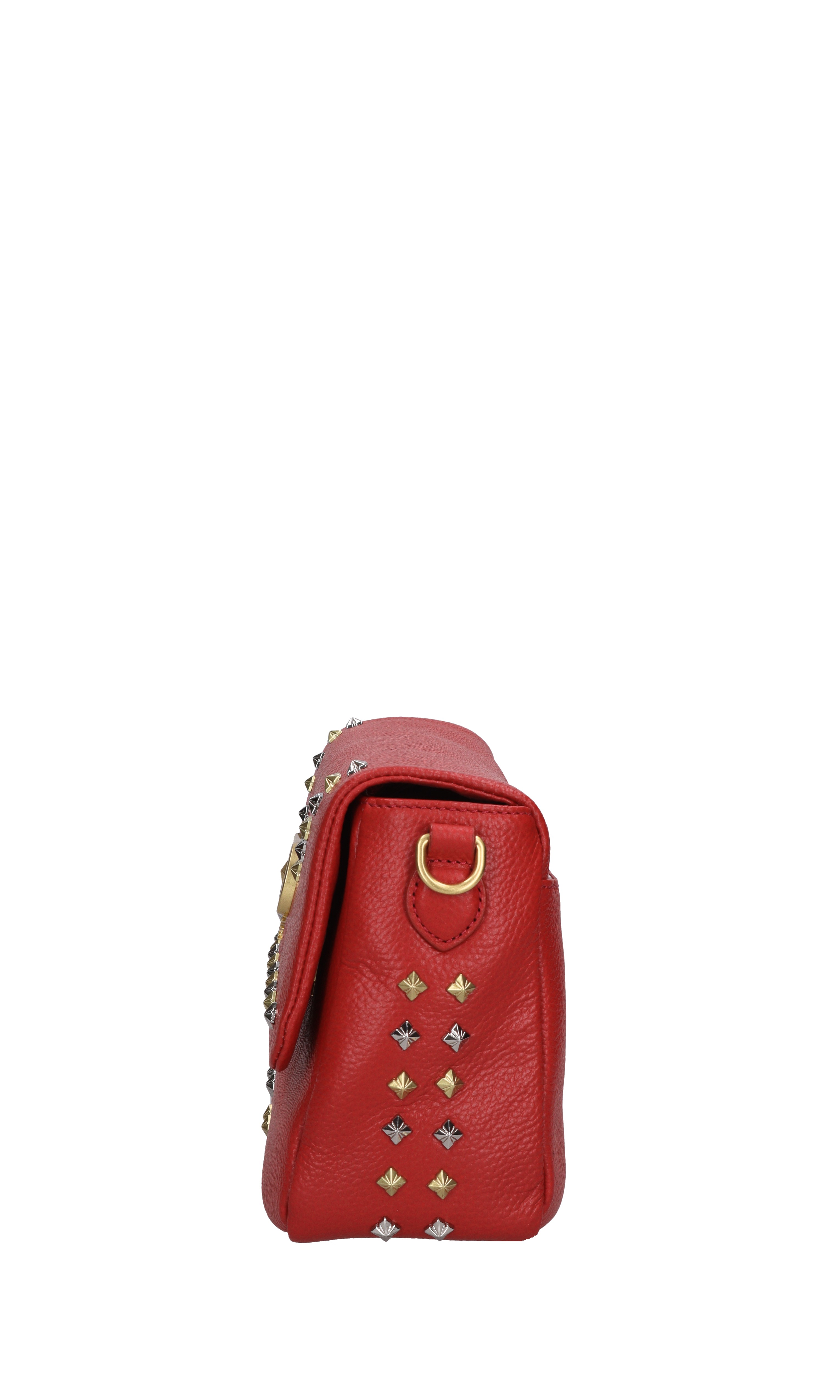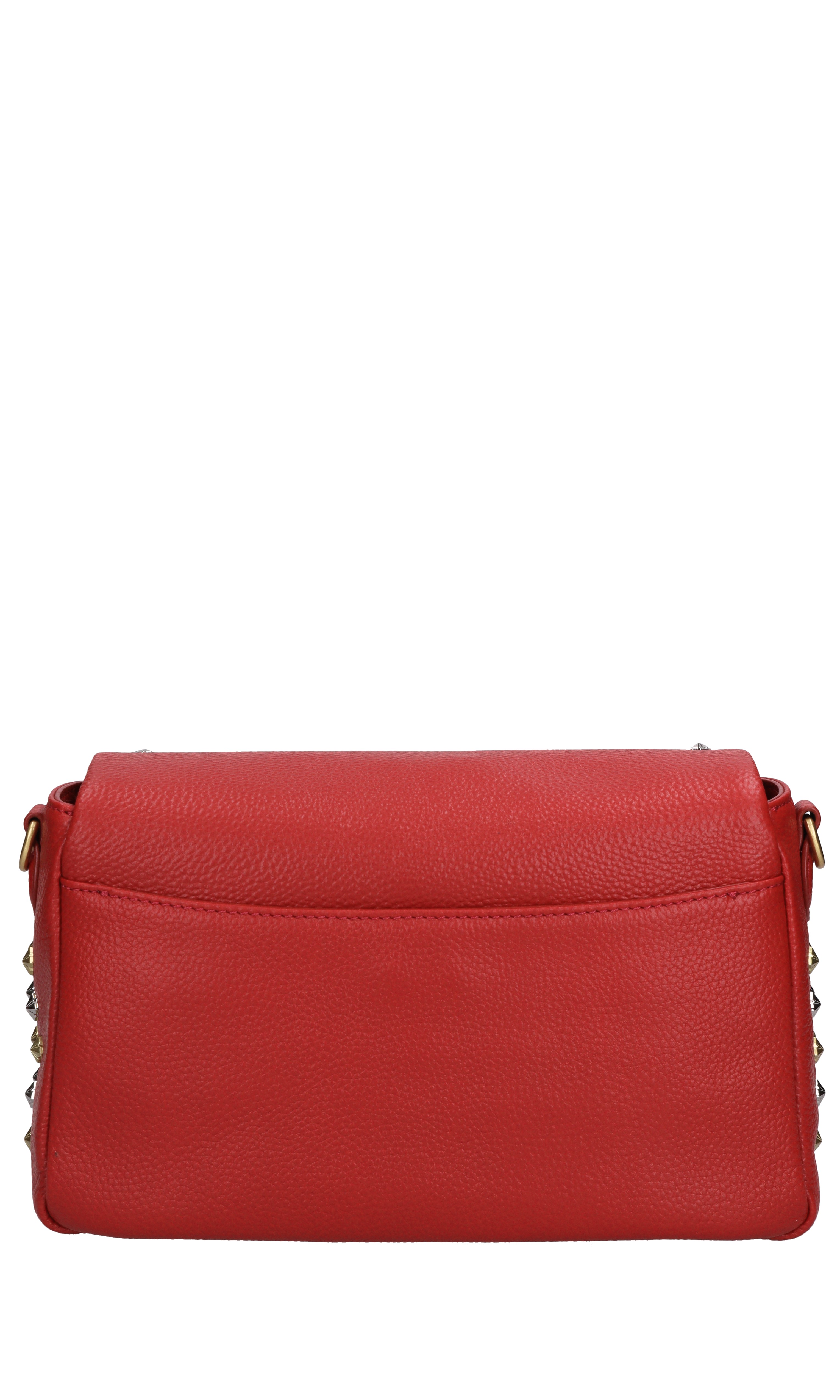 Frivolous style leather and studded bag. 1 compartment. Gold and silver studs. Flap closure with snap button. Removable leather shoulder strap.