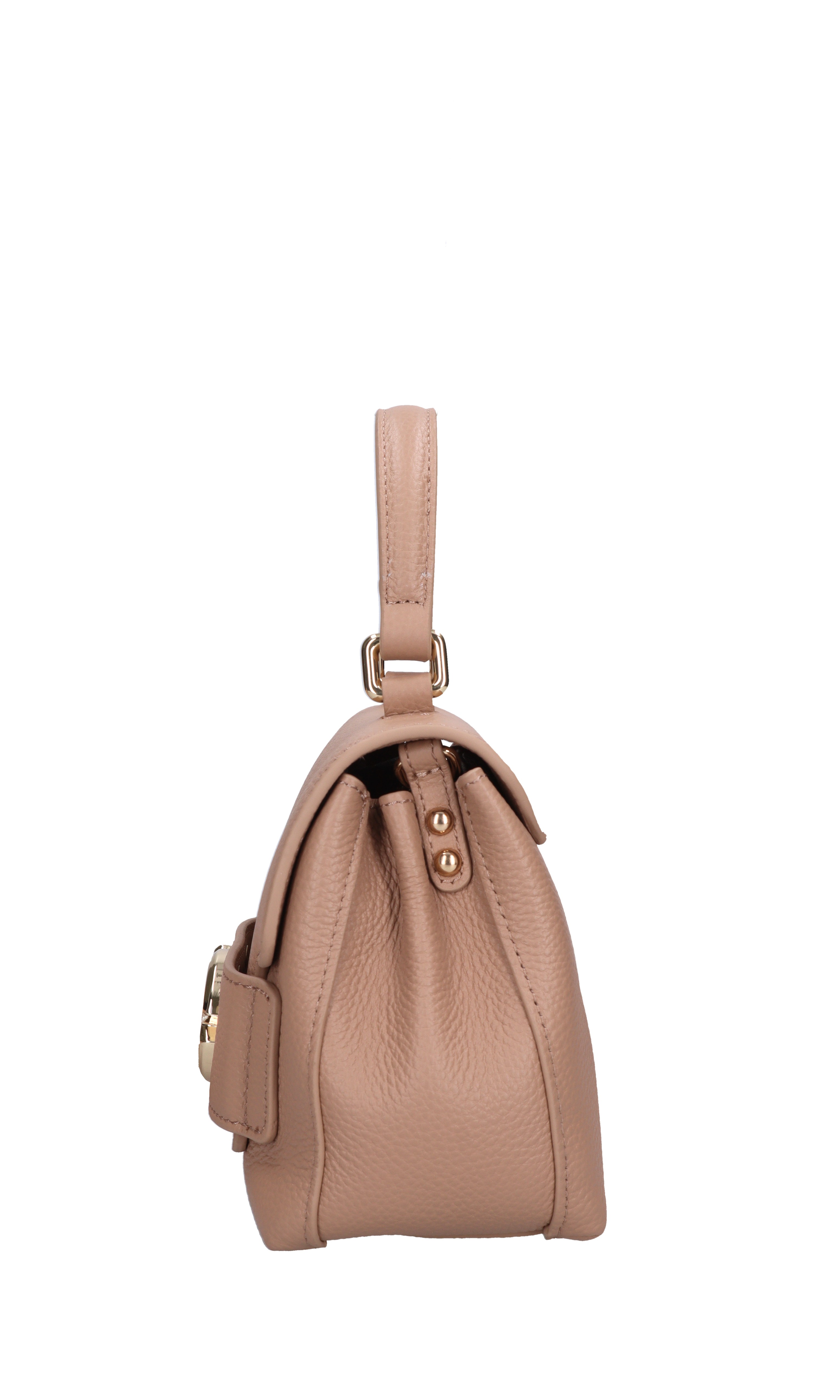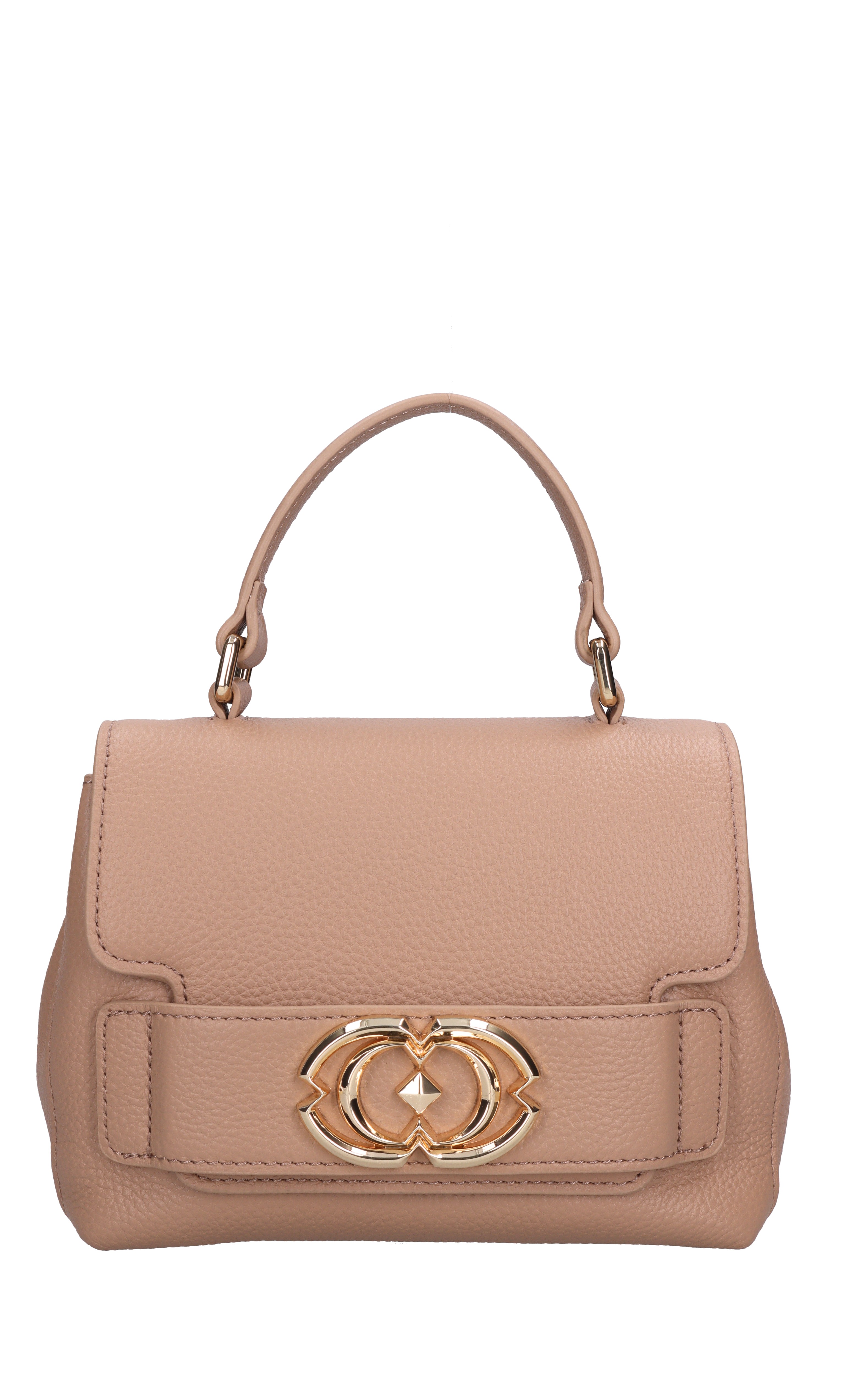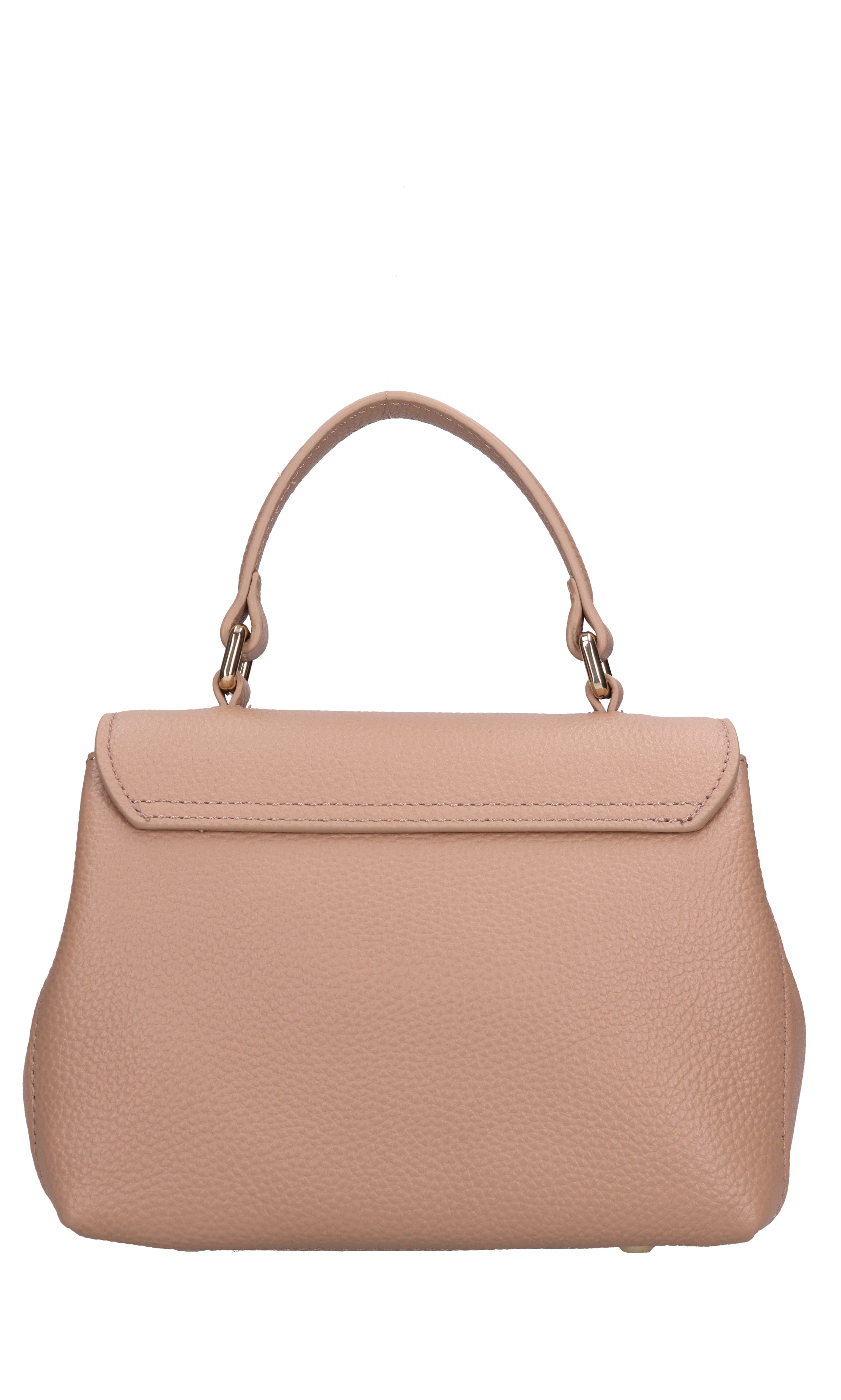 Grace Hand leather bag. 1 compartment. Flap closure with snap button. Removable golden chain and leather shoulder strap. Leather handle.