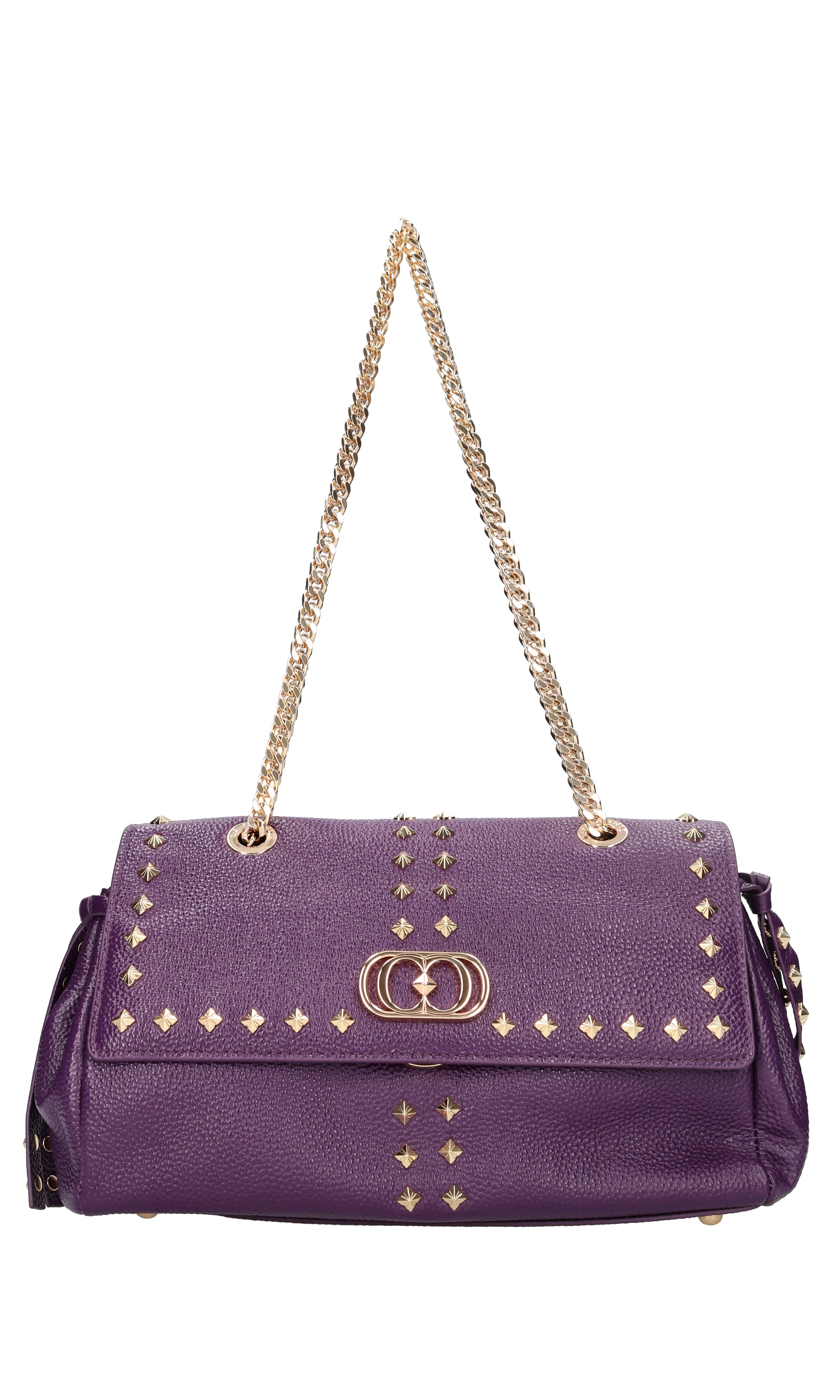 Hammered leather and studs bag. 1 compartment. Flap and hook closure. Chain shoulder strap.