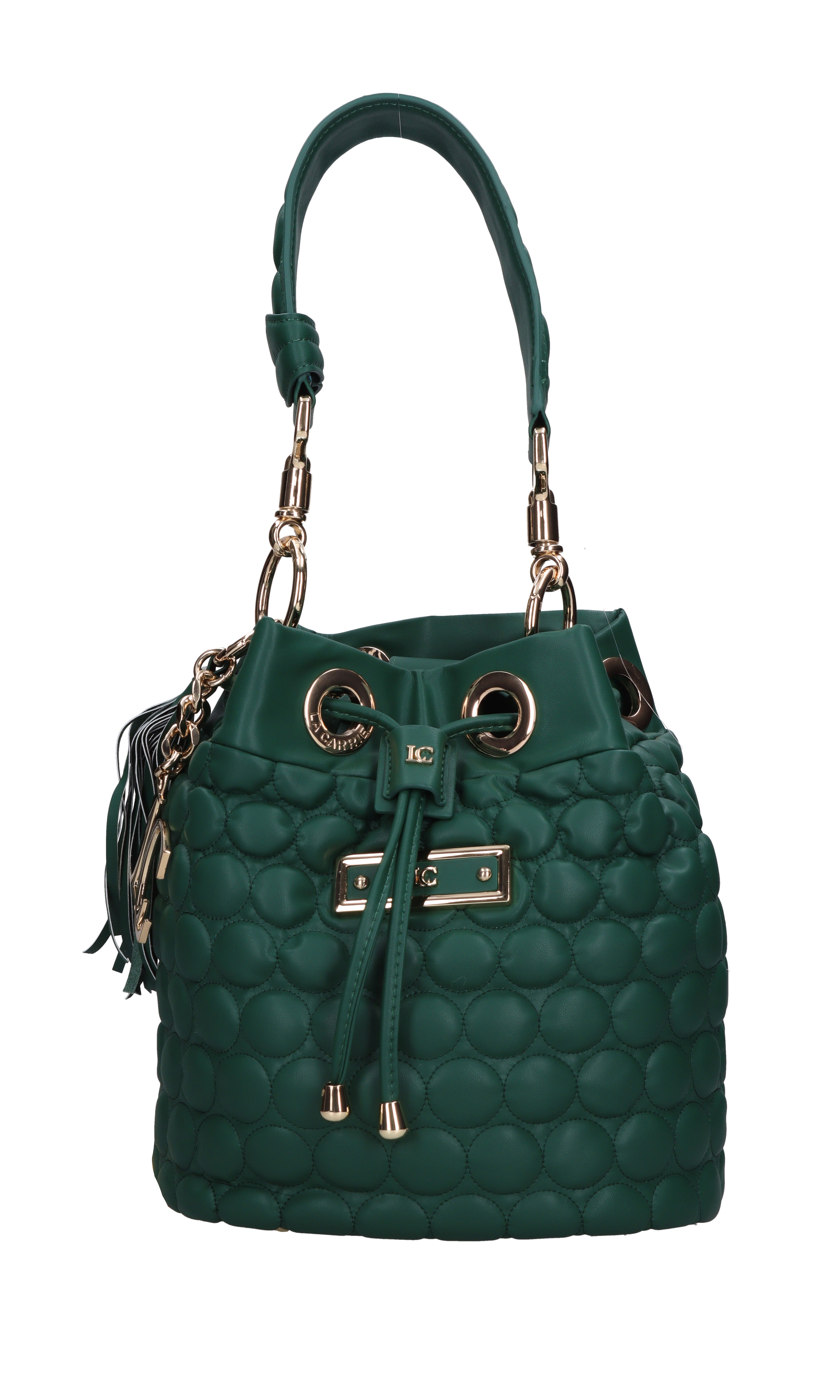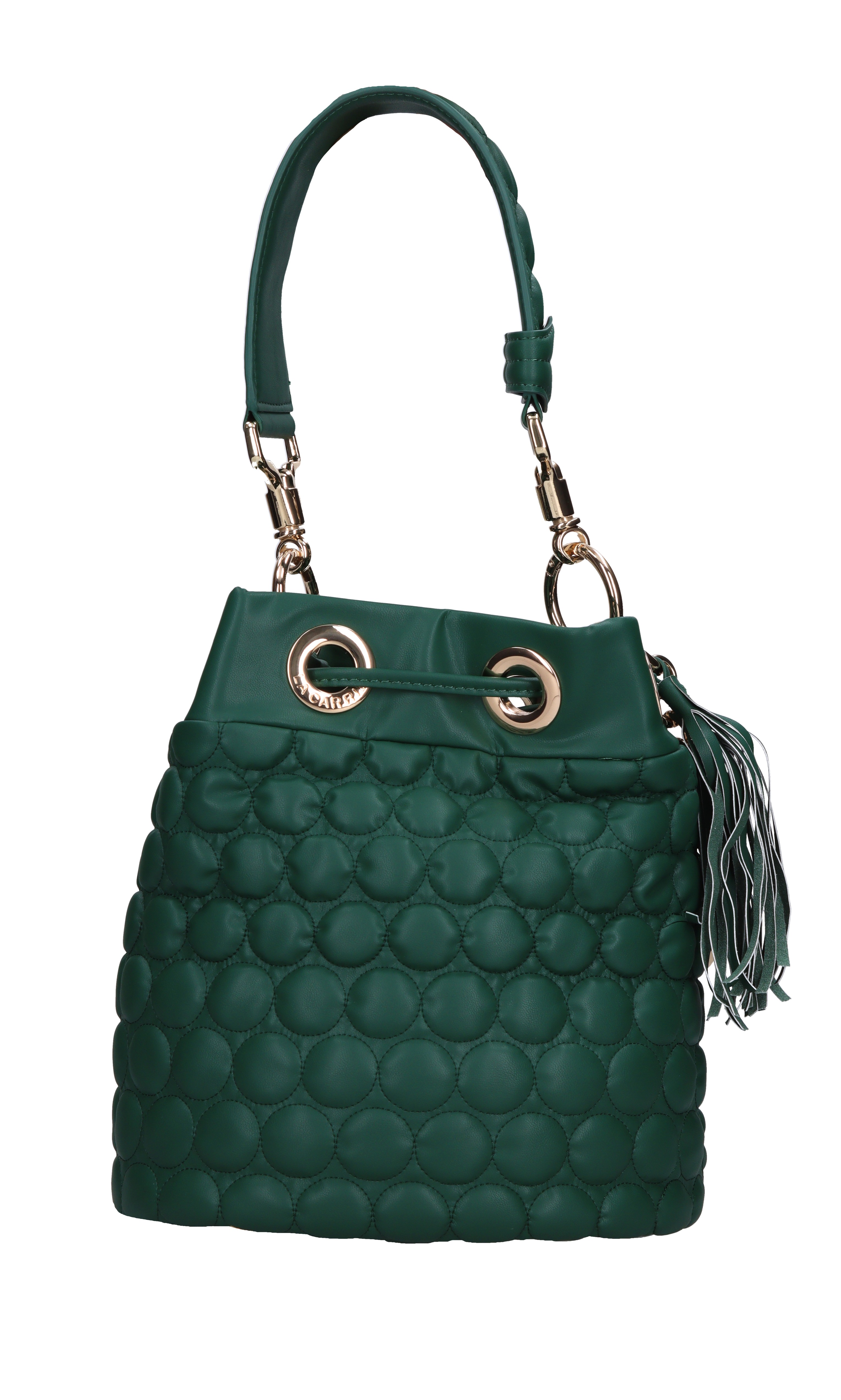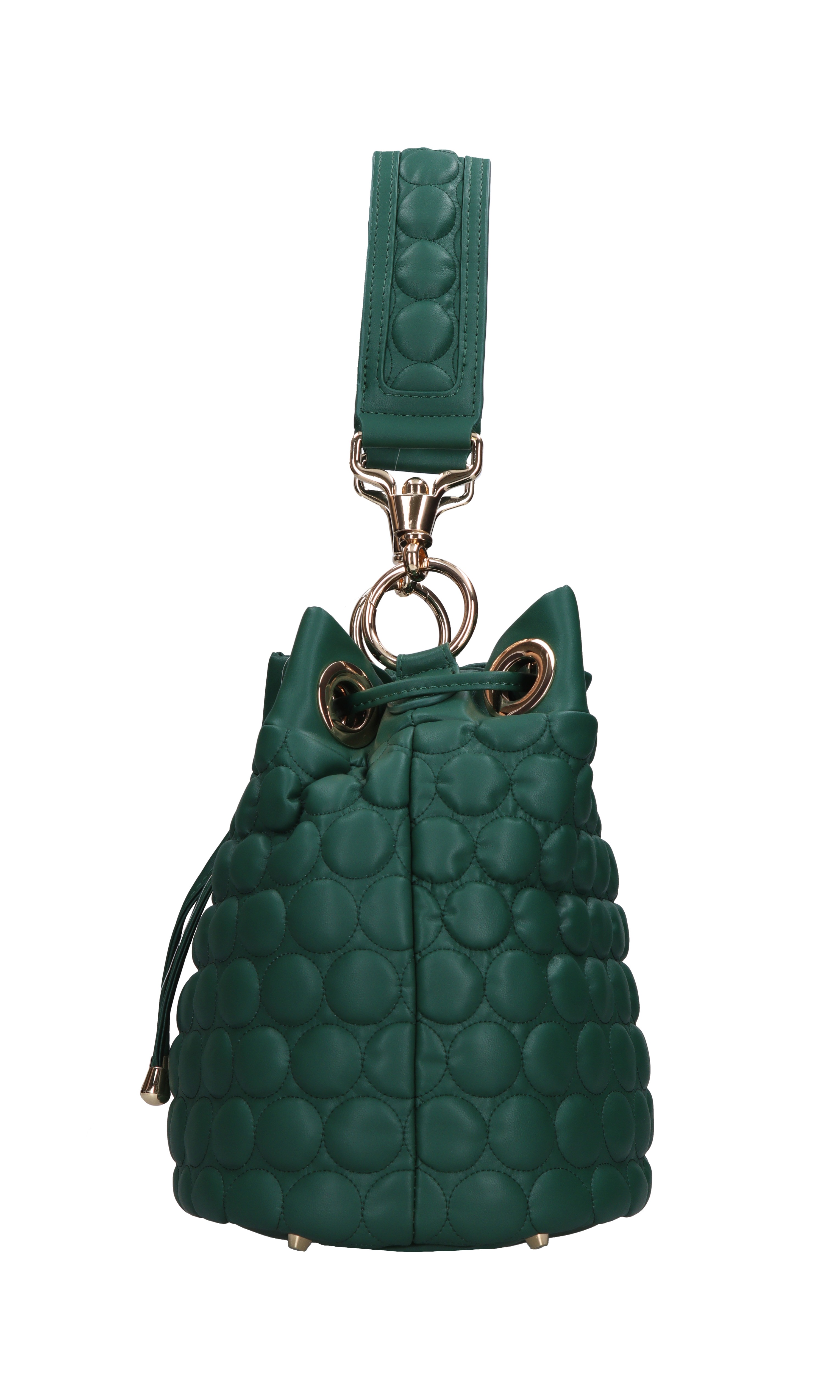 Hive Bucket bag in faux leather. 1 compartment. Drawstring closure. Removable golden chain and faux leather shoulder strap. Removable faux leather handle. Removable charm with tassel and golden chain.