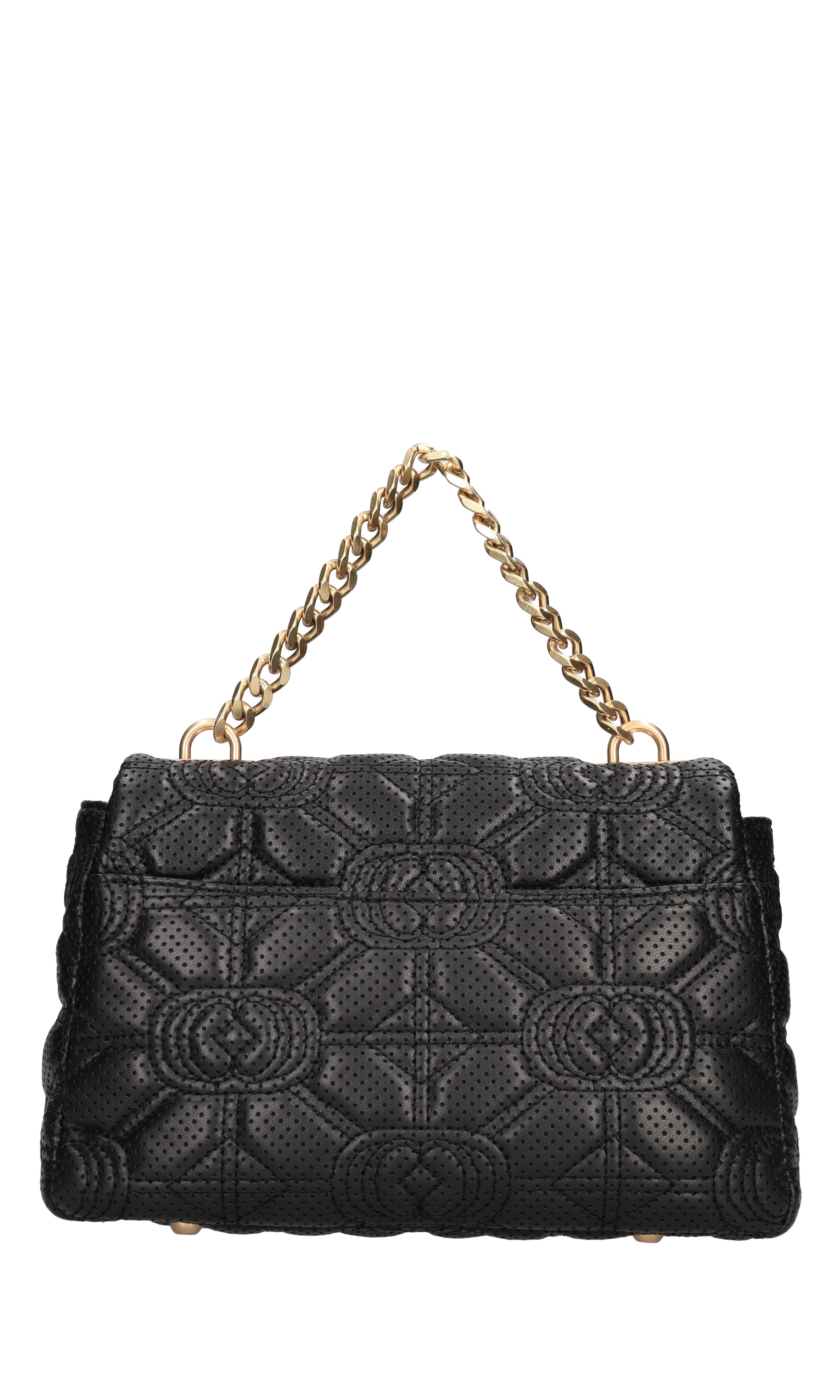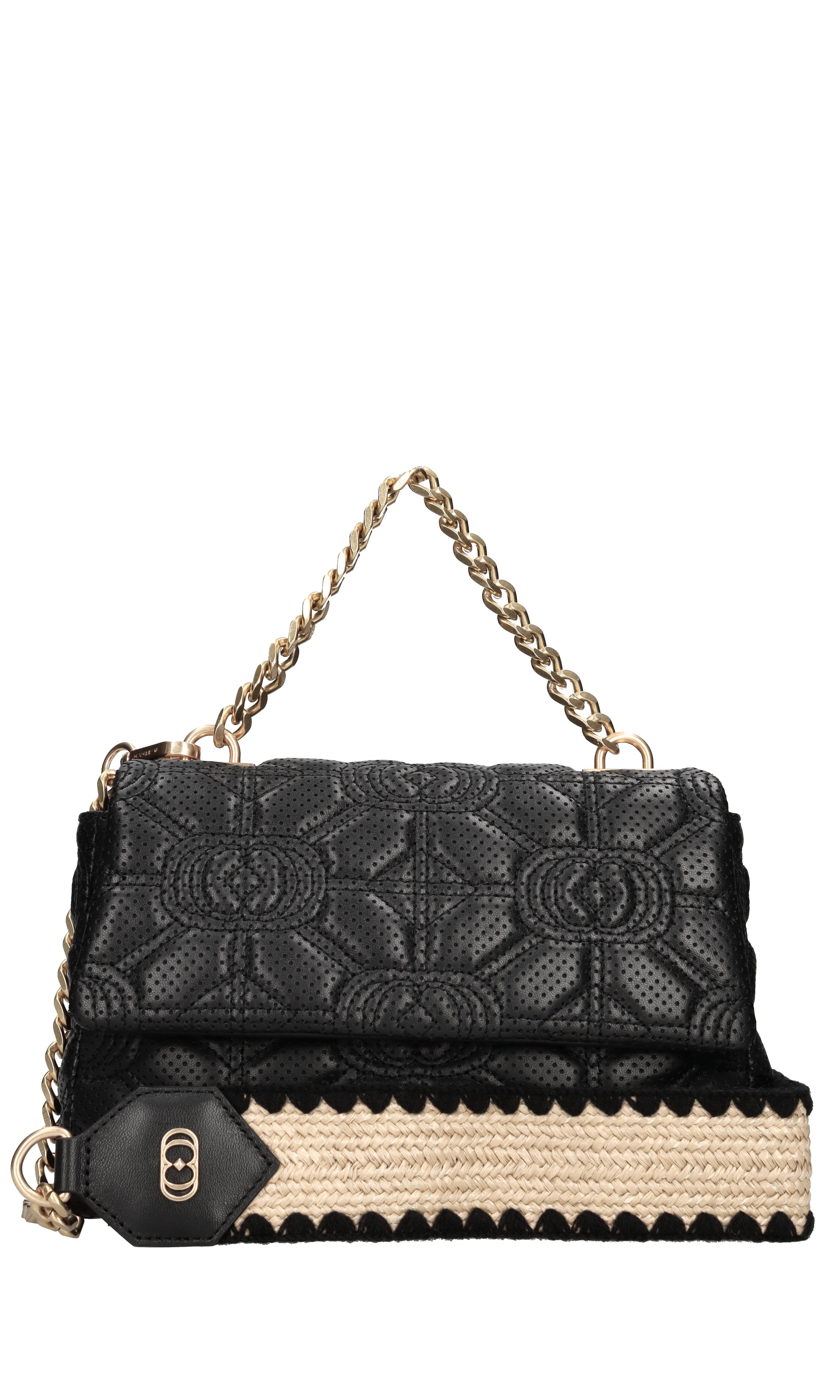Leather stich&spoon bag. 1 compartment. Flap closure with snap button. Golden chain handle. Golden chain and removable raffia shoulder strap. Shipped in a transparent envelope.