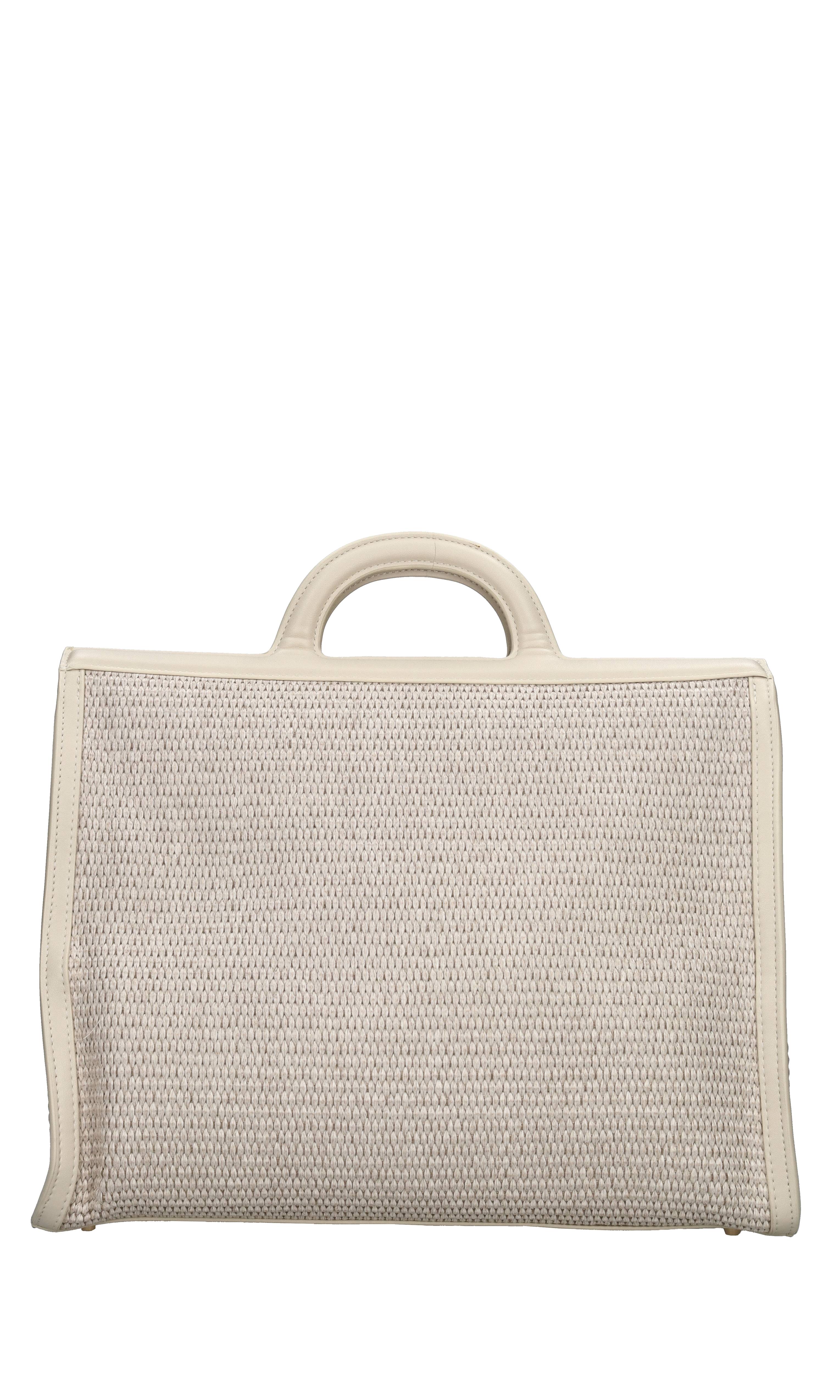 Malibu bag in raffia and eco-leather. Tone-on-tone studs applied. Magnetic button closure. One compartment. Removable golden chain shoulder strap in eco-leather.