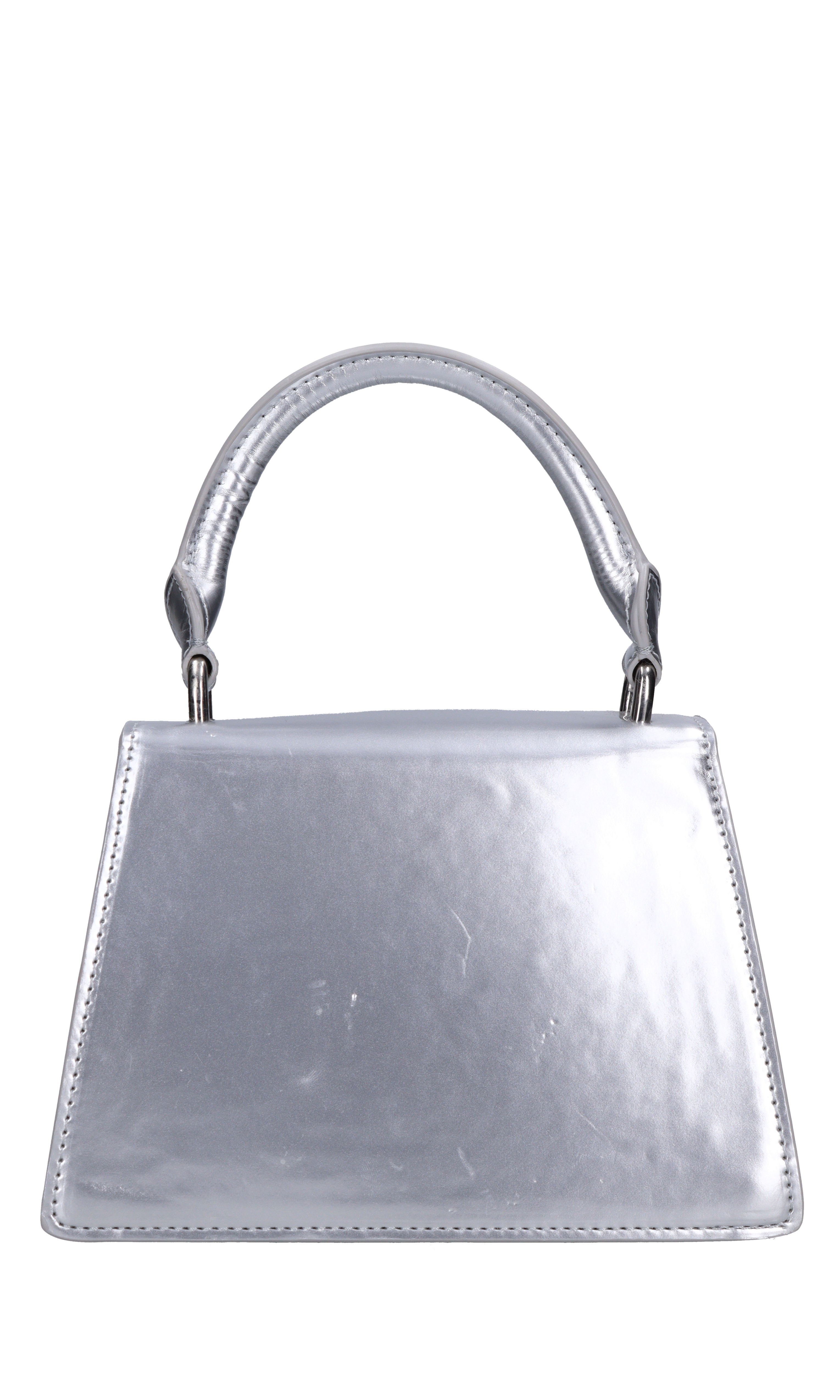 Night bag in faux leather. 1 compartment. Flap closure with snap button. Removable silver chain shoulder strap. Imperfections on the leather.