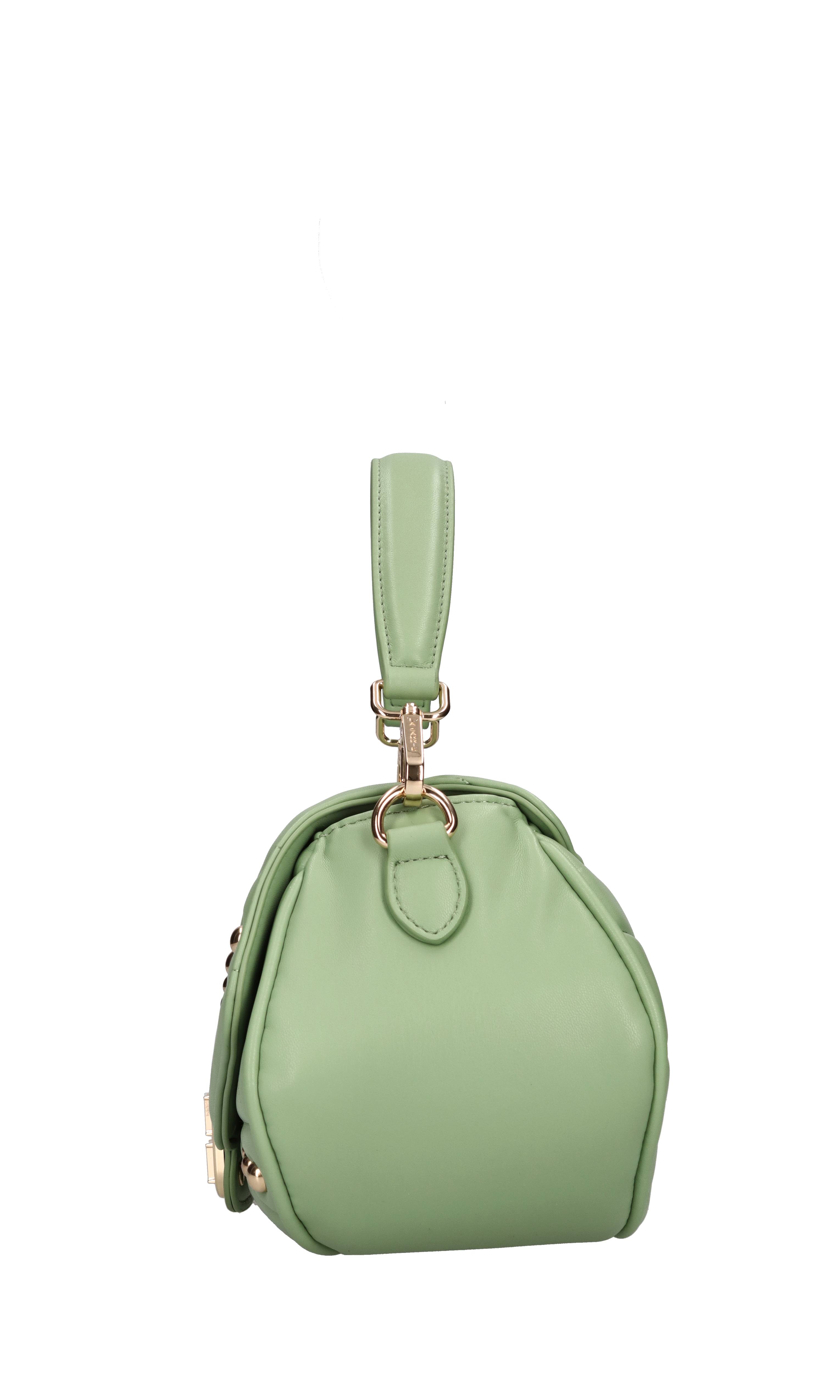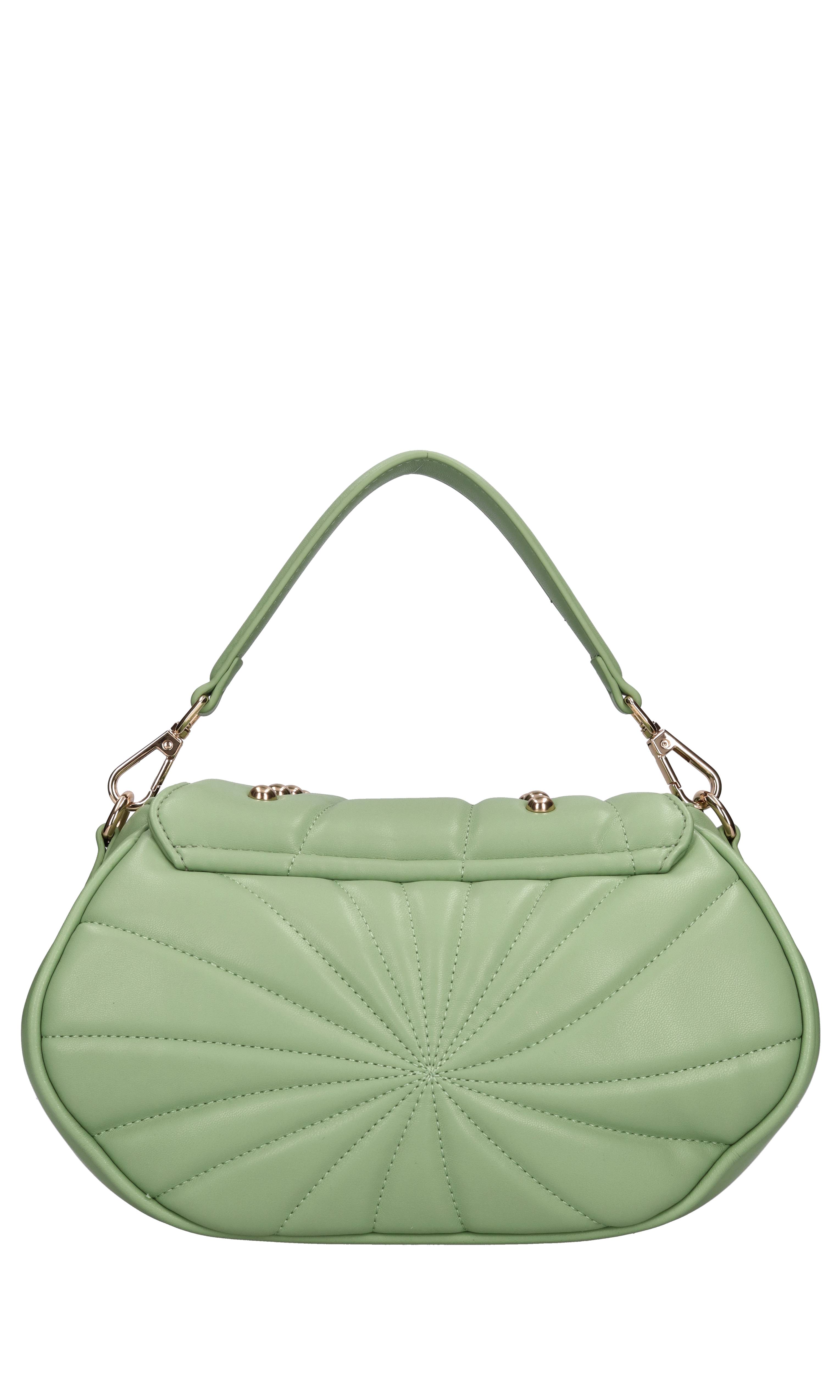 Oyster bag in eco-leather. 1 compartment. Flap closure with snap button. Removable eco-leather handle. Removable golden chain and eco-leather shoulder strap.