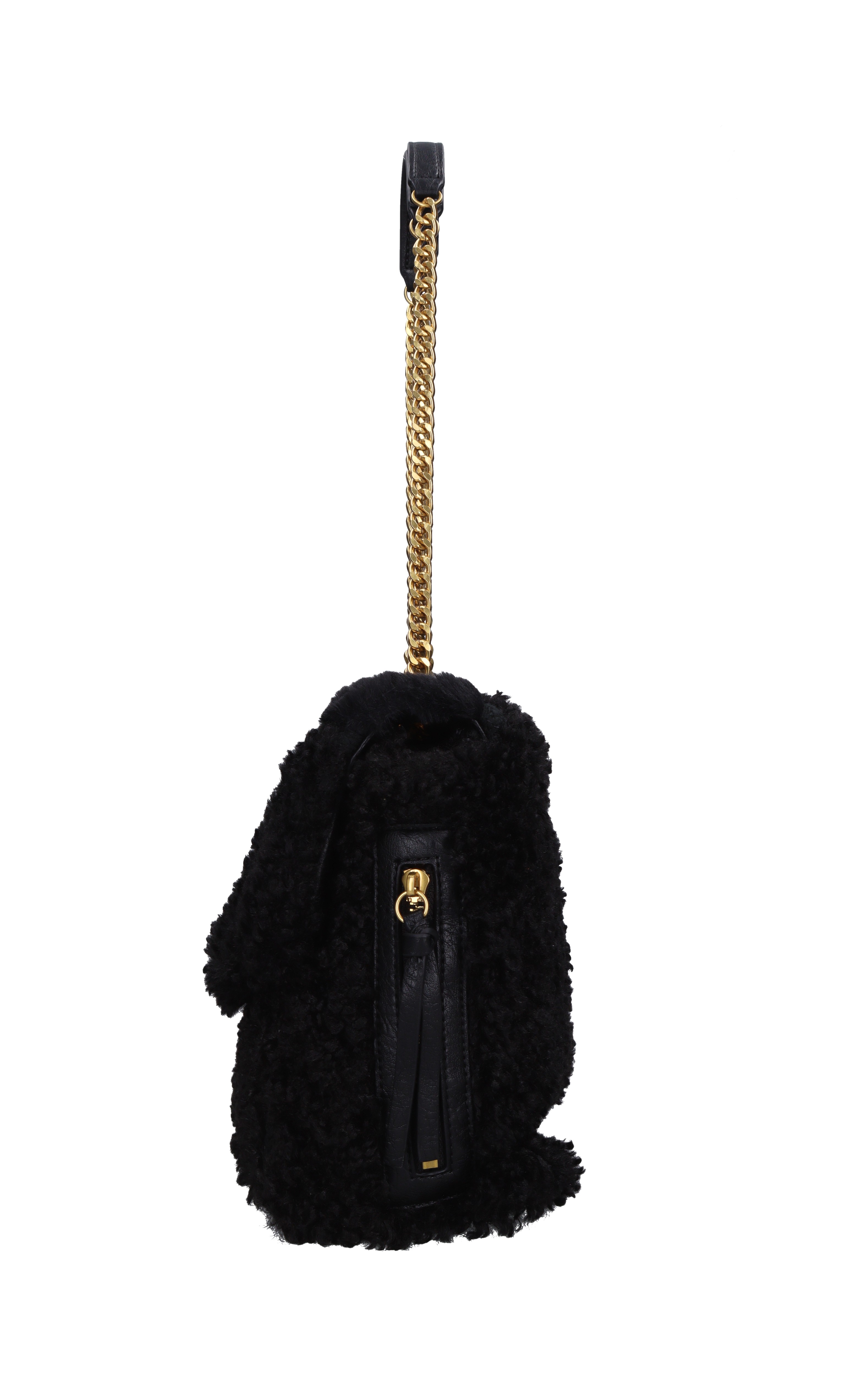 Space Sheep bag in faux fur. One compartment. Flap and snap closure. Extendable golden chain and faux leather handle.