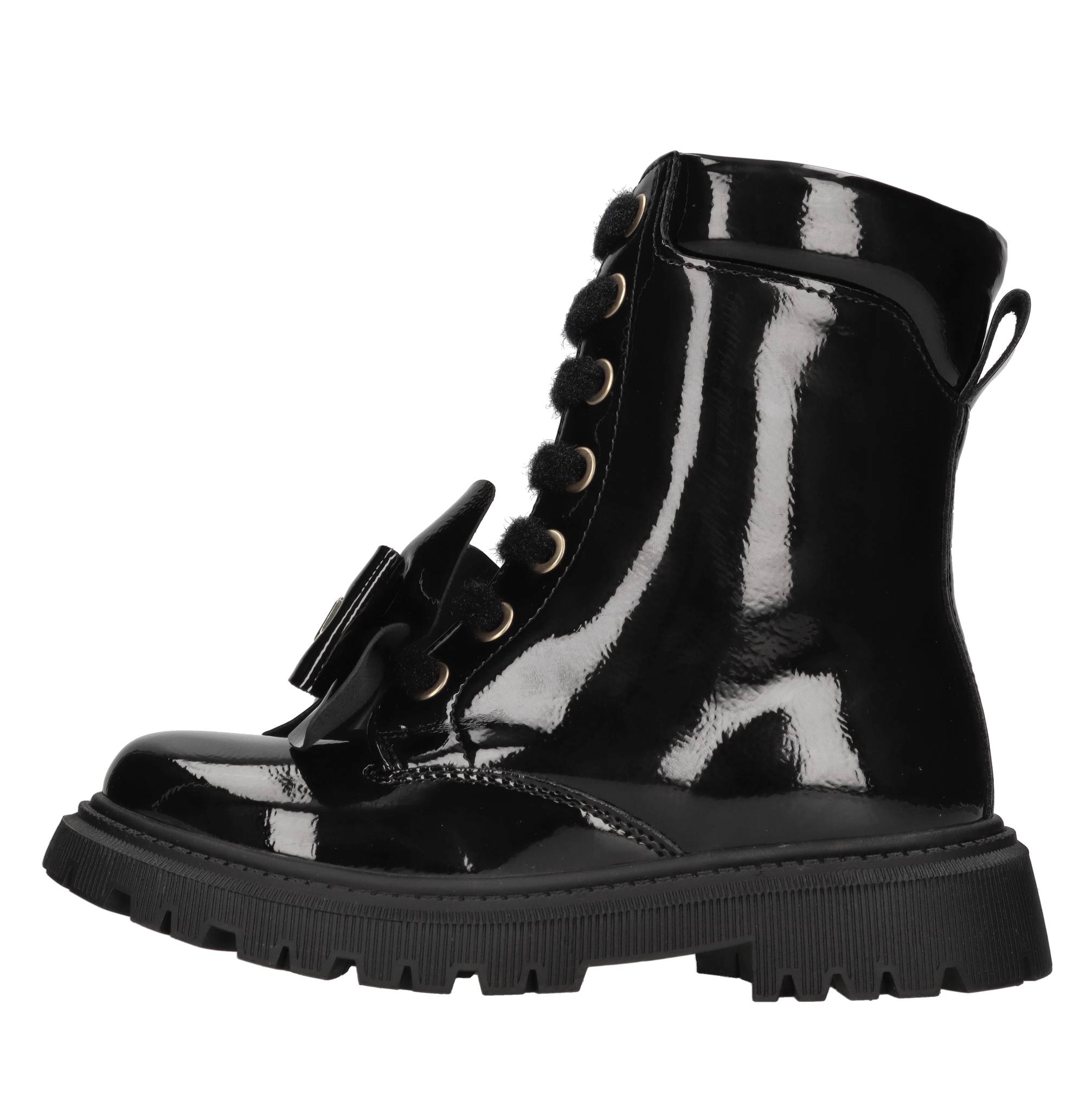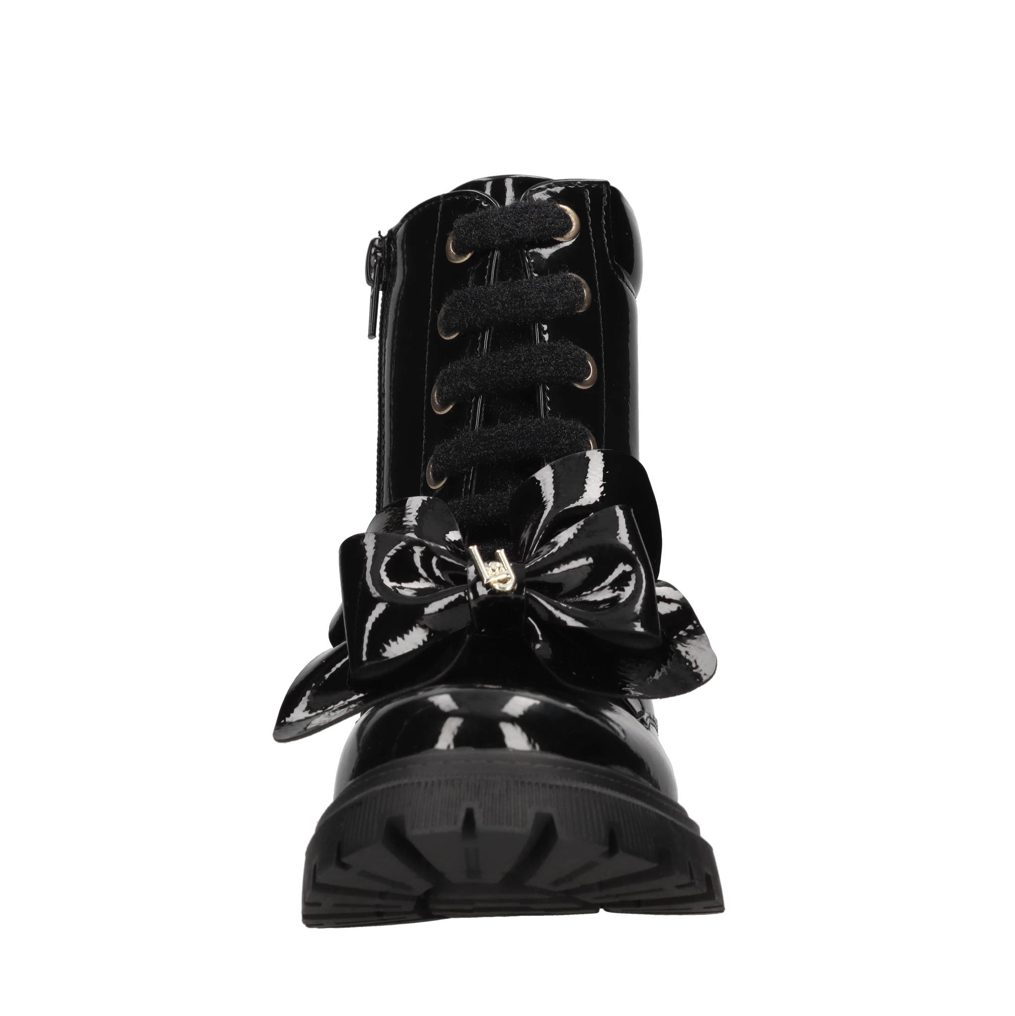 Leather ankle boots. Decorative bow. Faux leather and fabric upper. Rubber outsole.