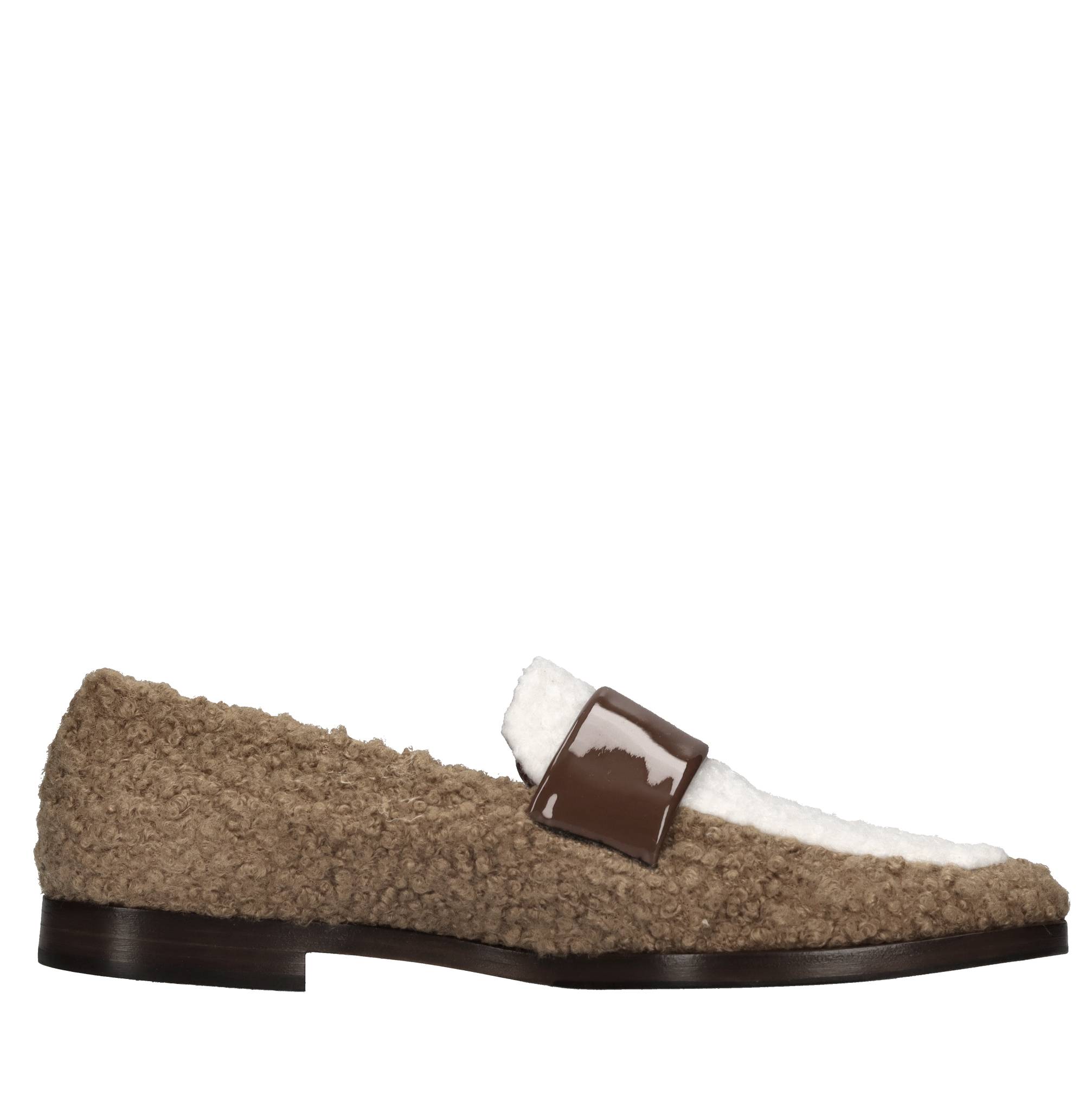 Faux fur and leather loafers. Leather upper. Leather and rubber outsole.