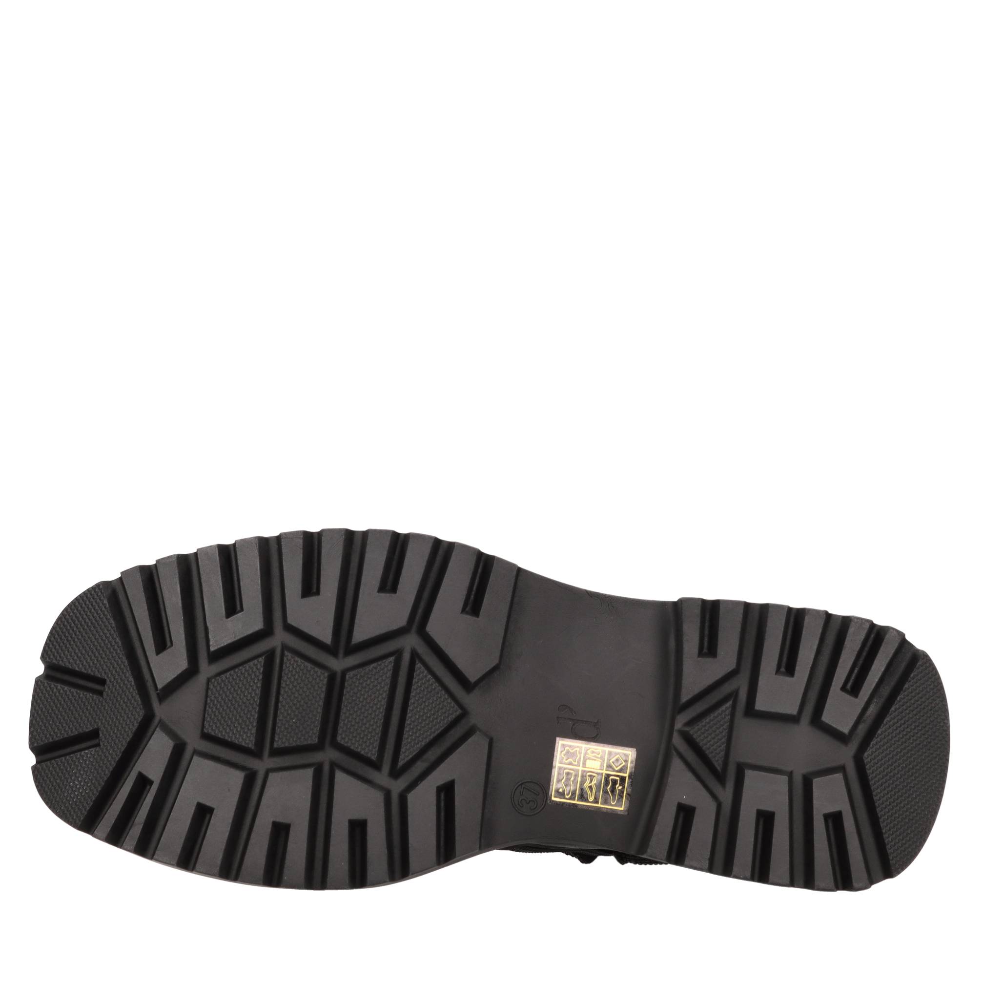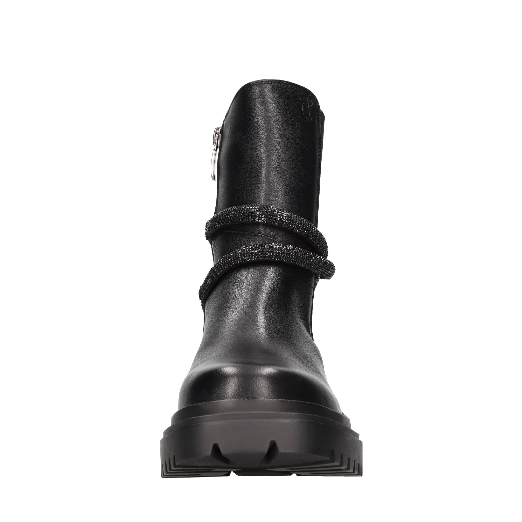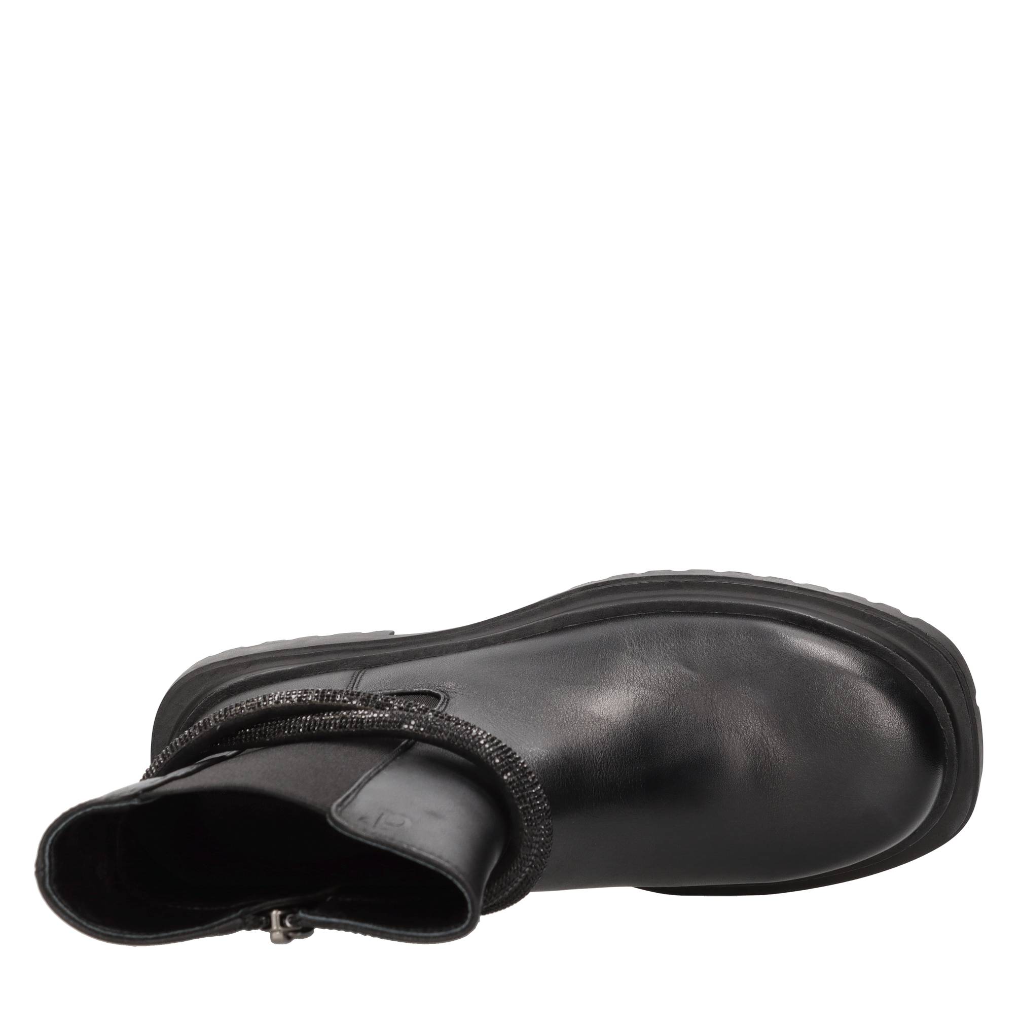 Leather beatles boots. Leather and fabric inner upper. Rubber outsole. Rhinestone accessory.